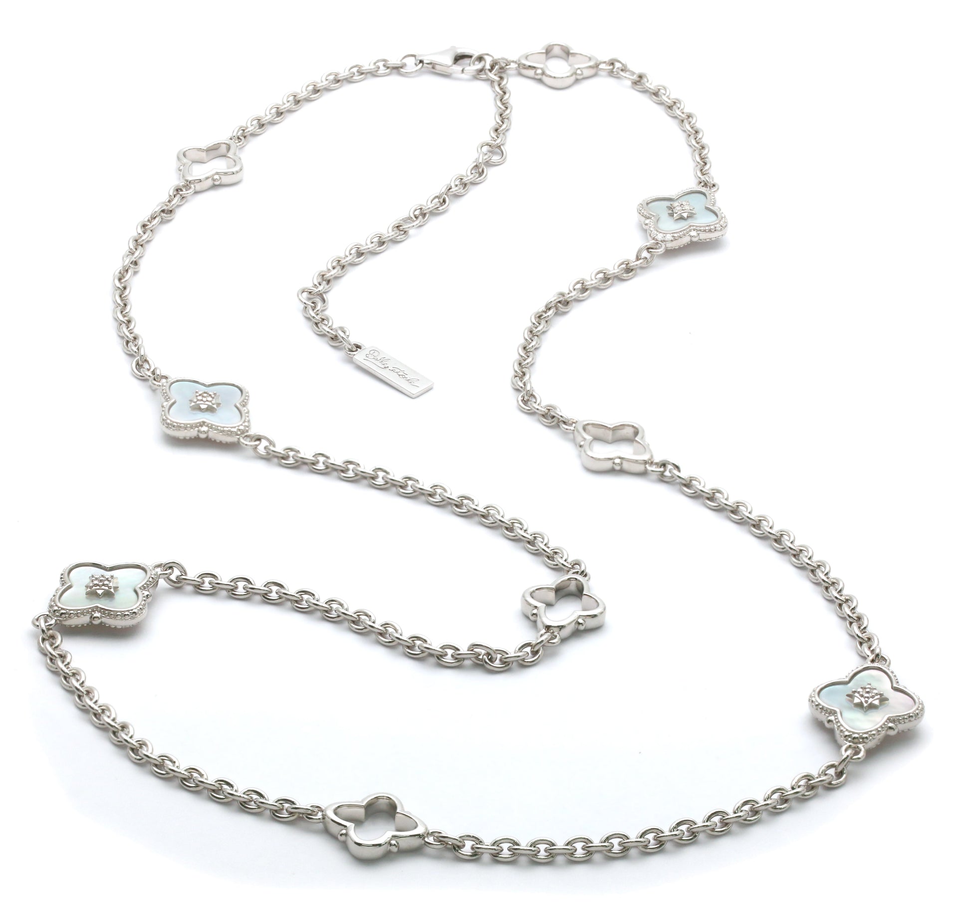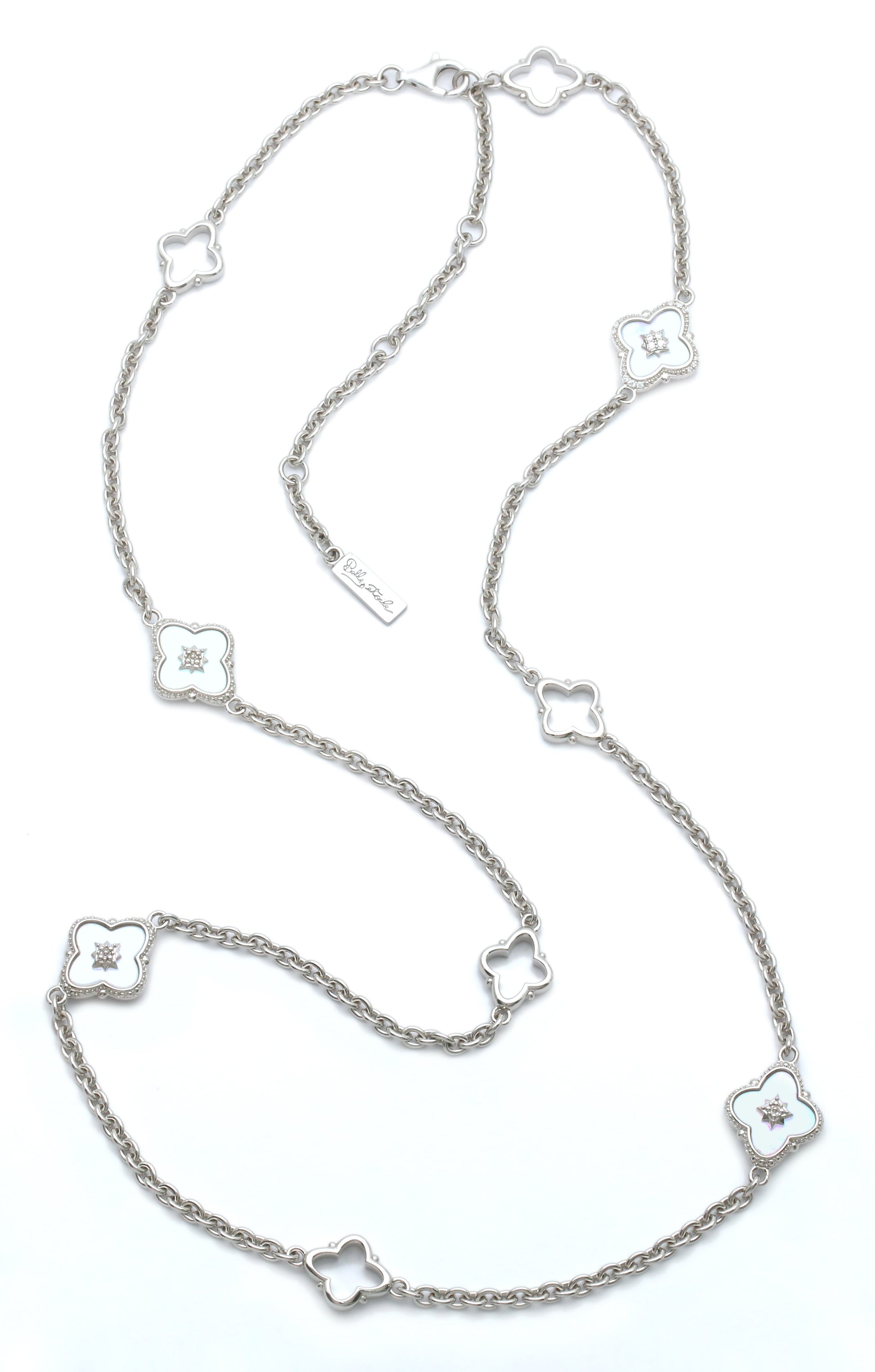 Materials: Genuine white mother-of-pearl and accent stones set into platinum-plated, hypoallergenic sterling silver