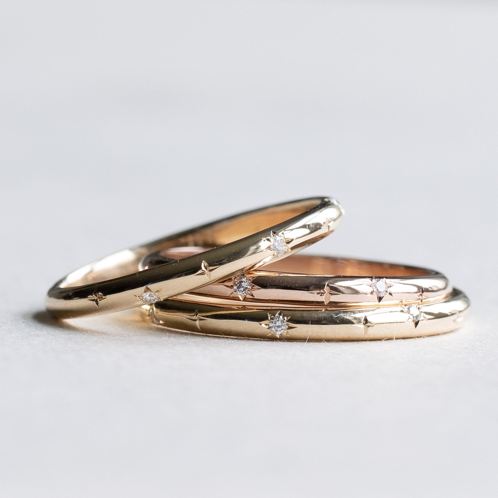 An etched melee diamond starburst on this 14k yellow or rose gold band