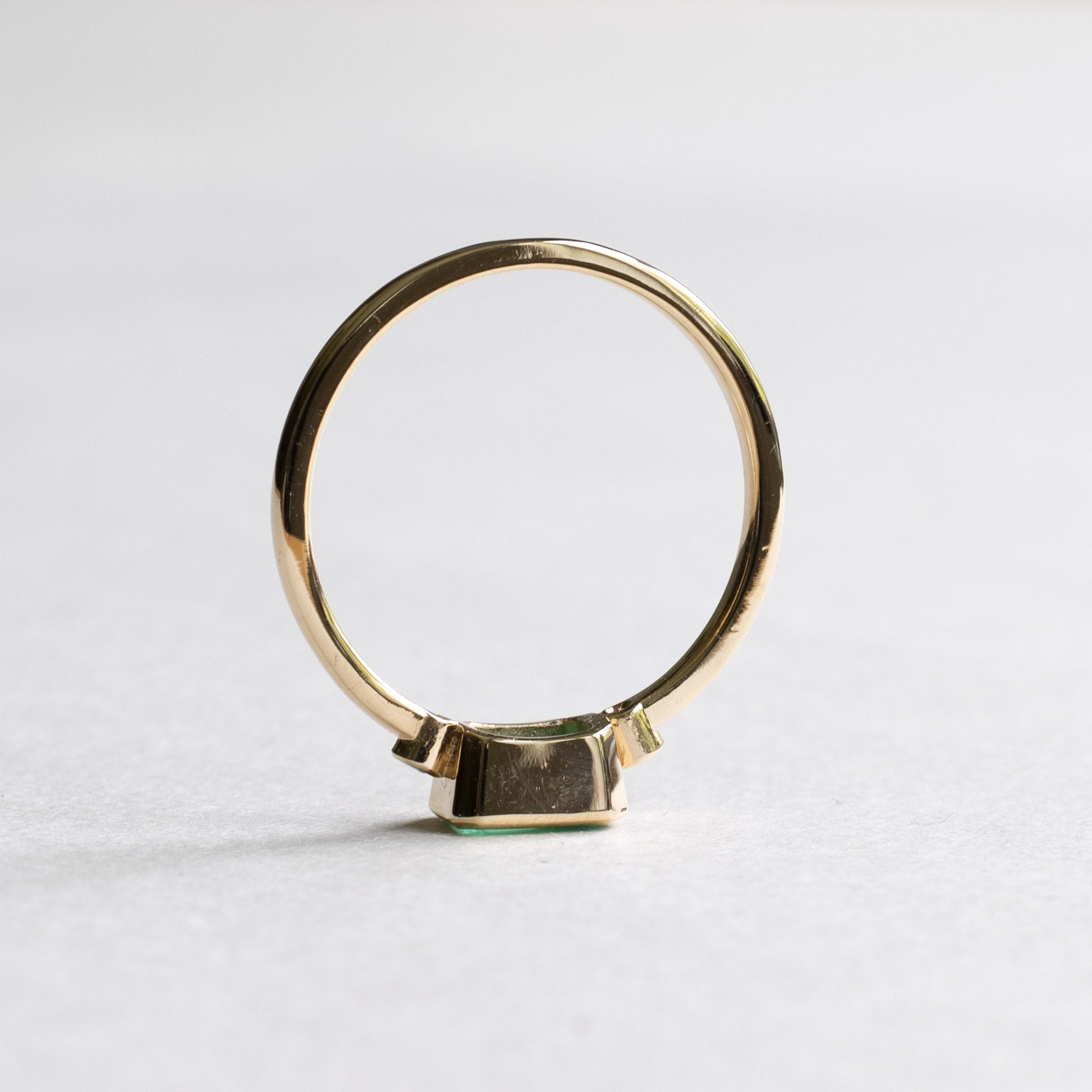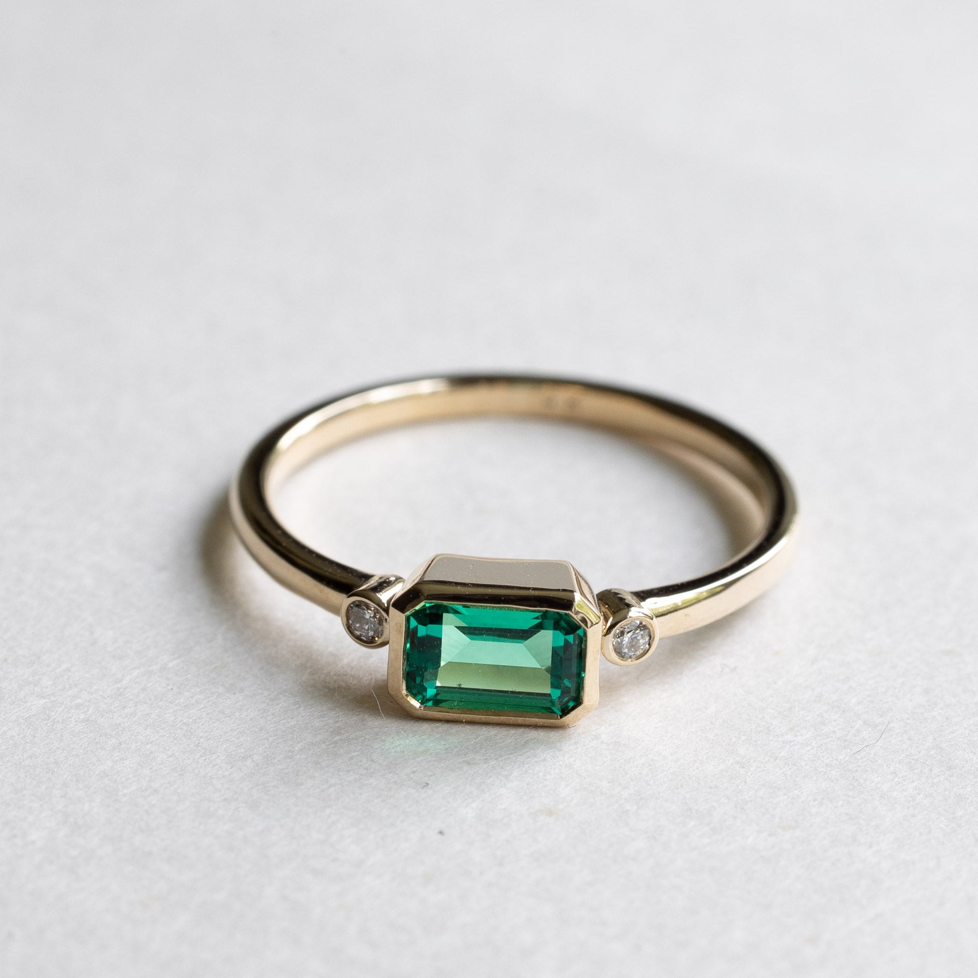 East west emerald stone bezel with diamonds set on 14k yellow gold.
