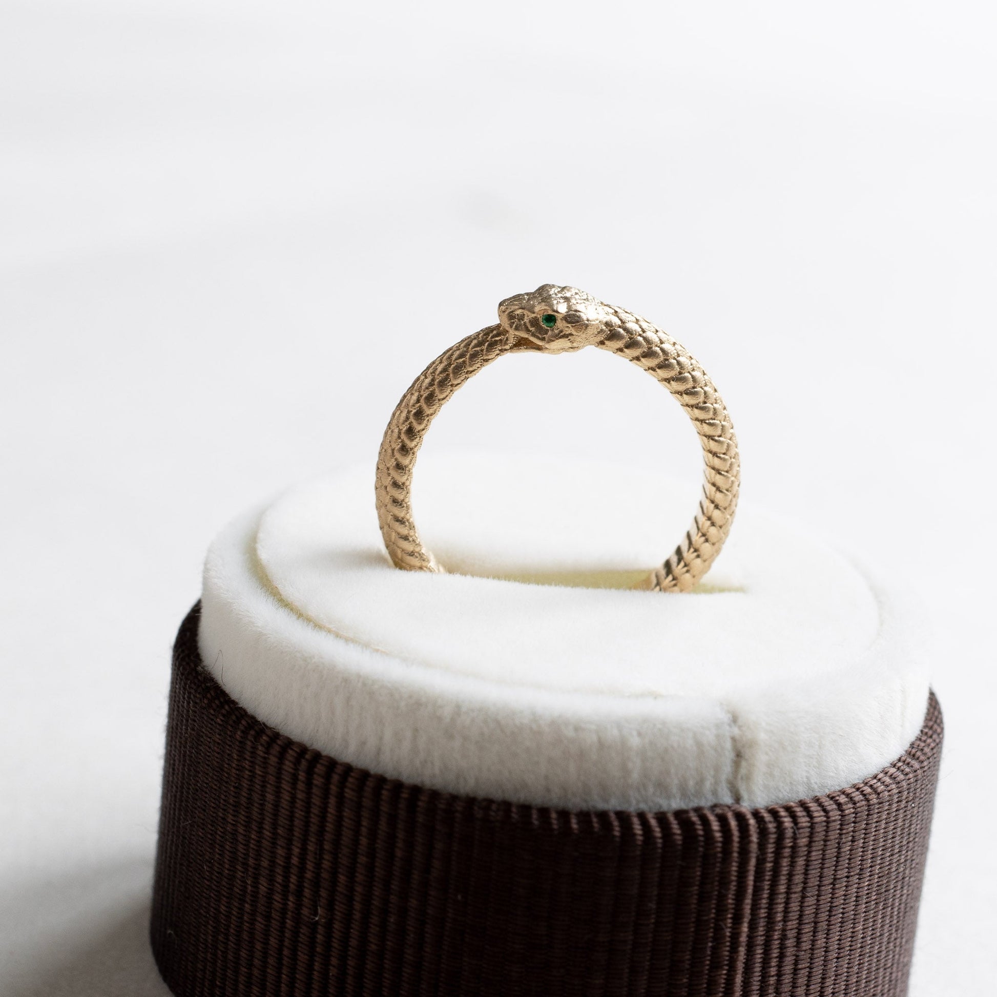 Snake ouroboros ring in 14k yellow gold with emerald eyes
