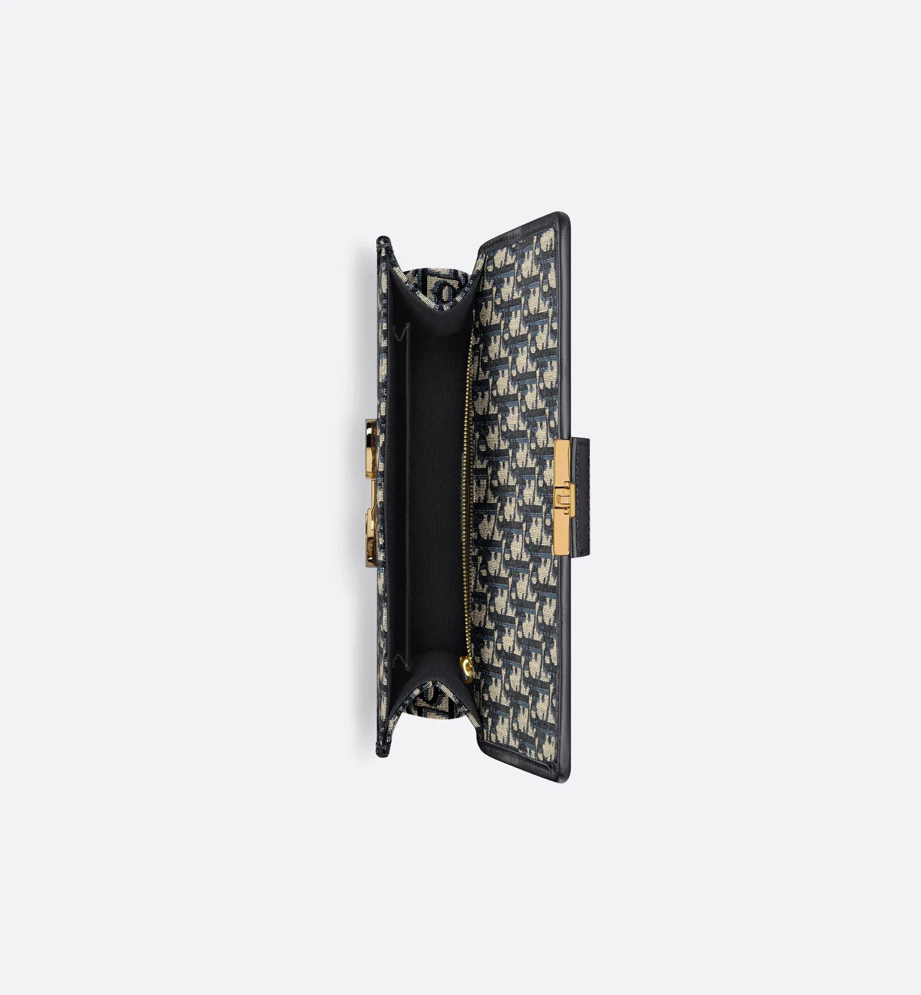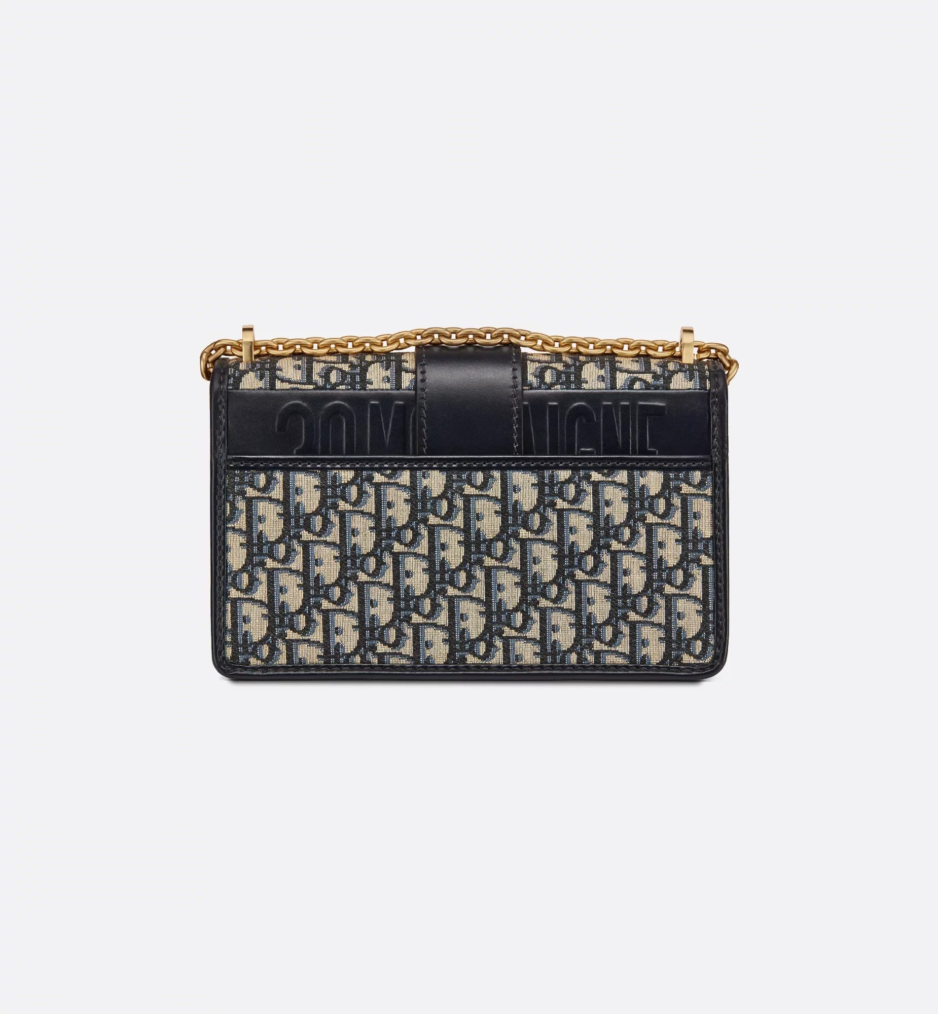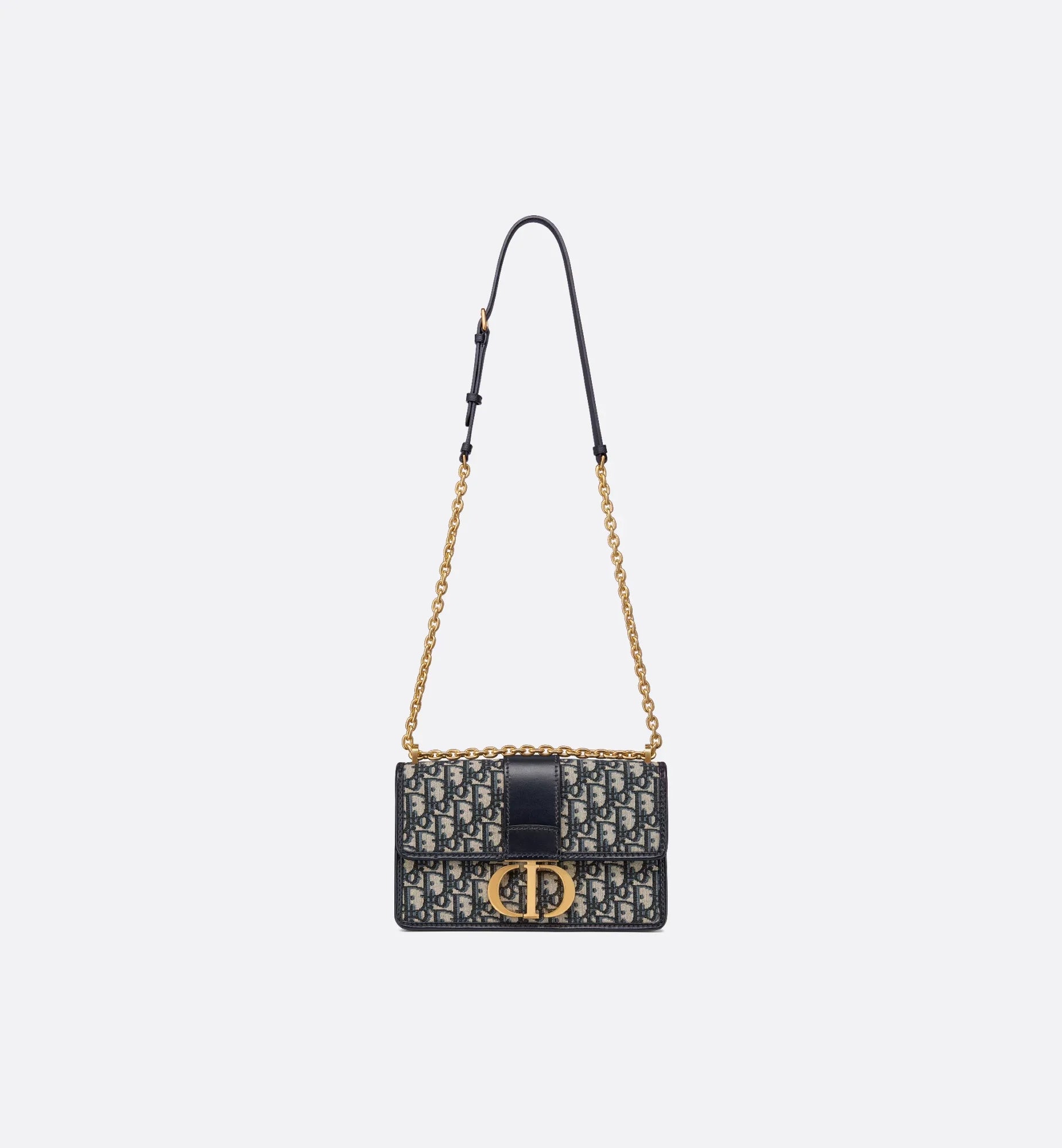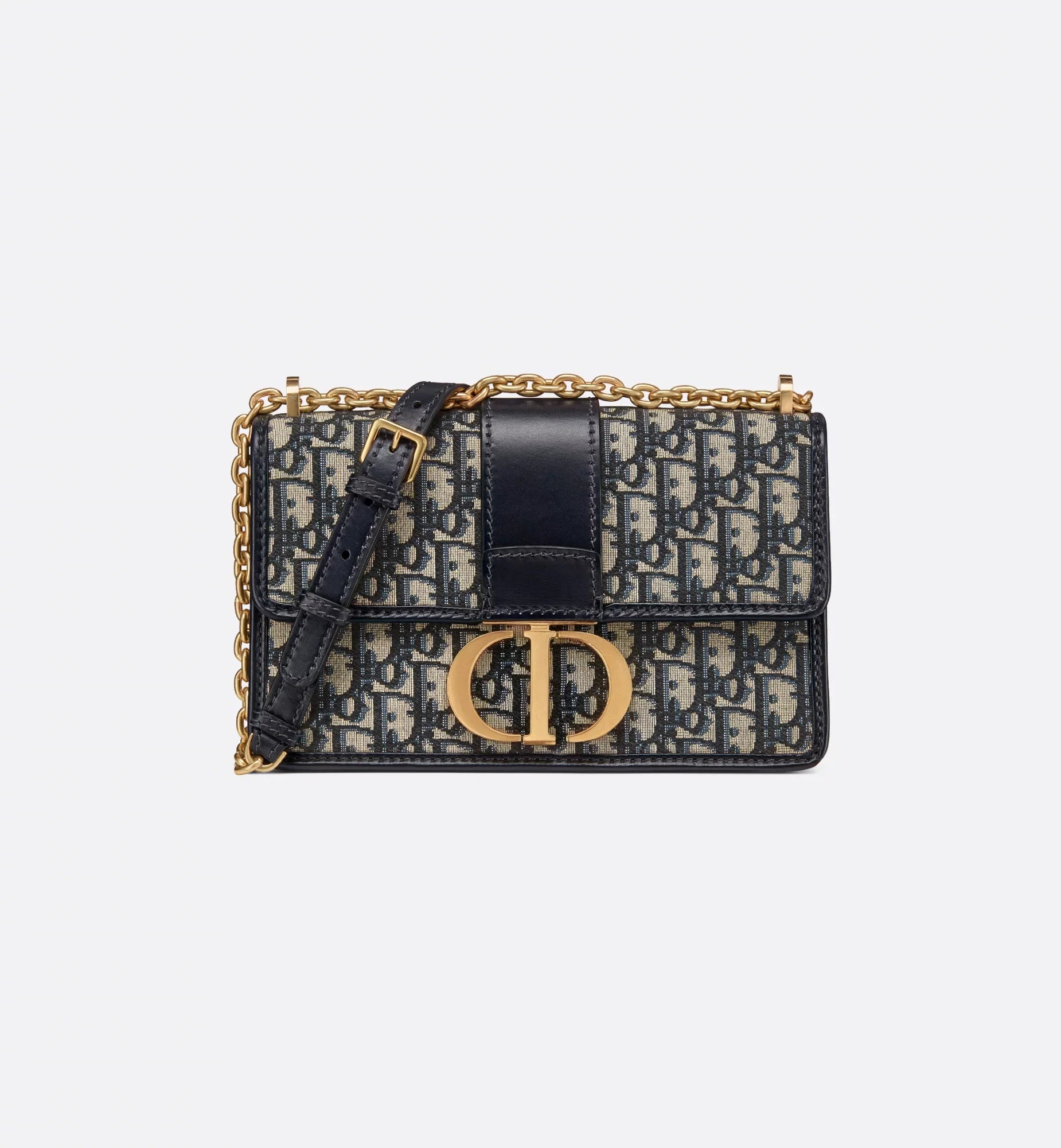 The 30 Montaigne line, inspired by the hallmark address, offers essential pieces that embody the House's iconic codes. The bag is crafted in blue jacquard and highlights the House's classic Dior Oblique motif for an elegant and modern design. The flap has an antique gold-finish metal CD clasp, inspired by the seal of a Christian Dior perfume bottle. Other details, like the embossed 30 Montaigne signature at the back, accent the streamlined design. Thanks to the chain strap, the bag can be carried by hand, worn over the shoulder or crossbody.