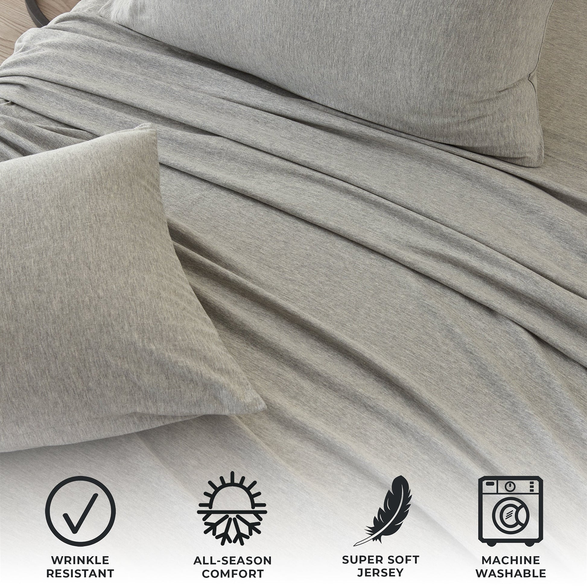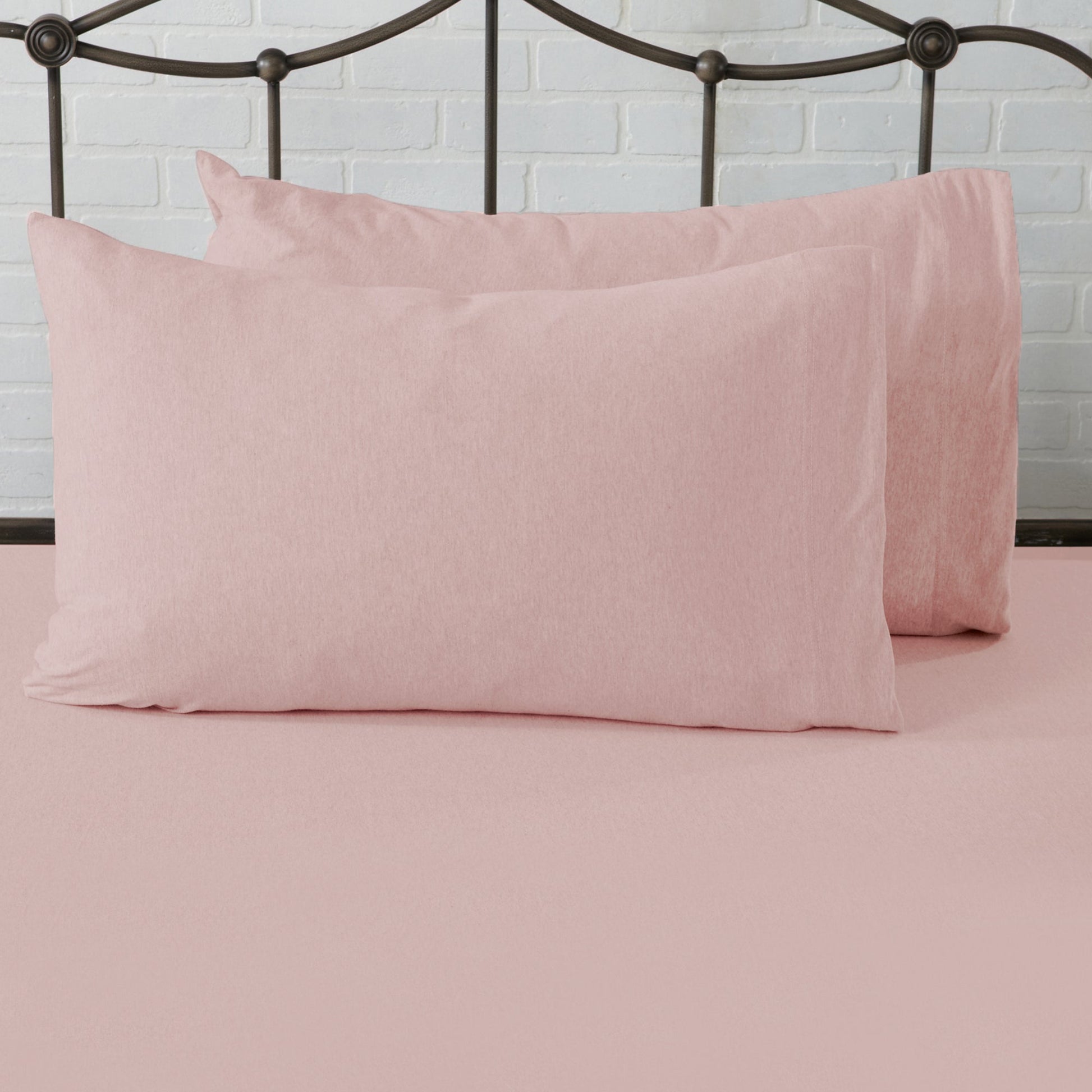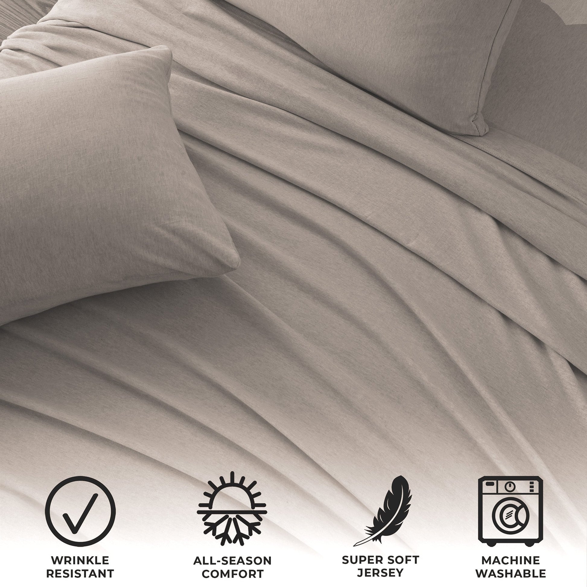 Wrap yourself in comfort with our heathered jersey knit sheets—just like your favorite worn-in T-shirt, but for your bed. Made from a soft and breathable cotton polyester blend, these sheets get even cozier with every wash. They naturally adapt to the seasons, keeping you cool when it’s warm and warm when it’s cool. The heathered melange finish adds a laid-back, effortlessly stylish touch to your space, while the slight stretch ensures a perfect, snug fit on your mattress. Easygoing, ultra-soft, and always inviting—these are the sheets you’ll never want to leave.