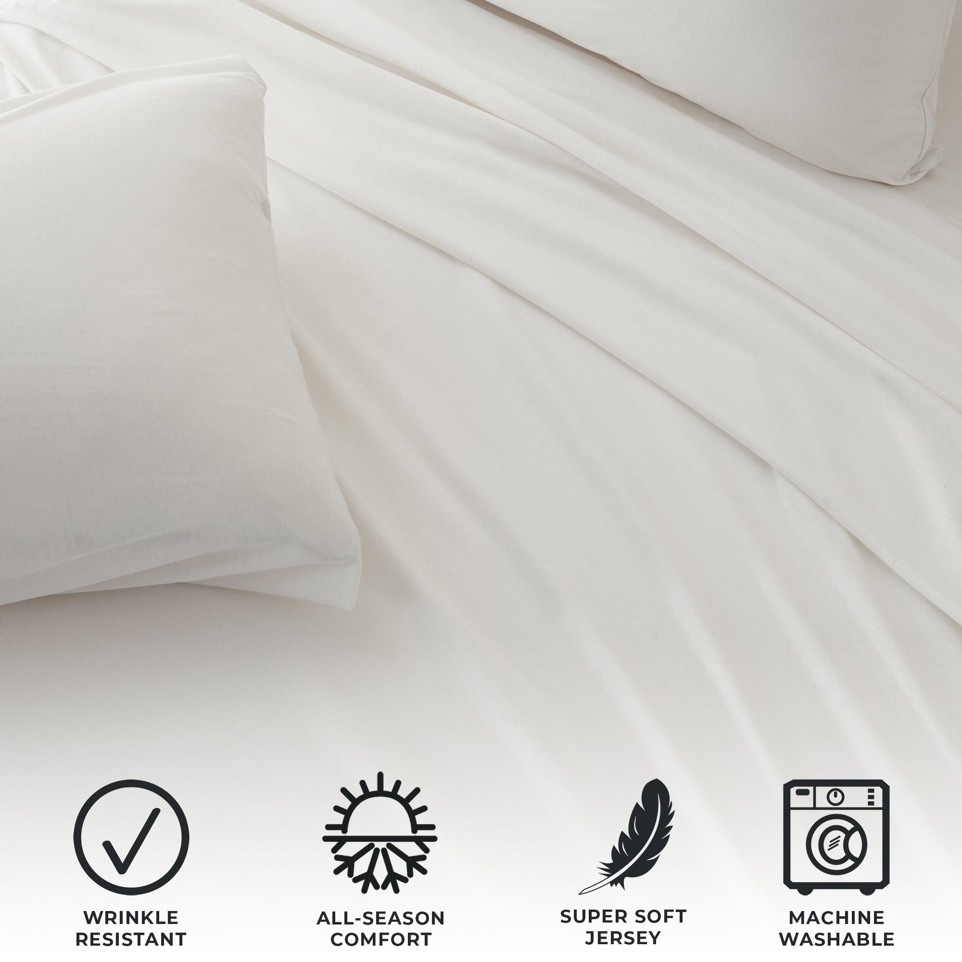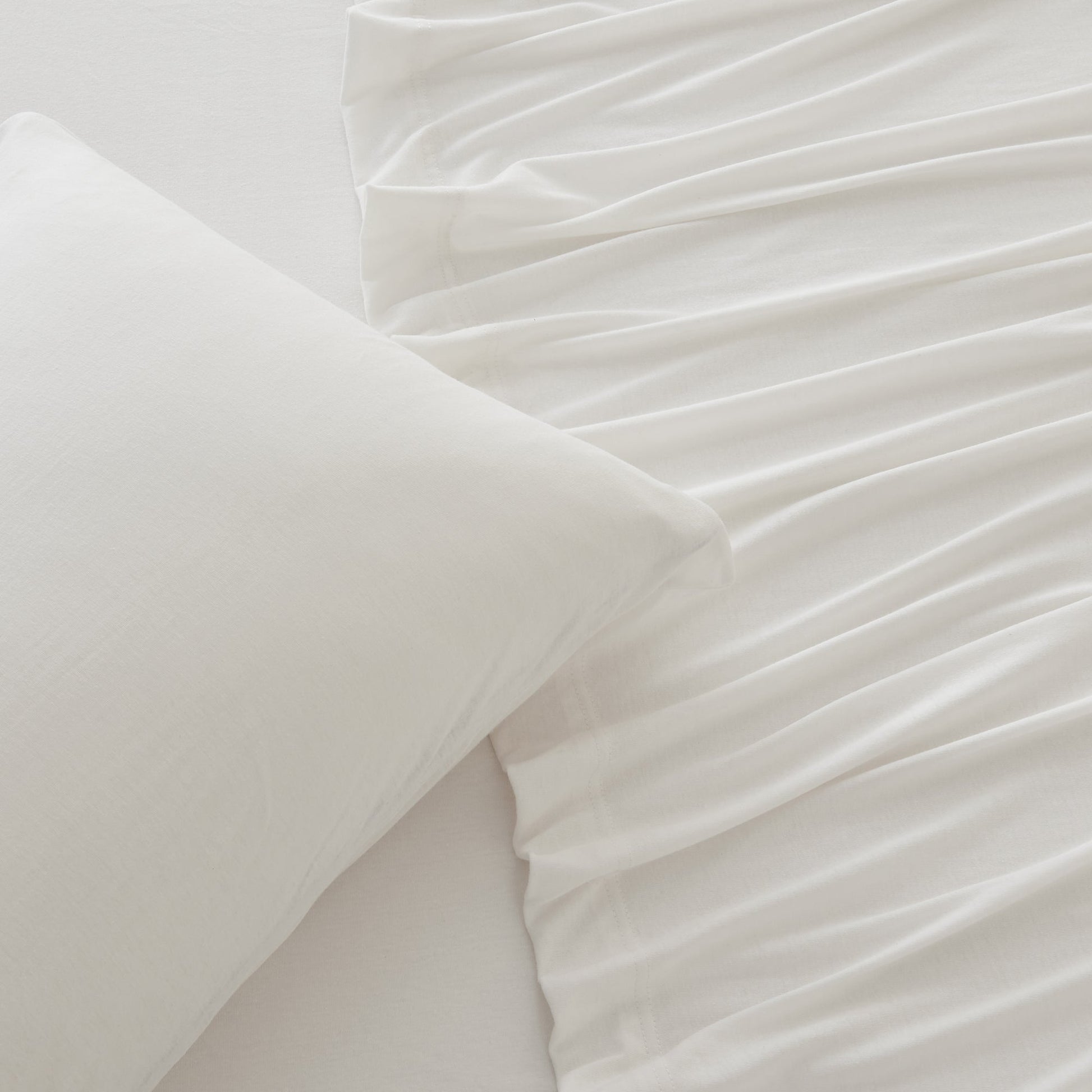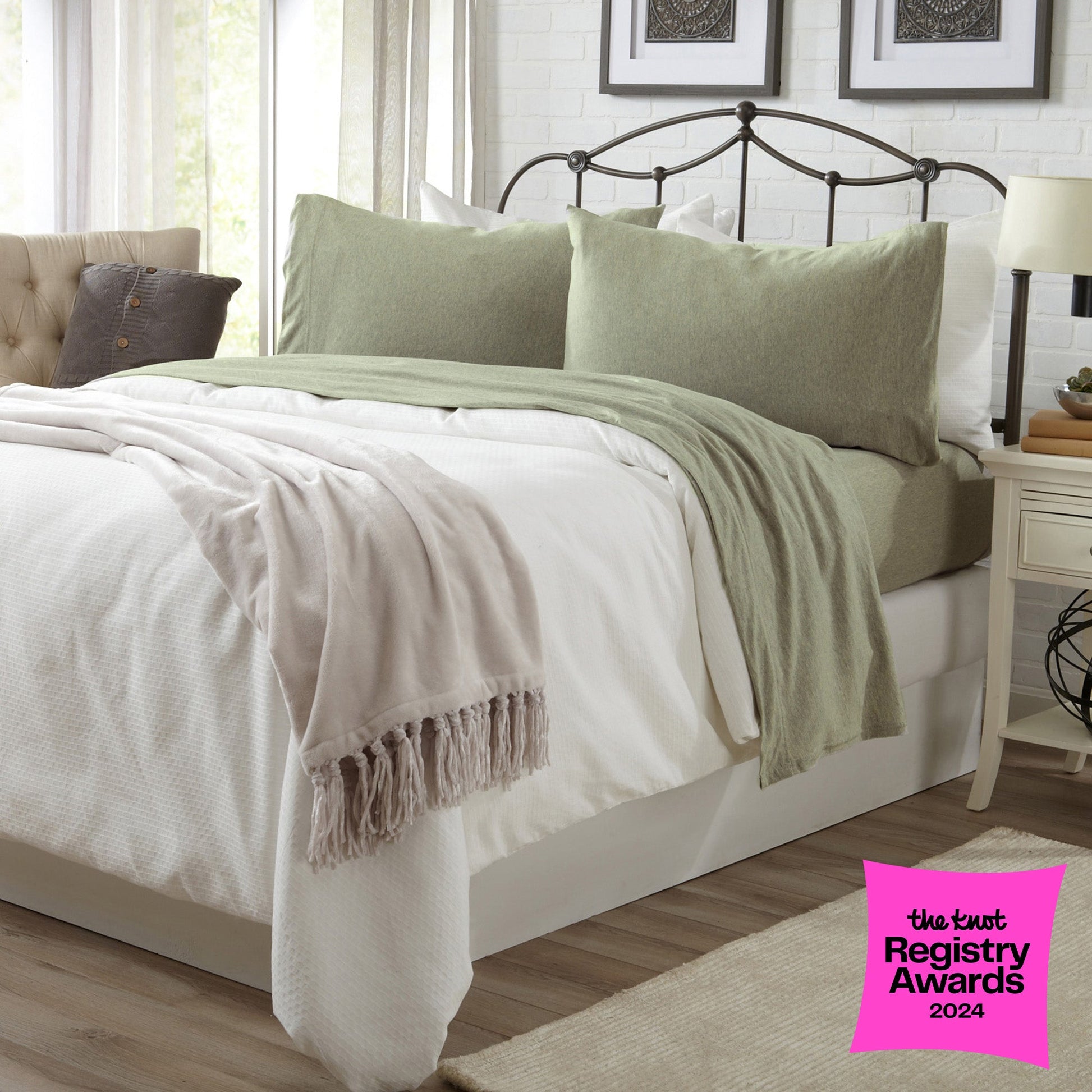 Wrap yourself in comfort with our heathered jersey knit sheets—just like your favorite worn-in T-shirt, but for your bed. Made from a soft and breathable cotton polyester blend, these sheets get even cozier with every wash. They naturally adapt to the seasons, keeping you cool when it’s warm and warm when it’s cool. The heathered melange finish adds a laid-back, effortlessly stylish touch to your space, while the slight stretch ensures a perfect, snug fit on your mattress. Easygoing, ultra-soft, and always inviting—these are the sheets you’ll never want to leave.