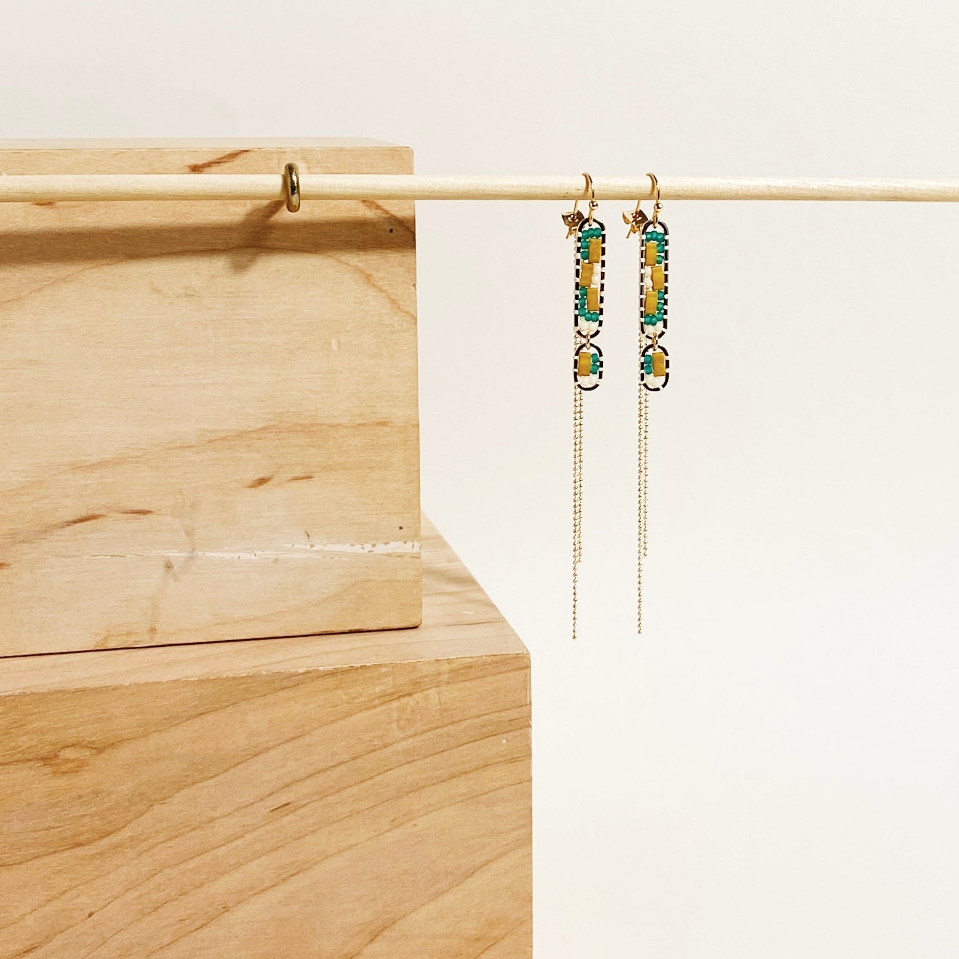 The Abstract Earrings are comprised of tila and seed beads woven to create a symmetrical flower pattern in each pair.