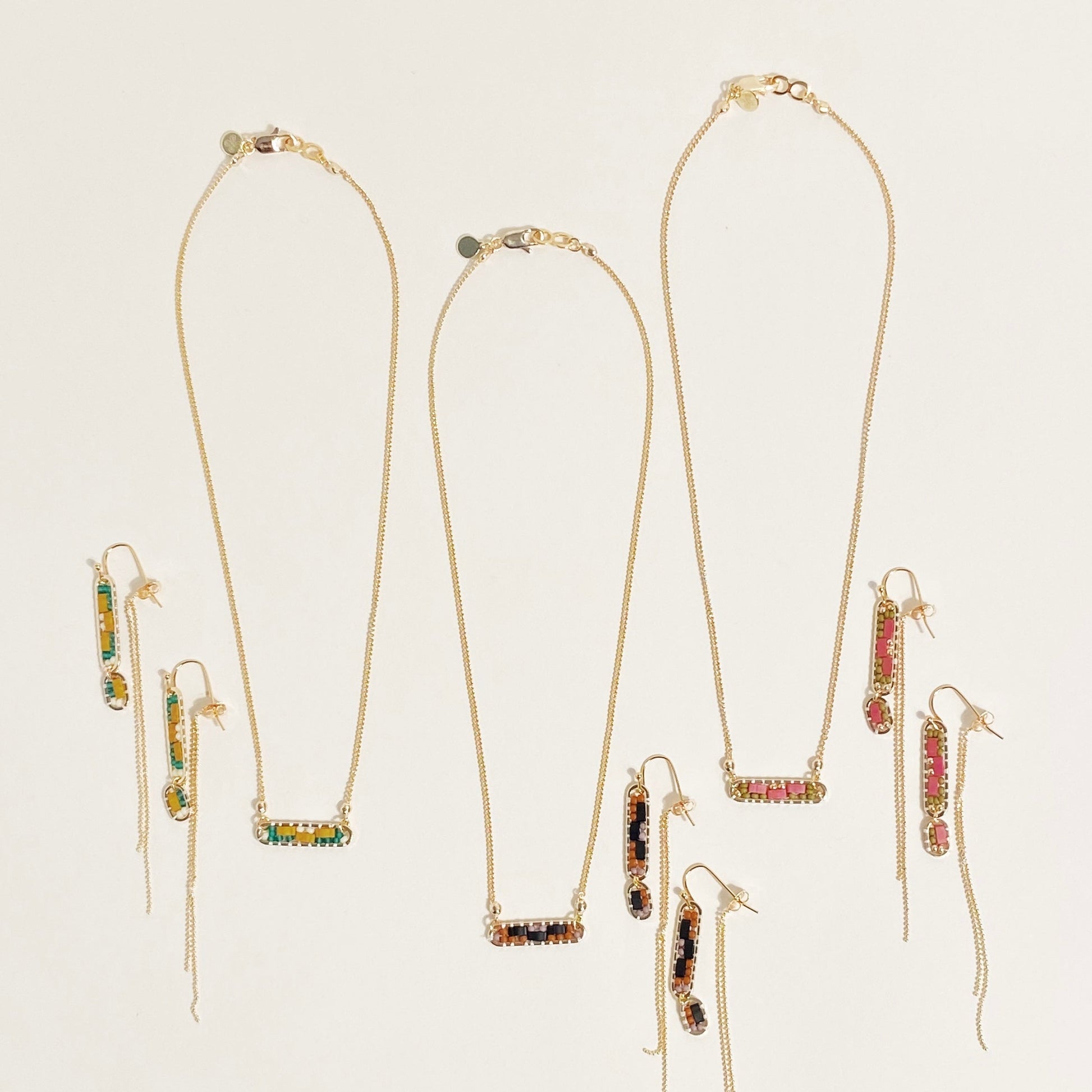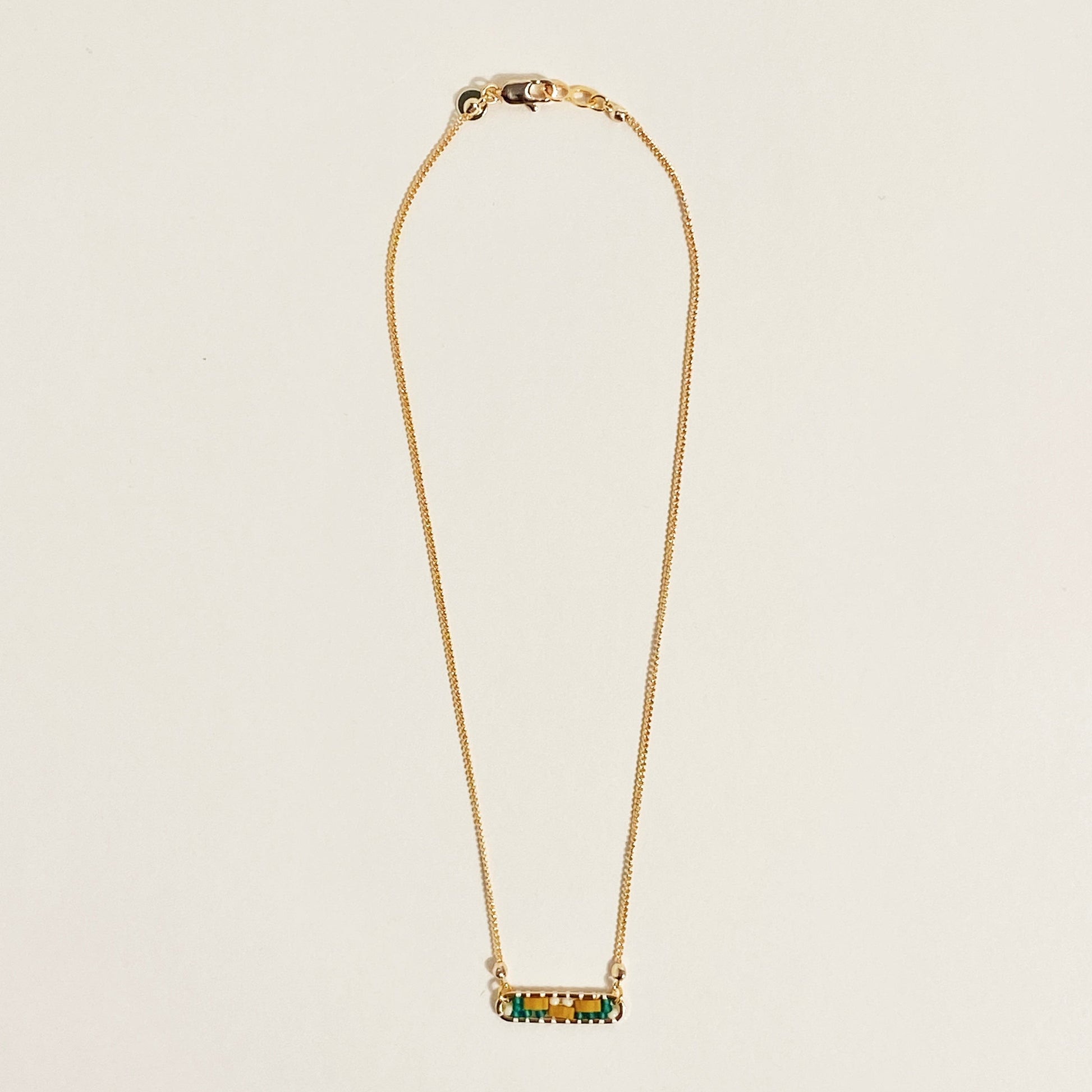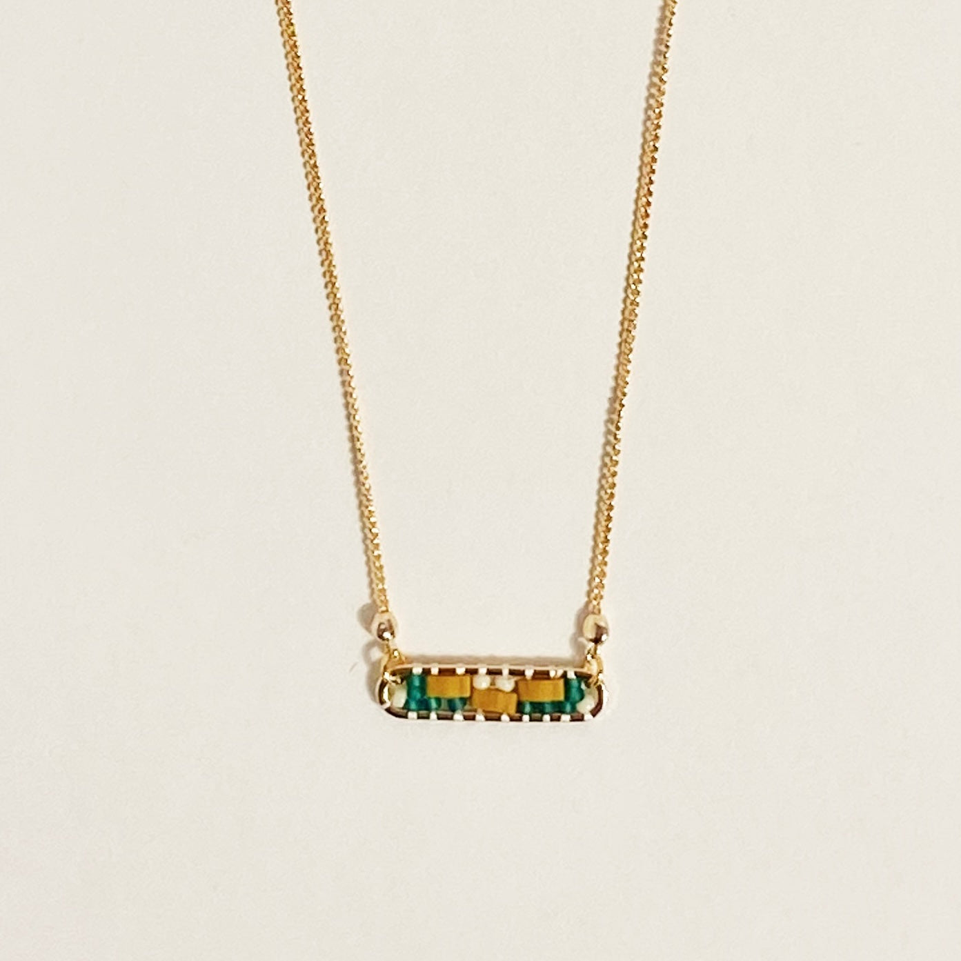 The Abstract Necklace is comprised of tila and seed beads woven to create a symmetrical pattern.