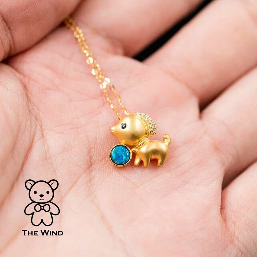 Adorable Dog Australian Doublet Opal, Diamond, Sapphire Pendant Necklace 18K Yellow Gold.