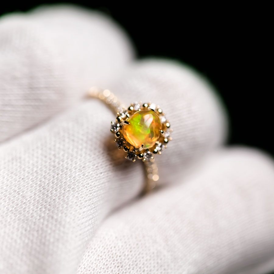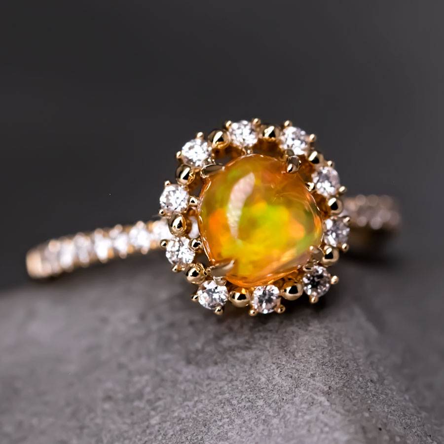 Adorable Orange Fire Opal & Halo Diamond Engagement Ring 18K Yellow Gold
