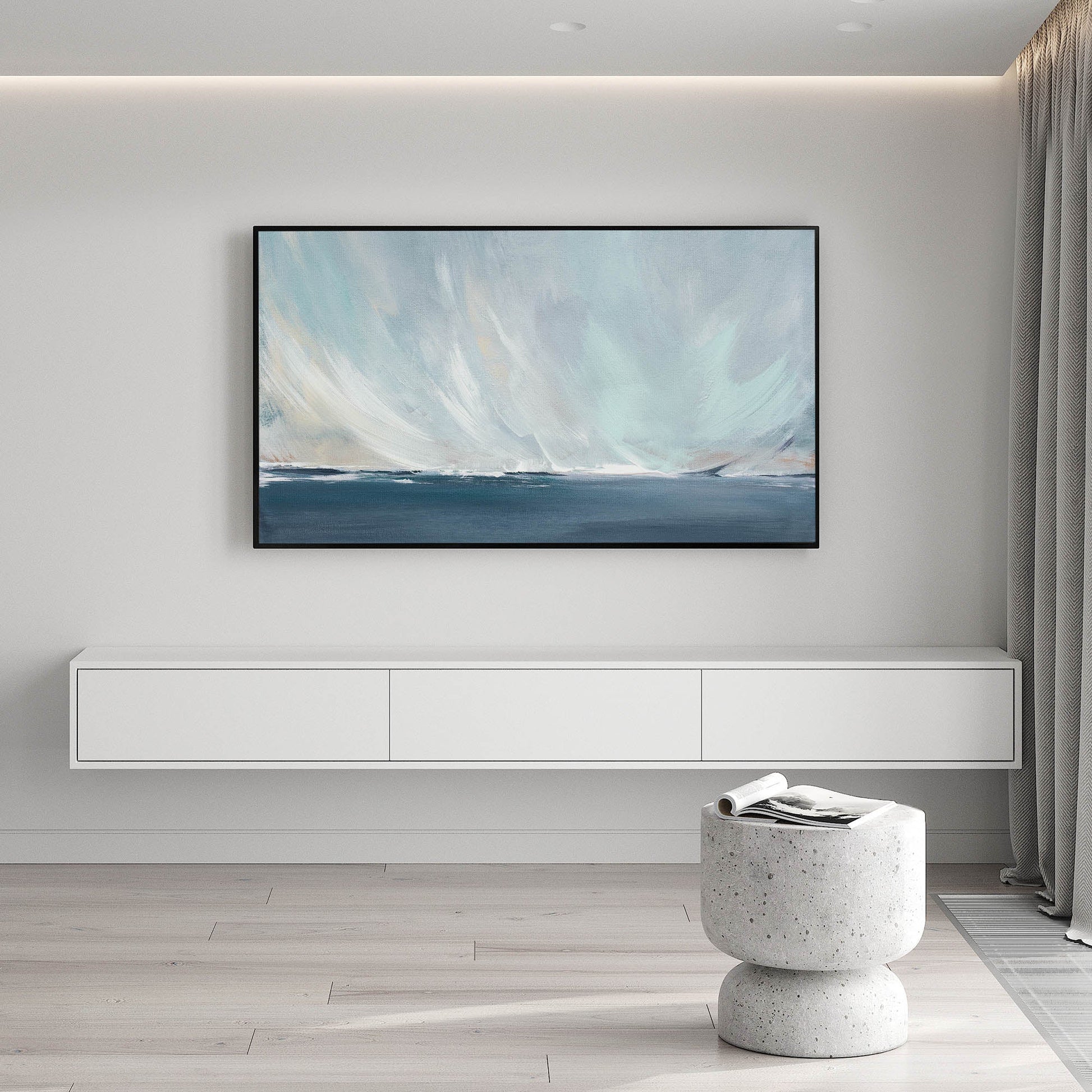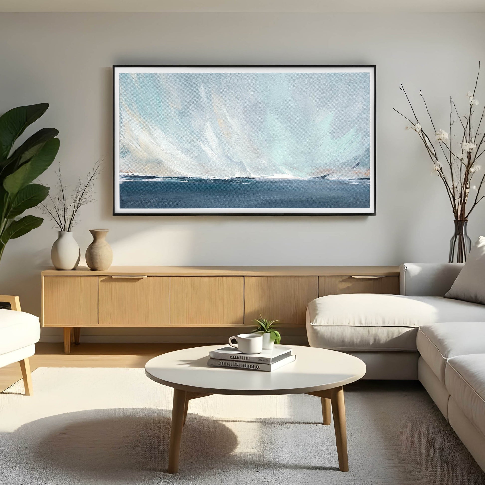 A dreamy seascape with soft blue tones and warm neutral accents.