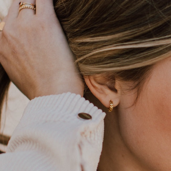 These Athena Mini Leaf Hoops are dainty, high quality, and hypoallergenic. They are tarnish and wear resistant and made of long lasting sterling silver or gold vermeil.