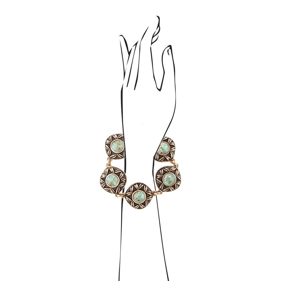 - Indulge in the exquisite beauty of genuine turquoise and bronze metal with this handcrafted, 8" long bracelet. Each link measures 1" and adds a touch of unique craftsmanship to this one-of-a-kind piece. Elevate your style and make a statement with this beautifully finished bracelet.