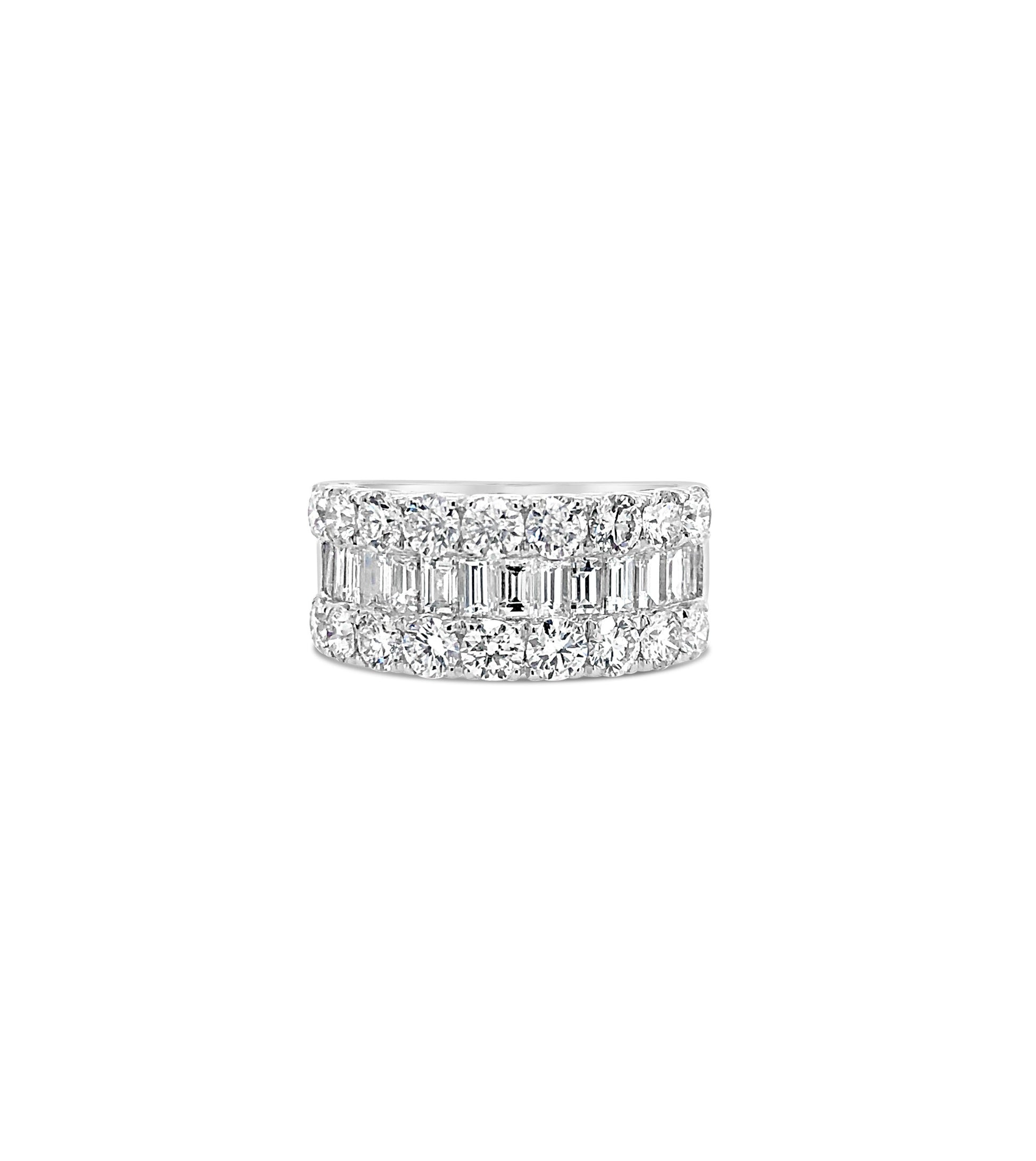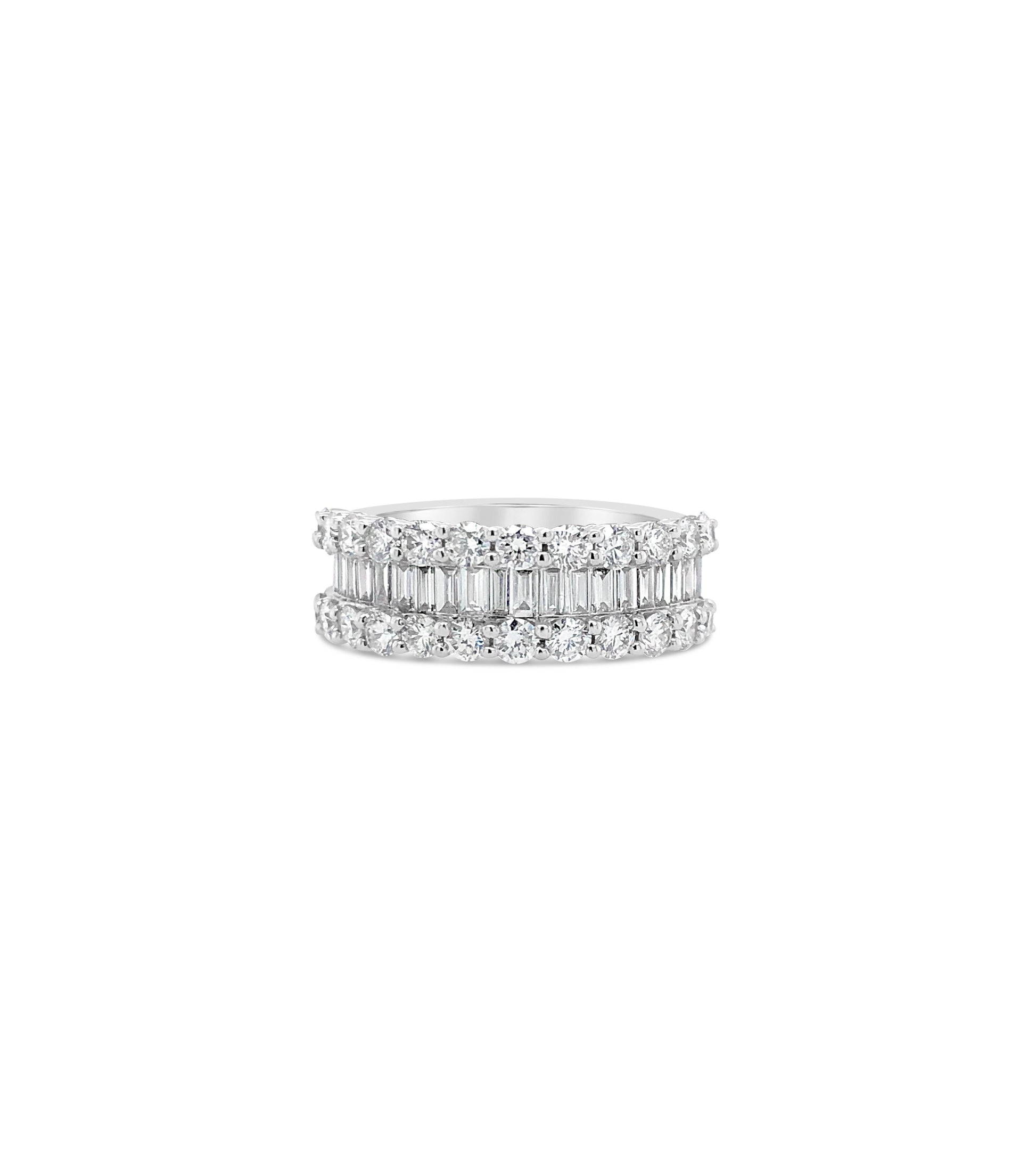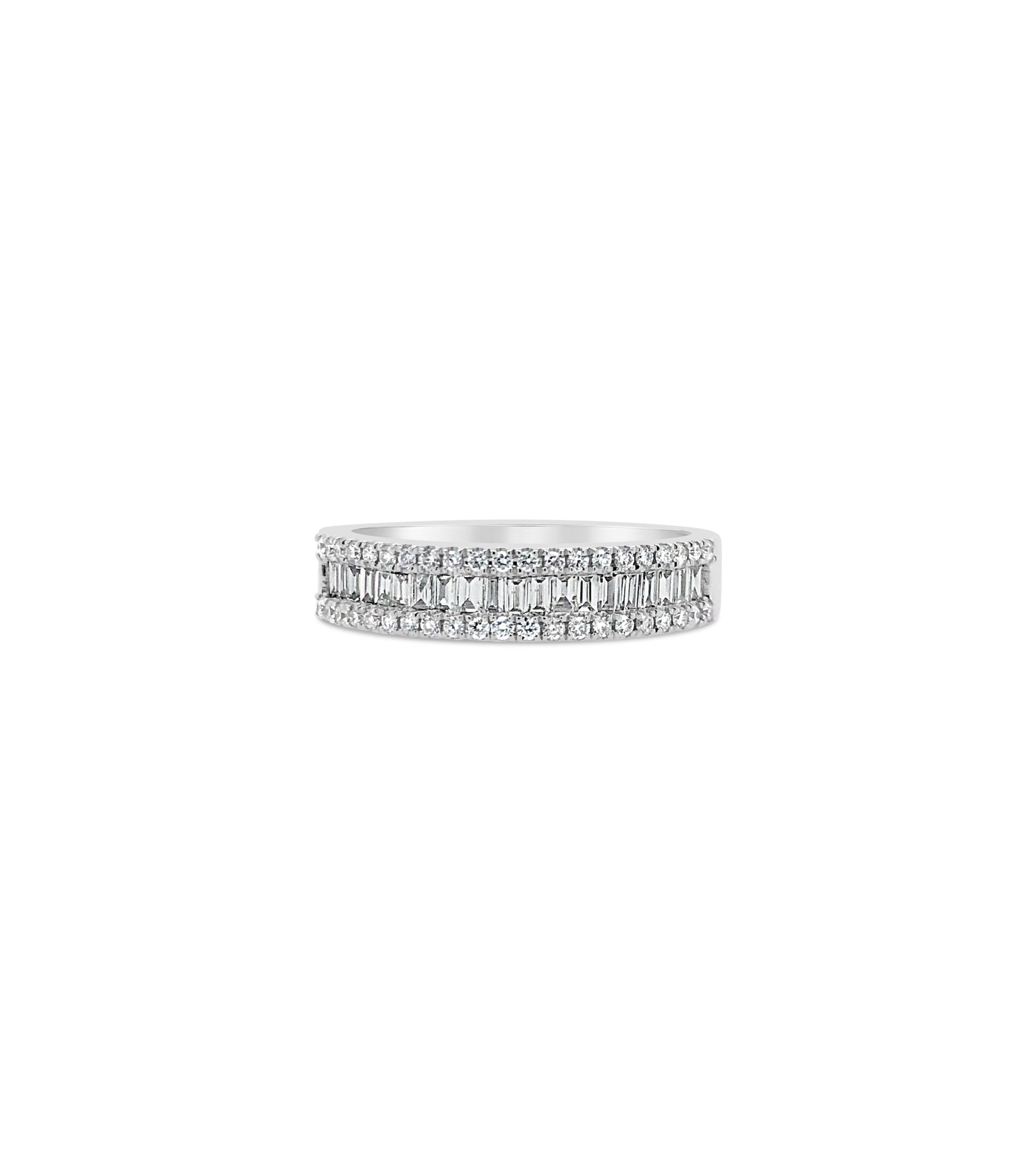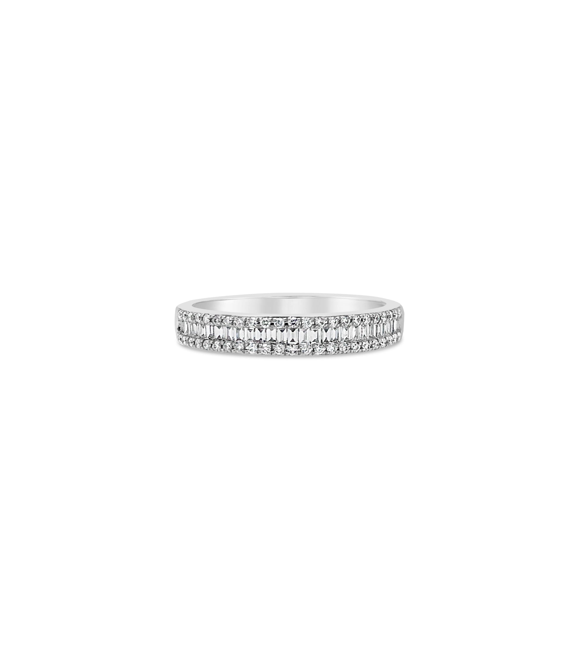 Sparkle and shine with our Baguette & Round Diamond Band. Made from solid 18k gold, this beautiful wedding band features a stunning combination of baguette and round diamonds. Add a touch of elegance and sophistication to your special day with this luxurious piece.