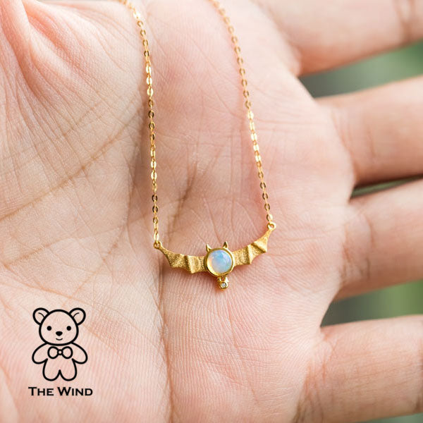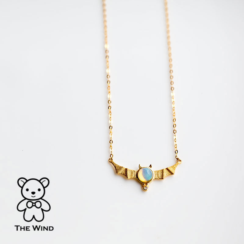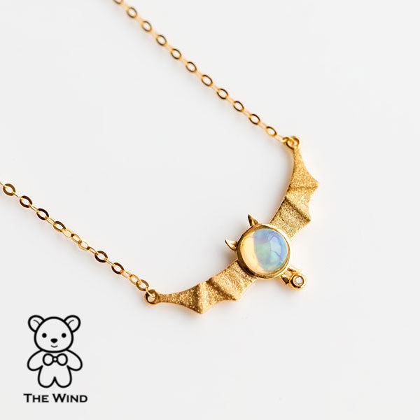 Adorable Bat Design Australian Solid Opal & Diamond Necklace 18K Yellow Gold.