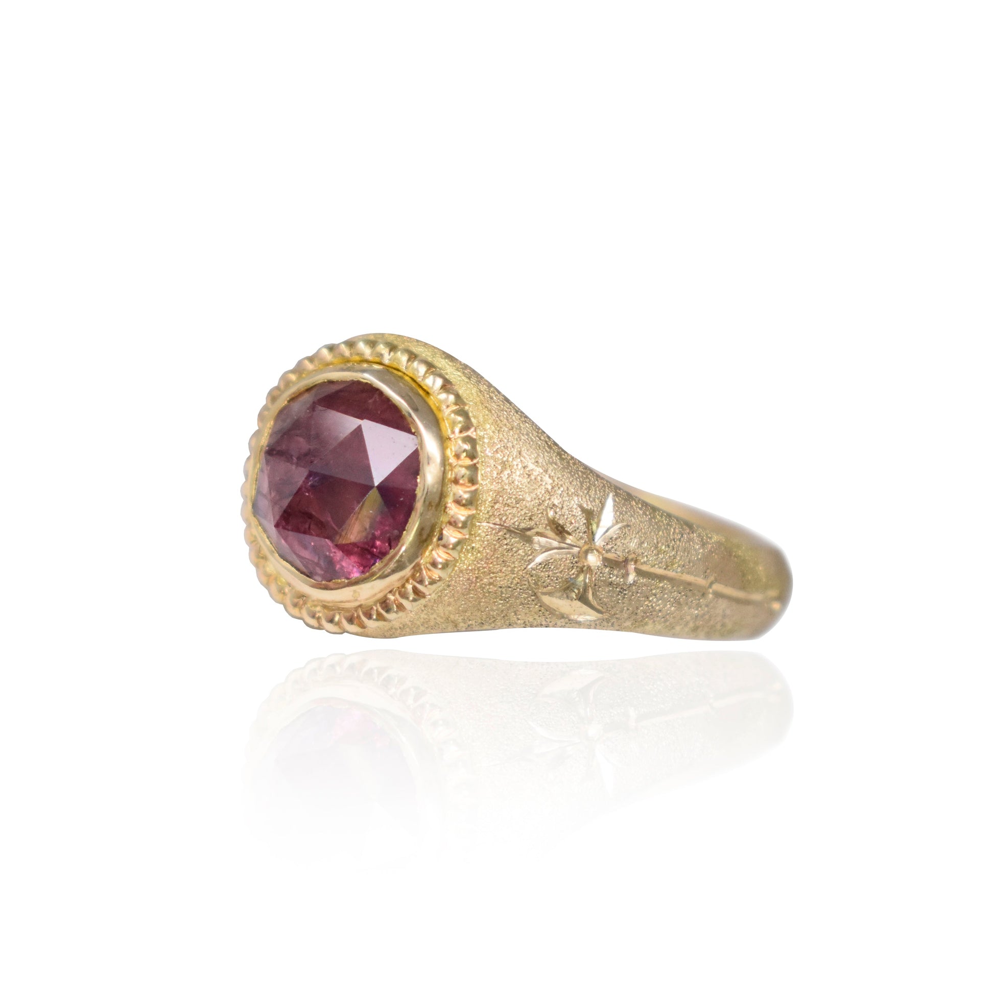 Featuring a rose cut sapphire from Winza, Tanzania surrounded by mil grain, and flanked by two bright-cut hand engraved battle axes on highly-textured band.
