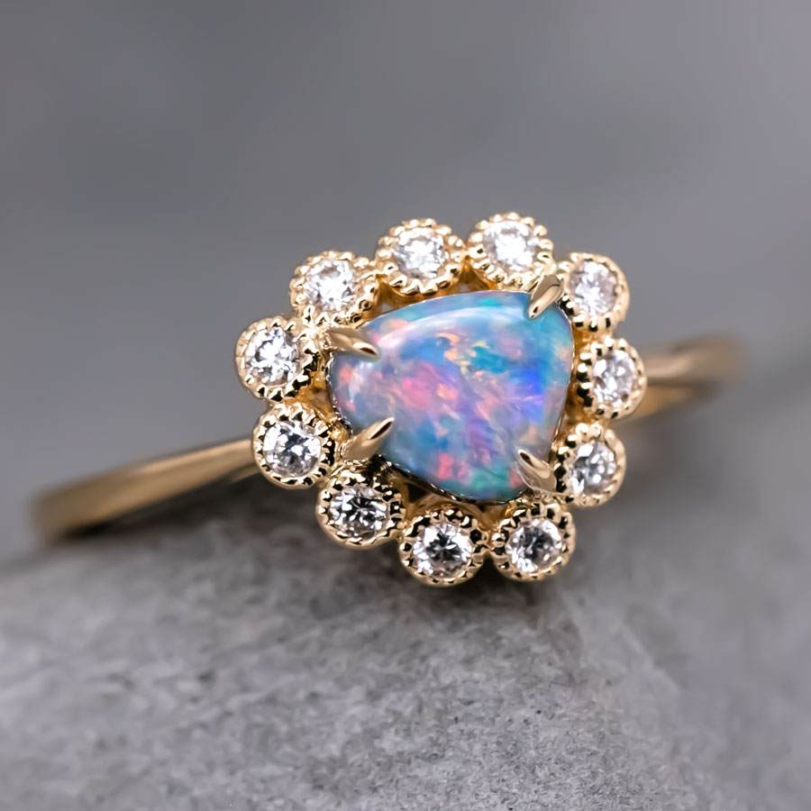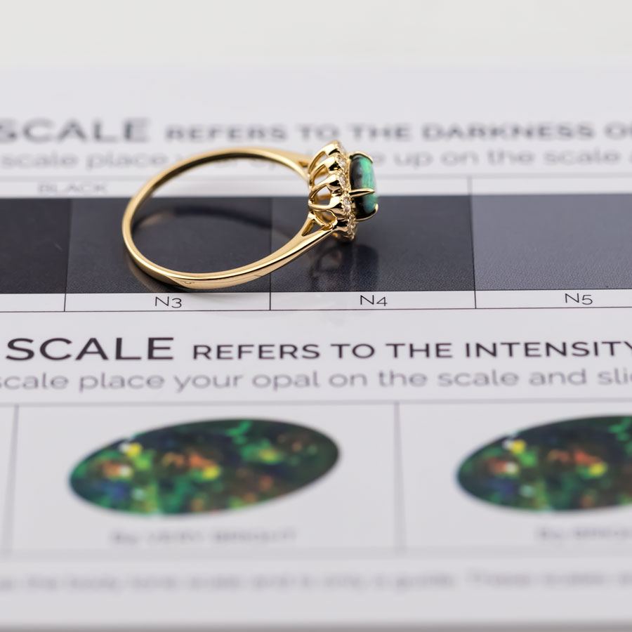 Beautiful Black Opal & Halo Diamond Engagement Ring 18K Yellow Gold