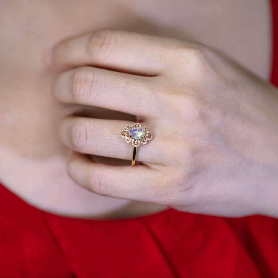 Design idea: This exquisite ring features a stunning Mexican Fire opal as its centerpiece, showcasing a mesmerizing display of vibrant colors, including green, red, yellow, and orange. The opal's play-of-color is beautifully enhanced by the surrounding 76 French pavé diamonds set on delicate swirls, adding incredible fire and brilliance to the design.