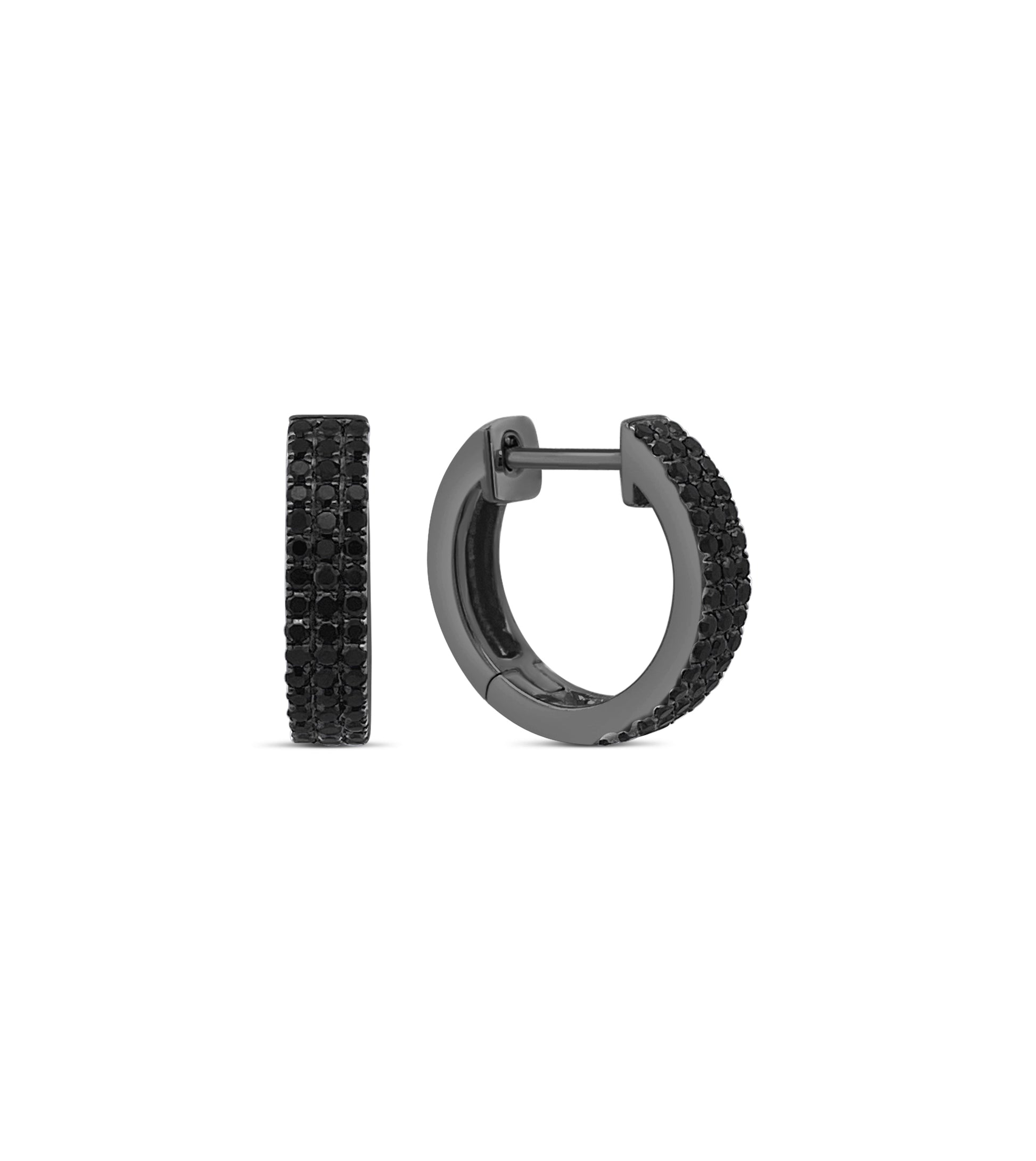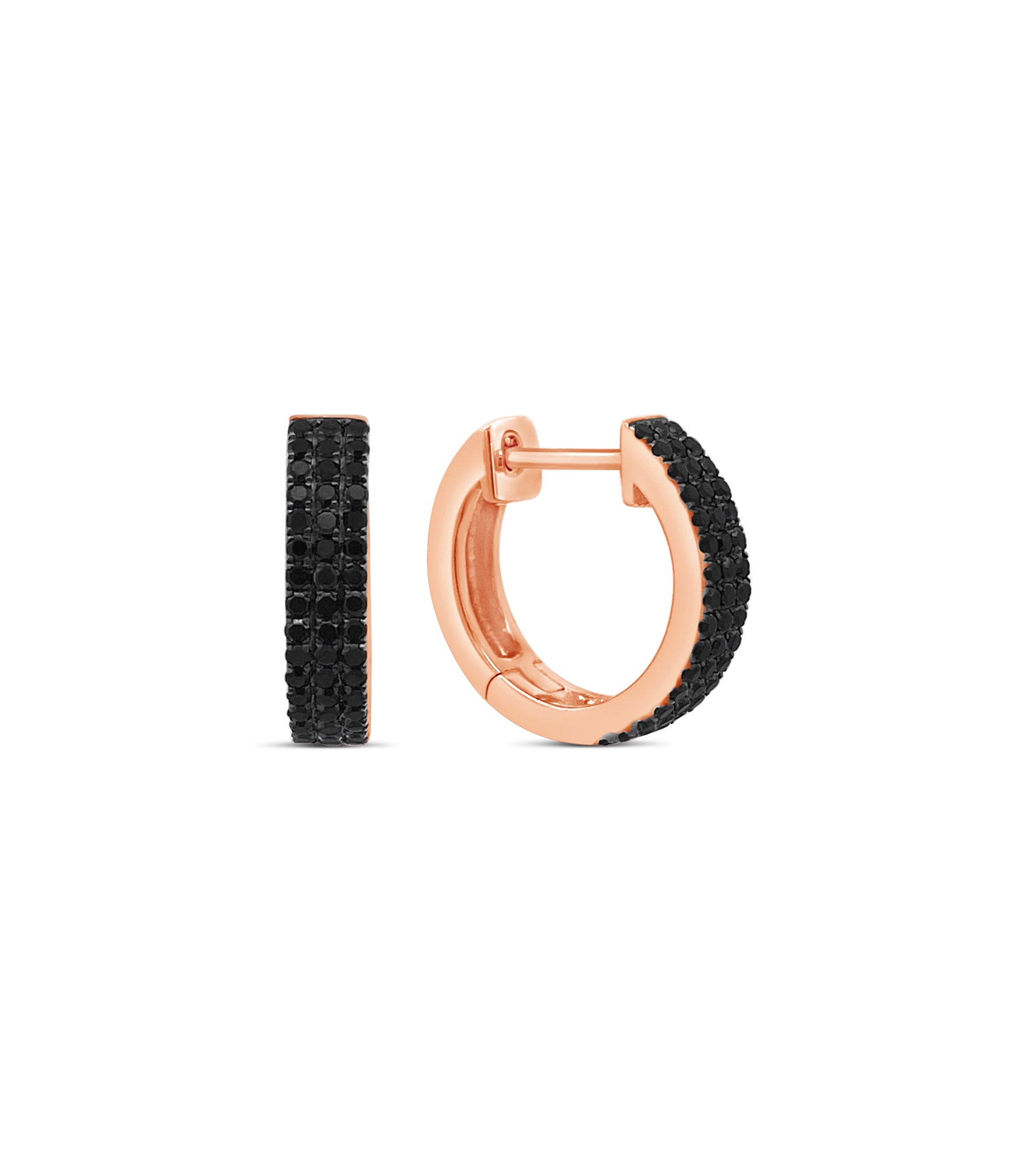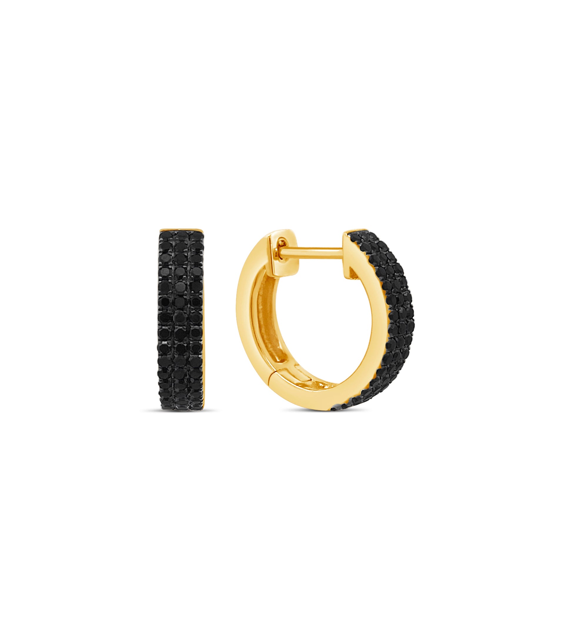 Treat yourself to an exquisite gift with these 14k gold Black Diamond 3 Row Huggie Earrings! The sparkle of the over 90 hand-set pave black diamonds will make you shine from day to night. Enjoy the luxury with a lightweight huggie hoop fit that will be sure to turn heads!