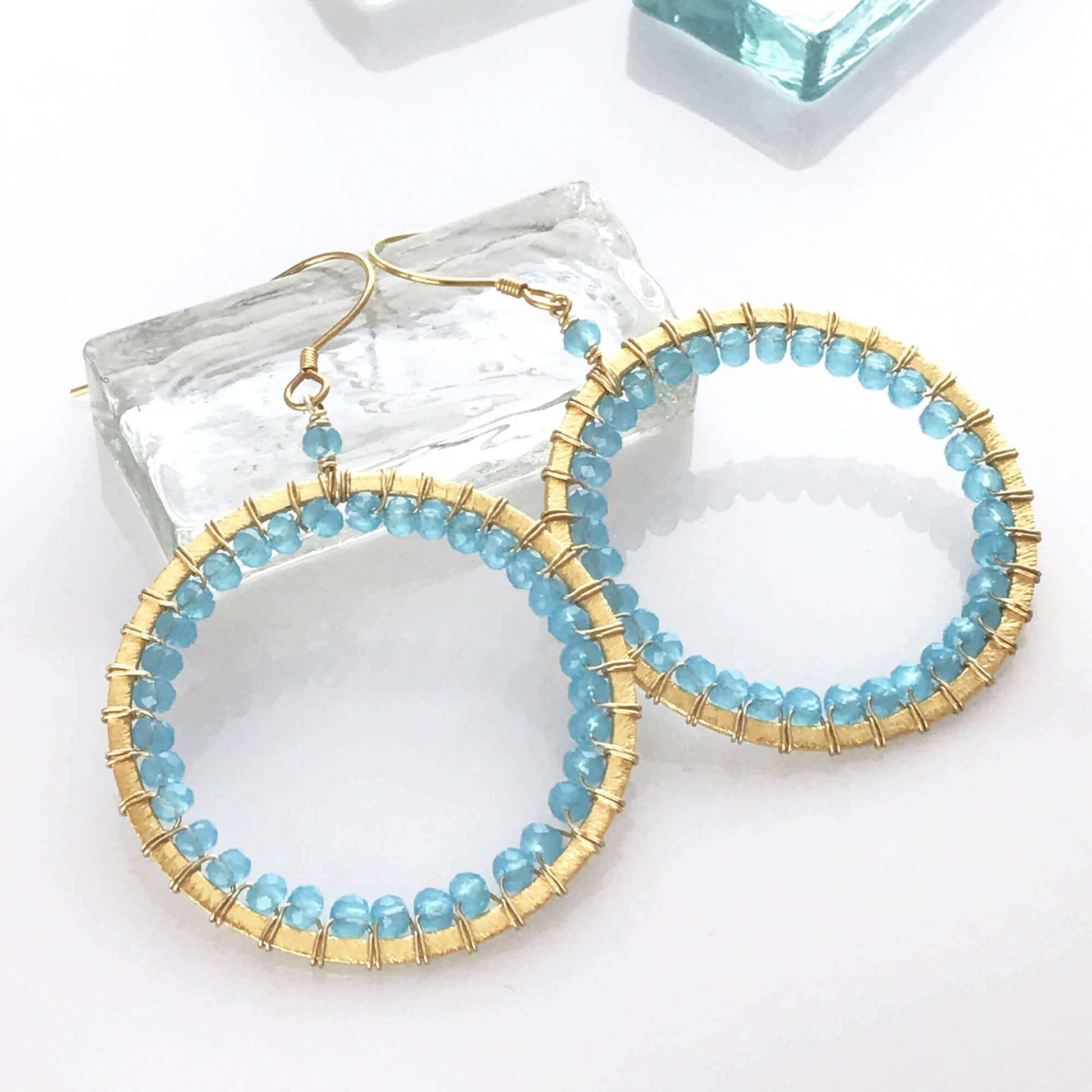 The Halo collection was our very first one. Intended to symbolize the intricate, universal energy woven within us all. These sparkling Blue Chalcedony earrings are ultra lightweight and an eye-catching alternative to a traditional hoop.