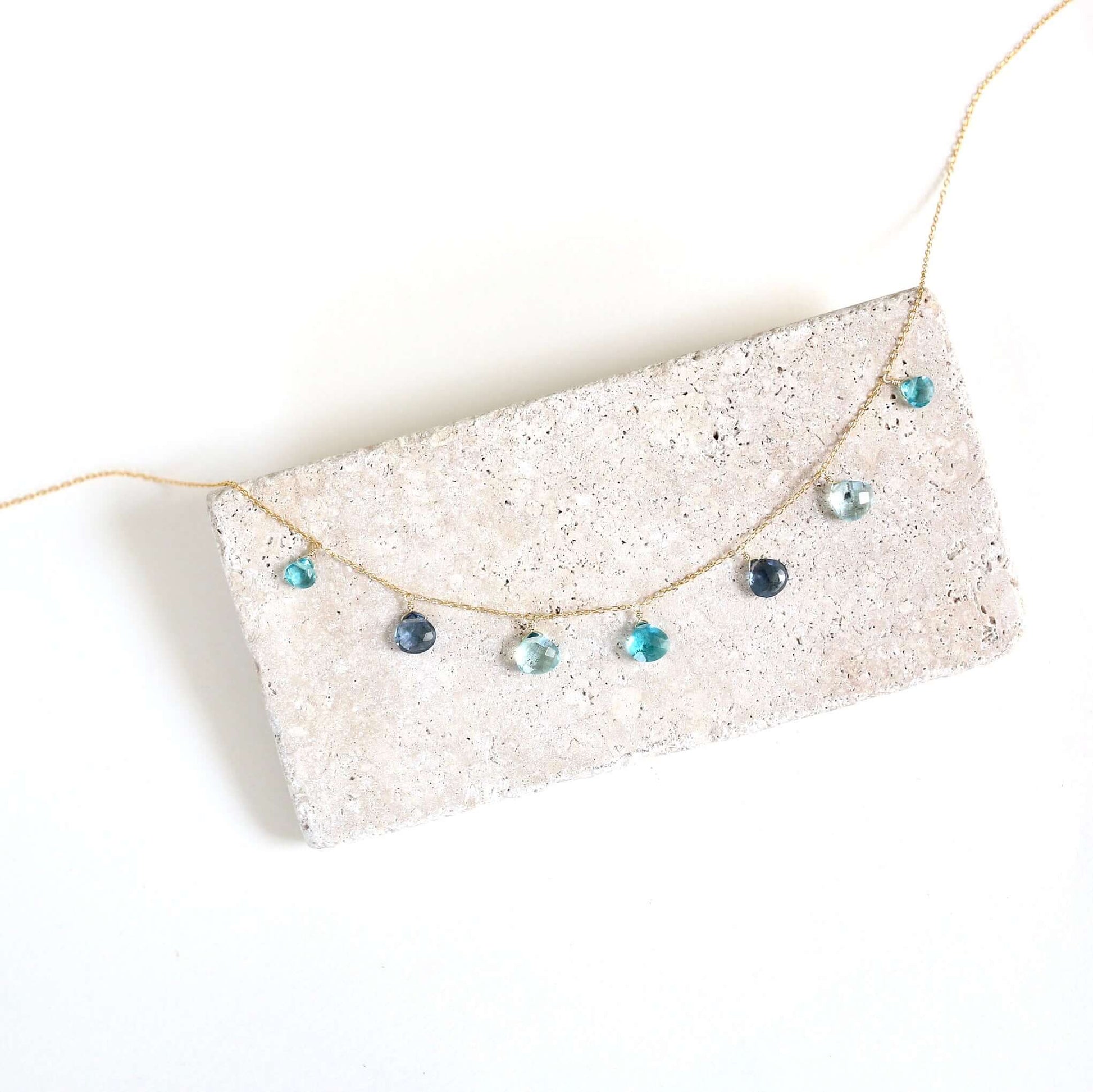 A lovely string of sparkling gems. Featuring Aquamarine, Iolite, and Aquamarine Blue Quartz gemstones, this 16-18" necklace comes with a 2" extender and a spring ring clasp. Made in our NYC studio with fine Italian sterling silver plated in rhodium, this gorgeous strand of gems shines like white gold and stays tarnish-free. Plus, each gemstone's unique nature makes this necklace truly one-of-a-kind. Packaged in a gift box and handmade to last.
