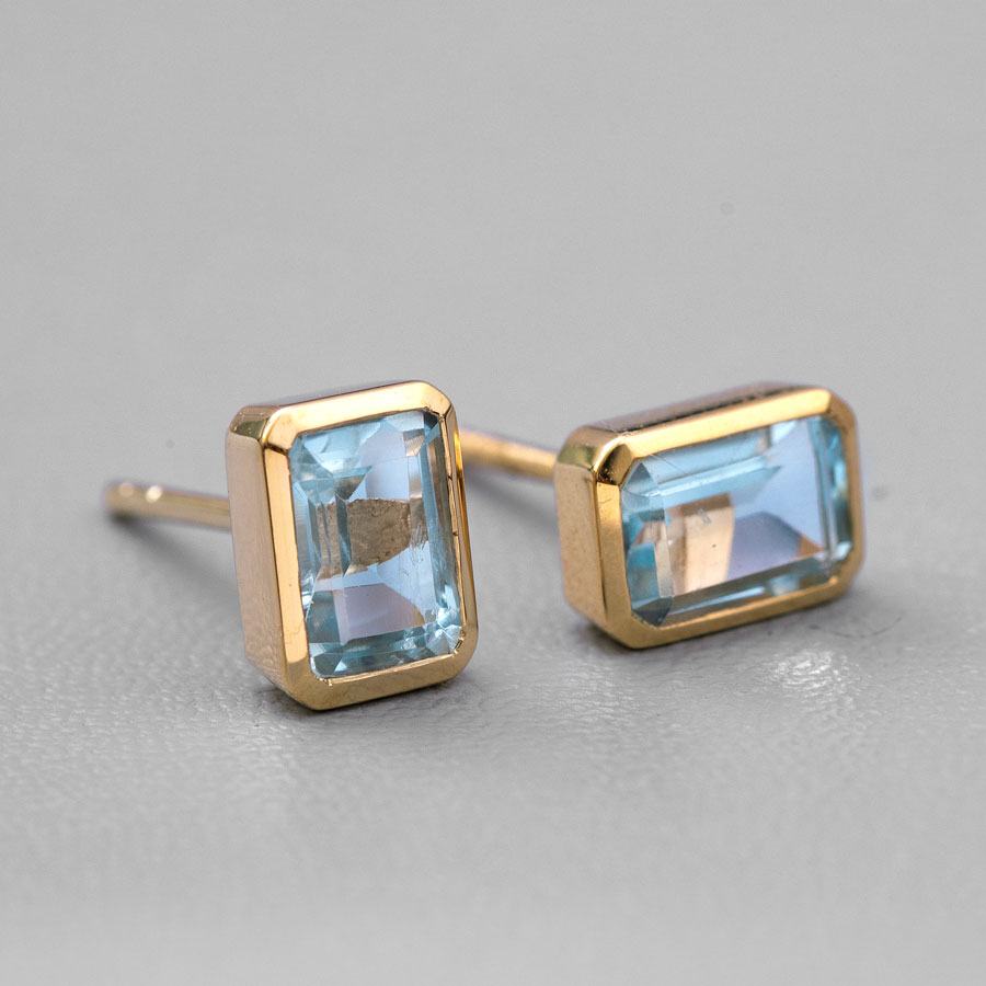 Natural Blue Topaz Stud Earrings 14K Yellow Gold Minimalist Emerald Cut.