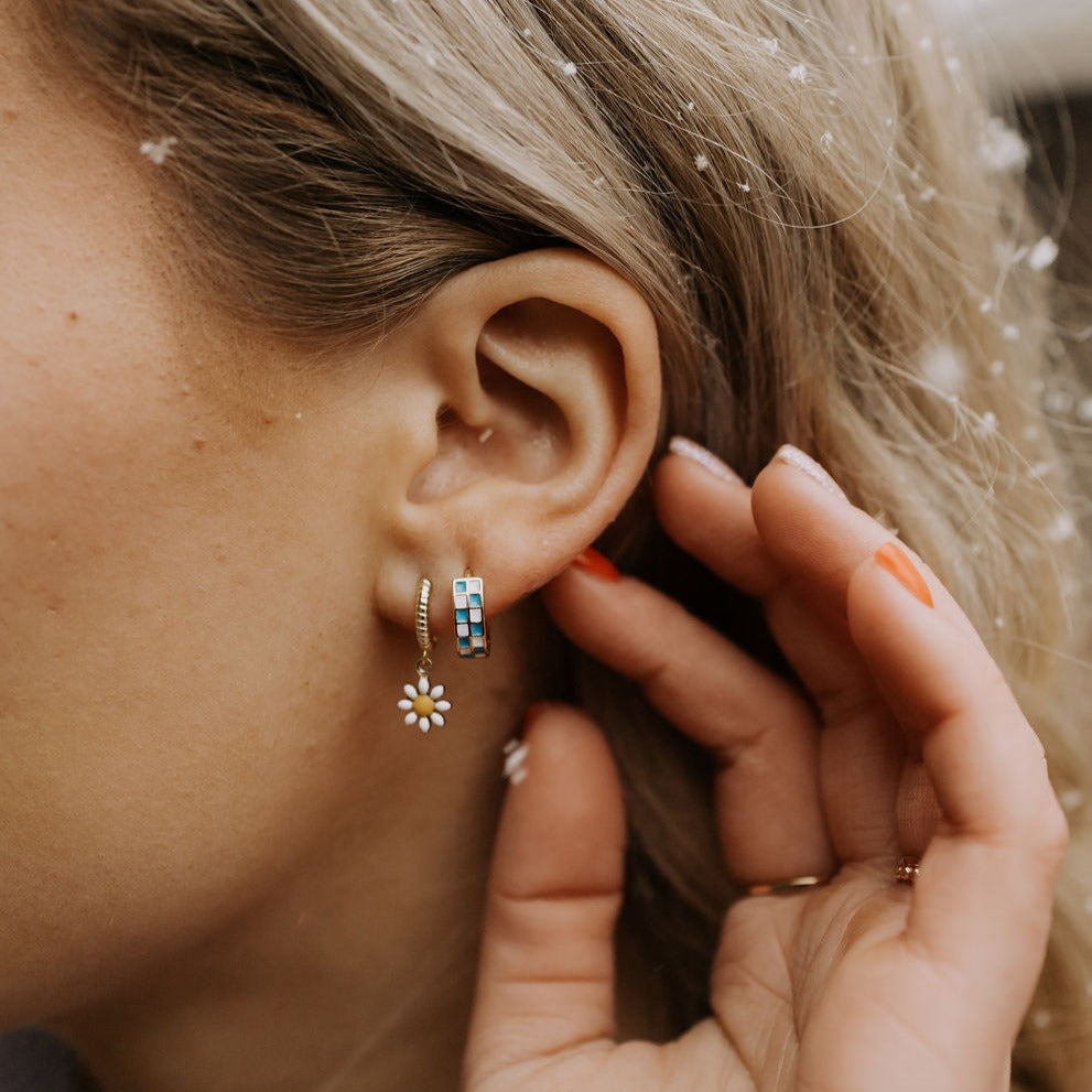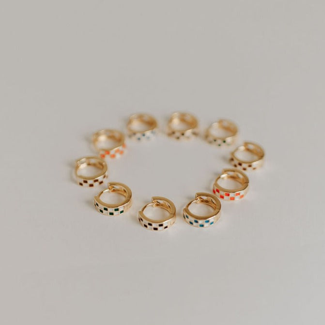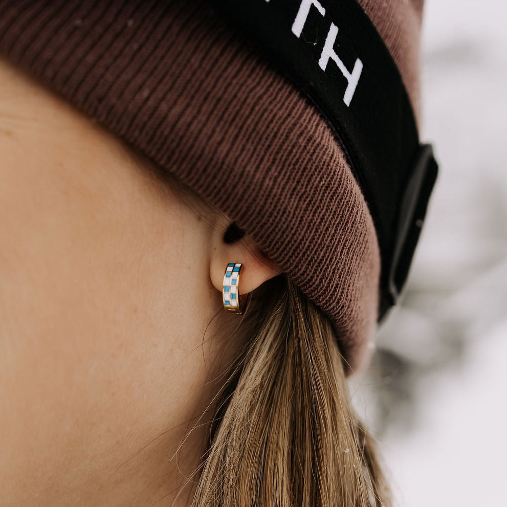 The Blue & White Checkered Hoops are made of high quality gold fill and are hypoallergenic and good for sensitive ears. They have a huggie closure style and are the cutest new jewelry trend! Outer diameter is 10mm.