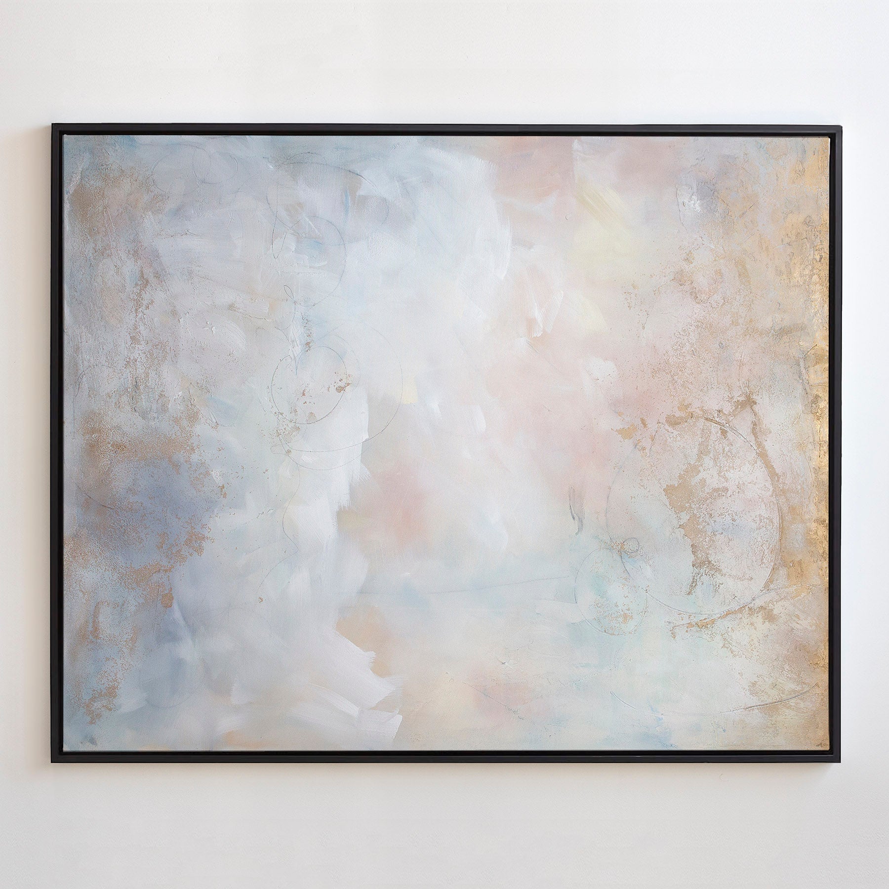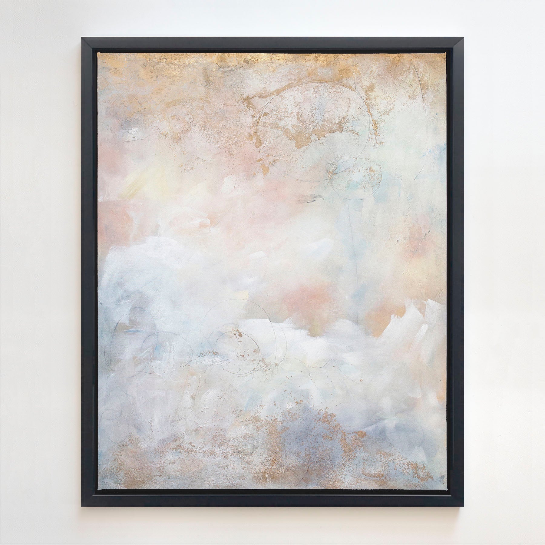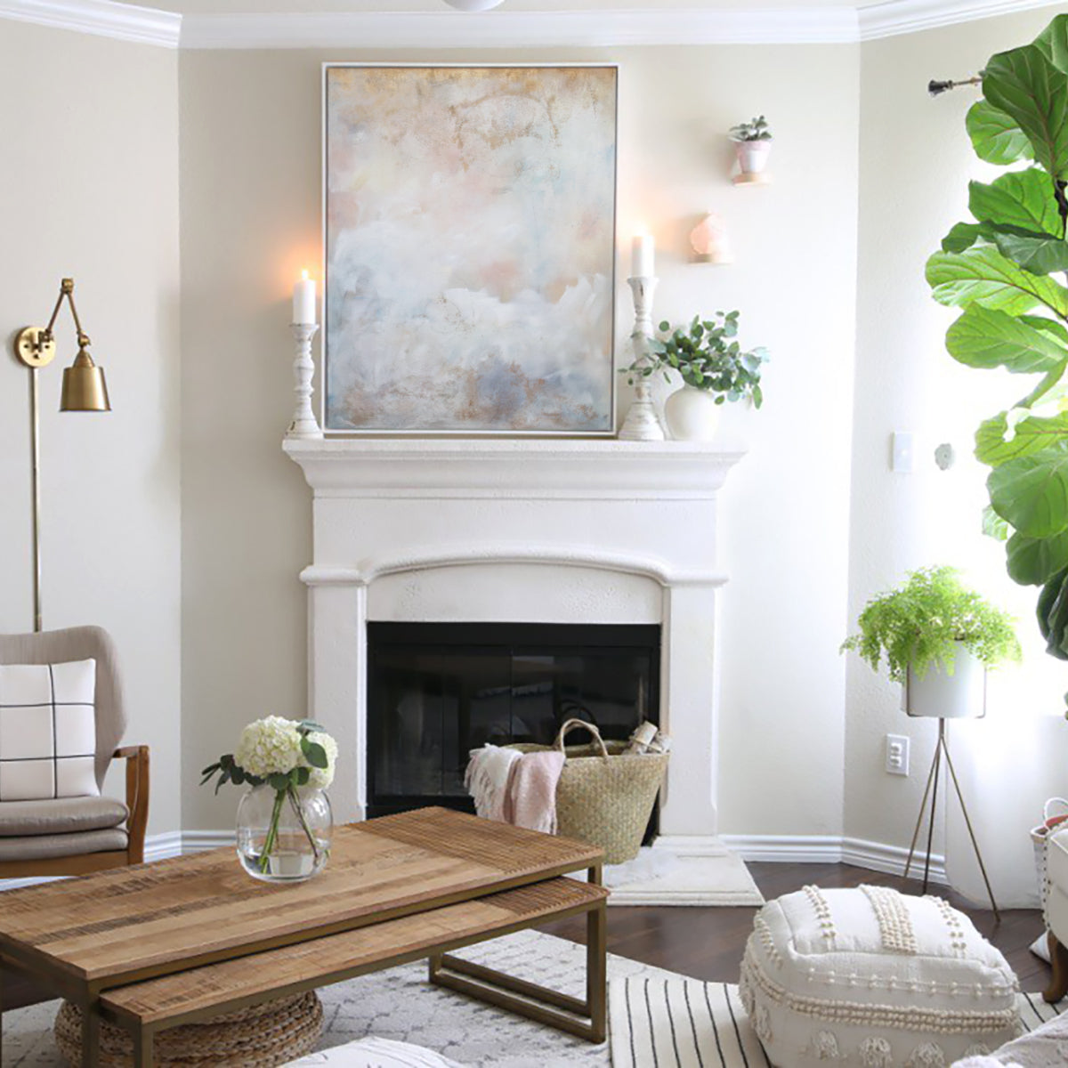 Install photo by designer and blogger Hayley Smith of “A House With Books” features a 36x46 canvas print of “Blushing Breeze” finished in white floater frame perched atop her fireplace mantel.