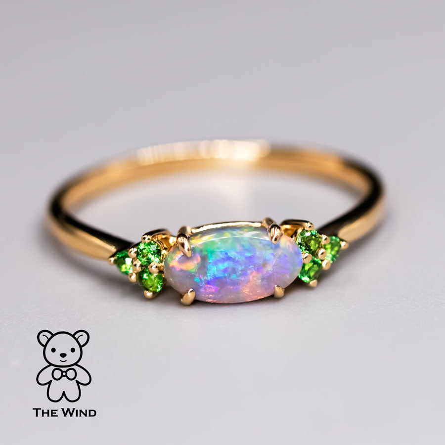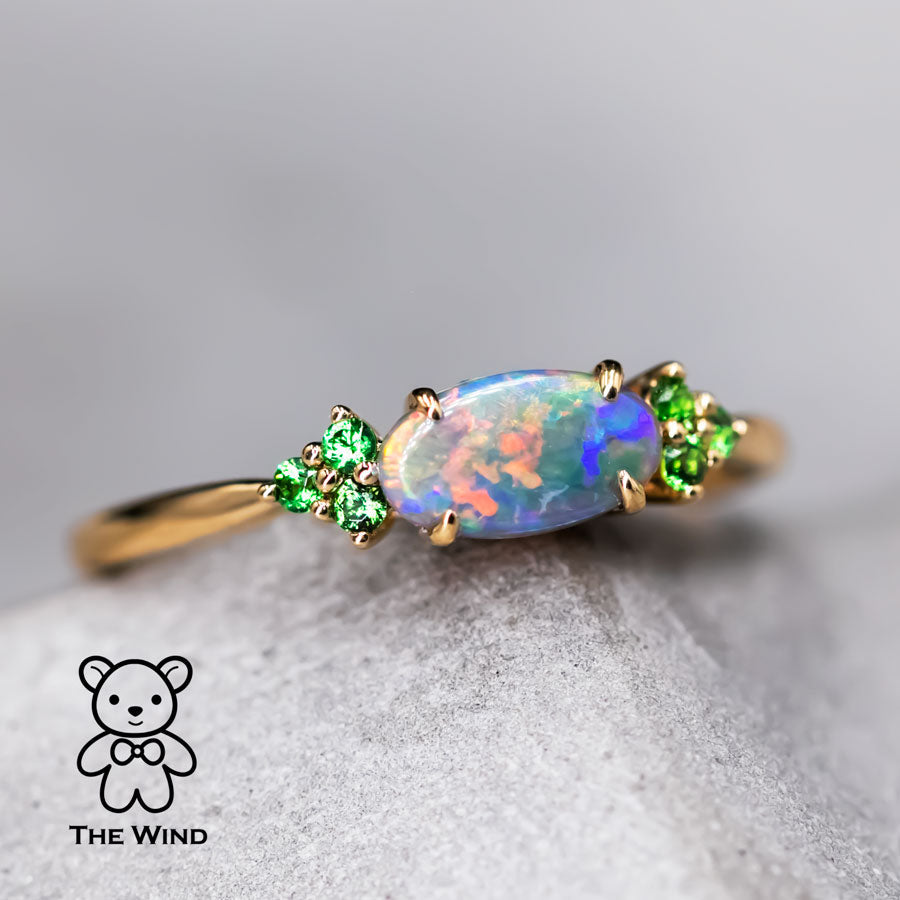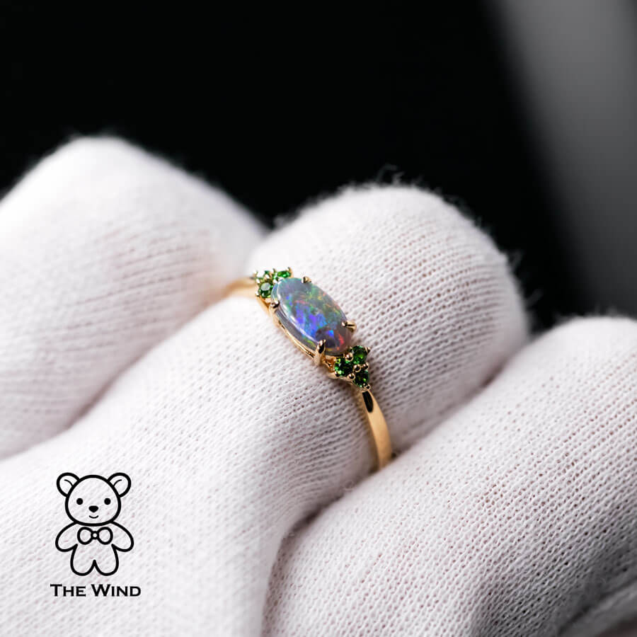 Bright Australian Semi-Black Opal and Tsavorite Garnet Engagement Wedding Ring