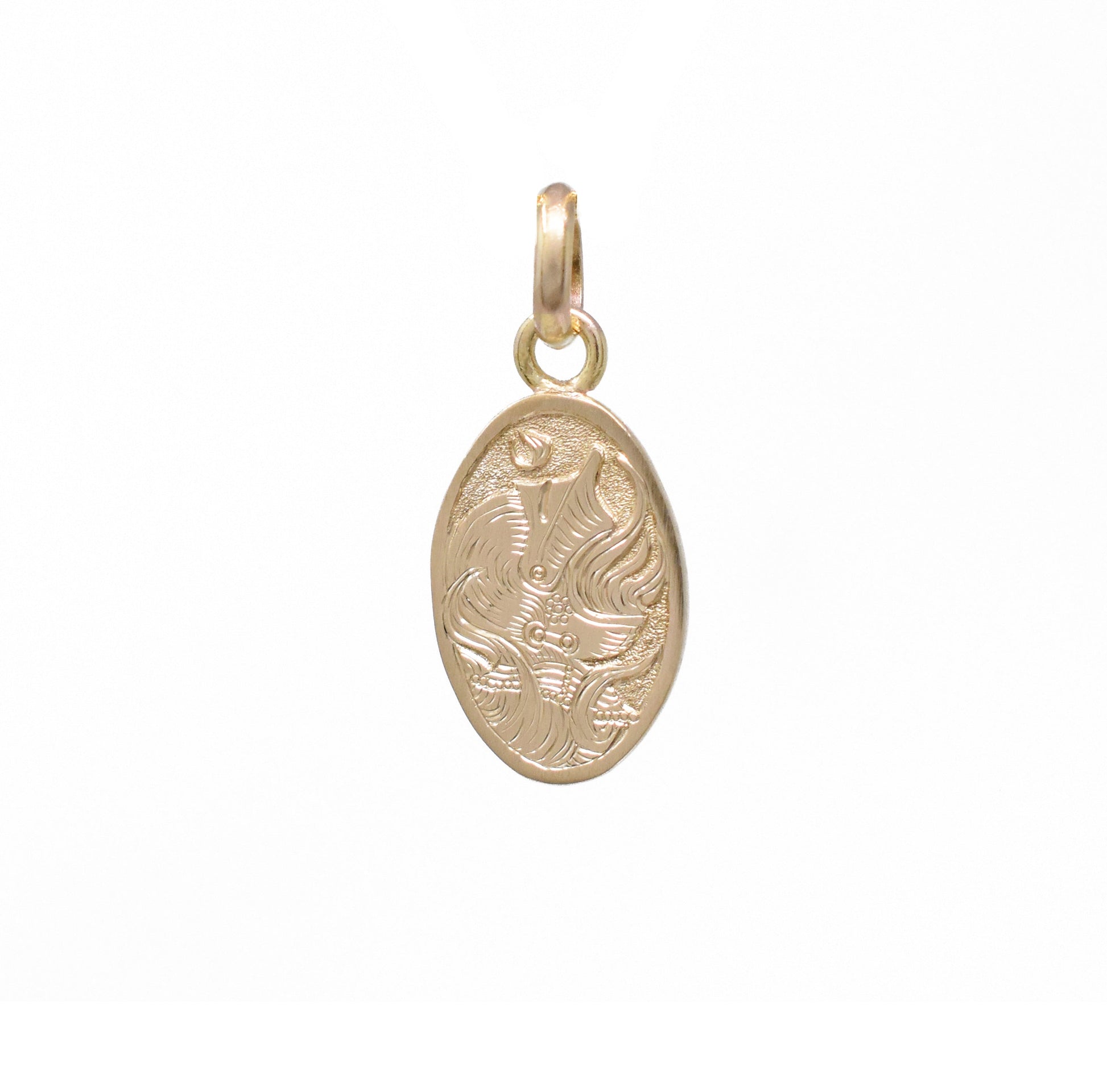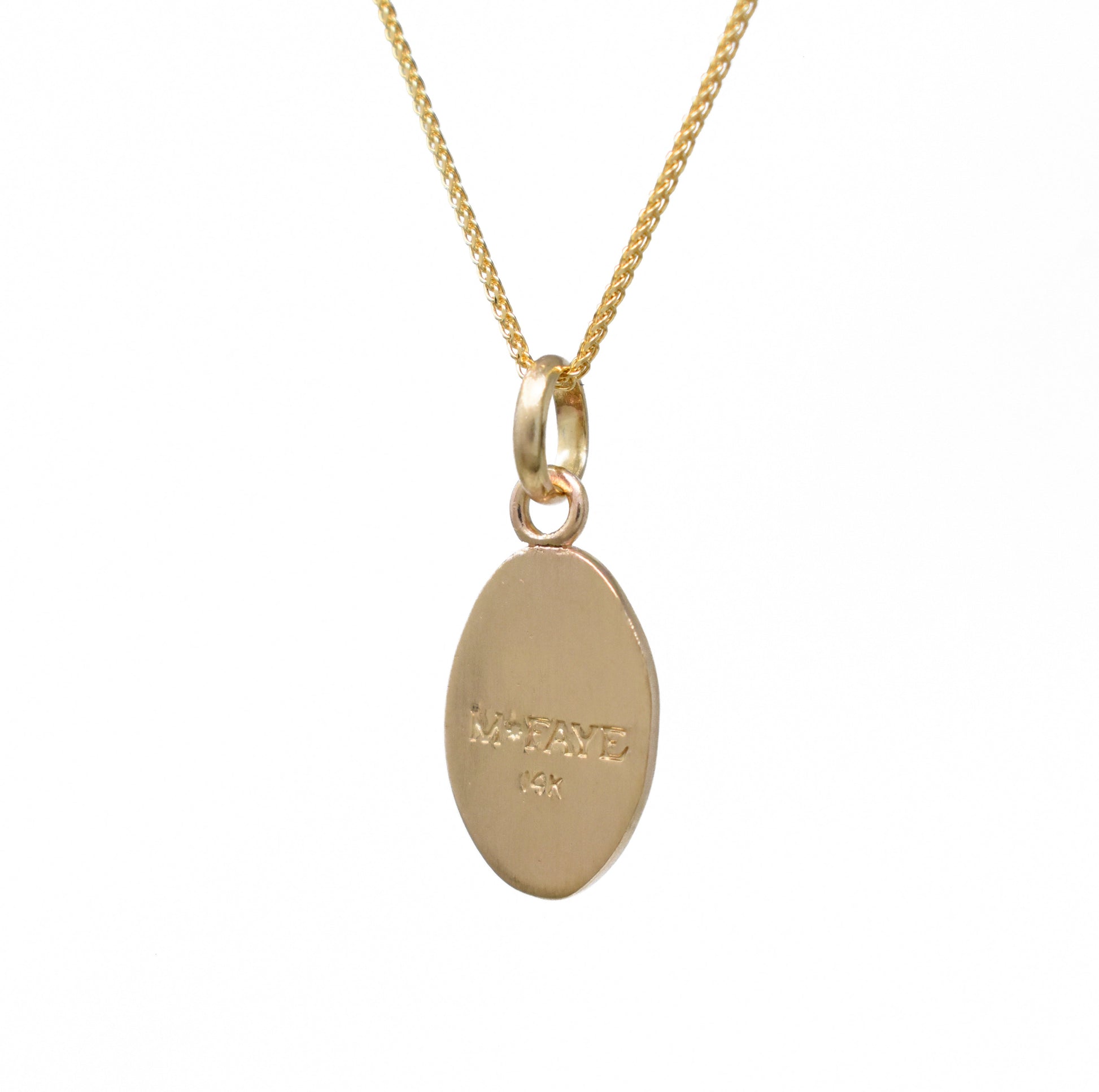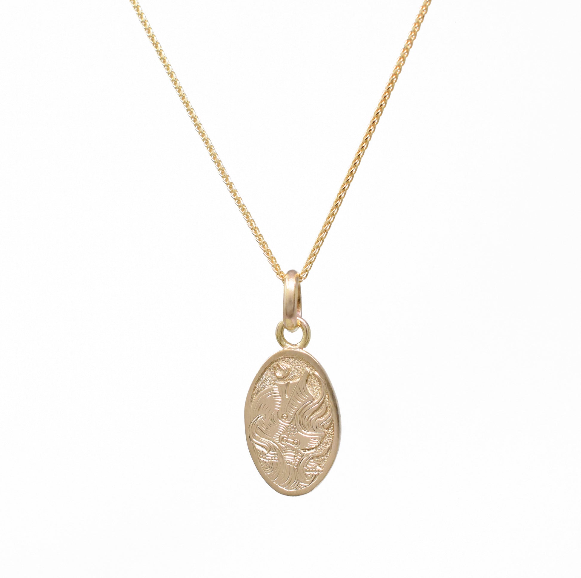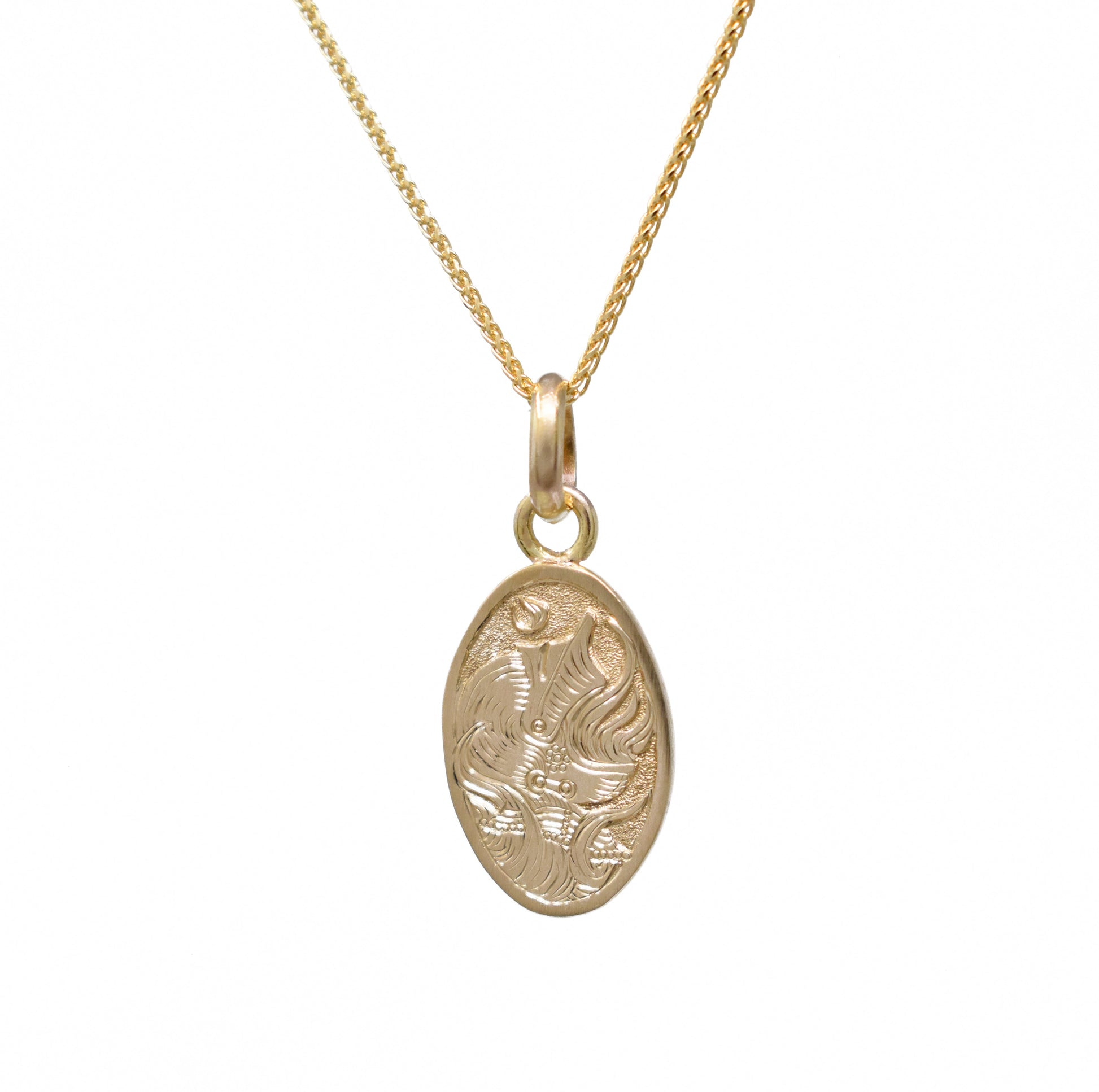 Solid 14k gold hand-fabricated, hand-engraved medallion featuring a burning helm. Pendant is available solo, or strung on a 1mm curb chain, or a 2.5 mm diamond-cut cable chain. More chain options are available here.