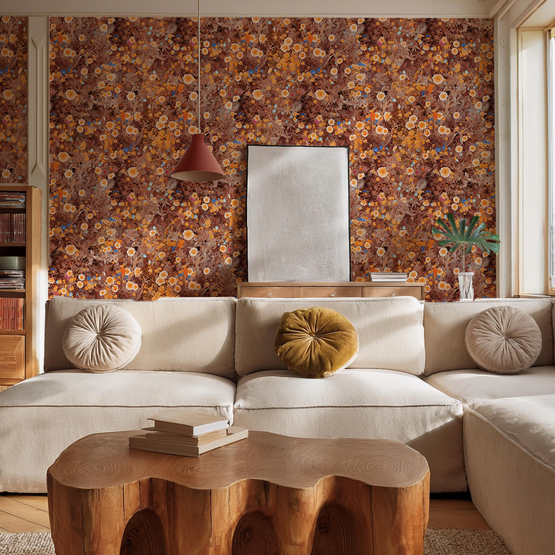 Transform your space with the Cali Flowers Wallpaper, featuring orange citrus hues and beautiful artwork by Samantha Santana. Inspired by the native springtime blooms in her Pasadena front yard, this wallpaper adds a touch of nature and art to any room. Elevate your décor with this unique and vibrant wallpaper.
