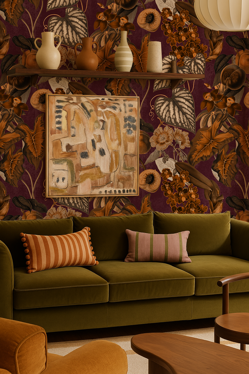 Transform your space into a luxe, tropical paradise with our Cali Tropicale Wallpaper. Designed by Samantha Santana, this eggplant and toffee wallpaper features a stunning collage of vintage botanical illustrations. Its versatile installation options - peel and stick vinyl or traditional pasted - make it easy to customize and remove. Elevate your decor today.