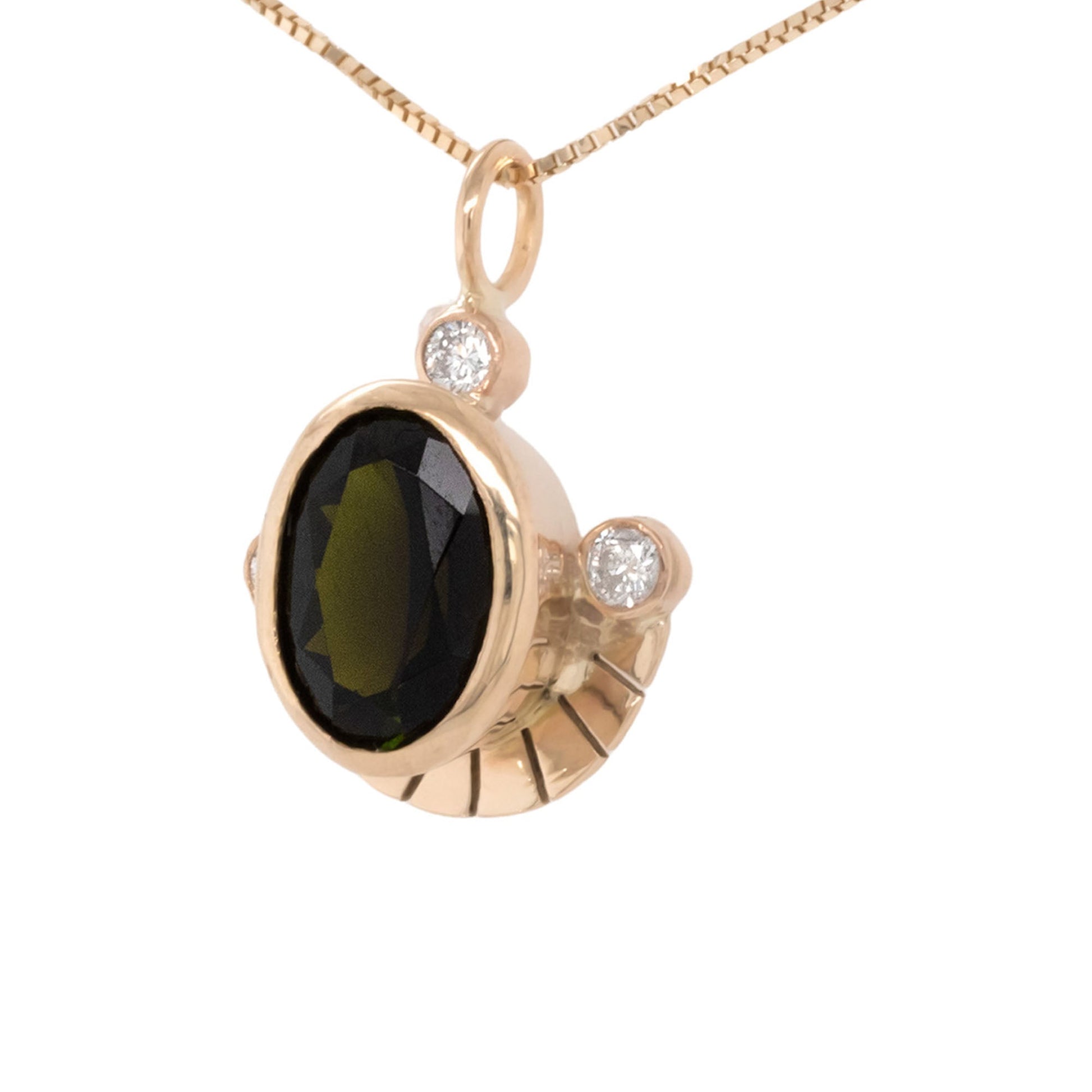 Large deep green sparkling tourmaline from California, is set in a heavy yellow gold bezel. The pendant is highlighted by three brilliant white diamonds and a halo of serrated gold. This pendant hangs from an 18" box chain