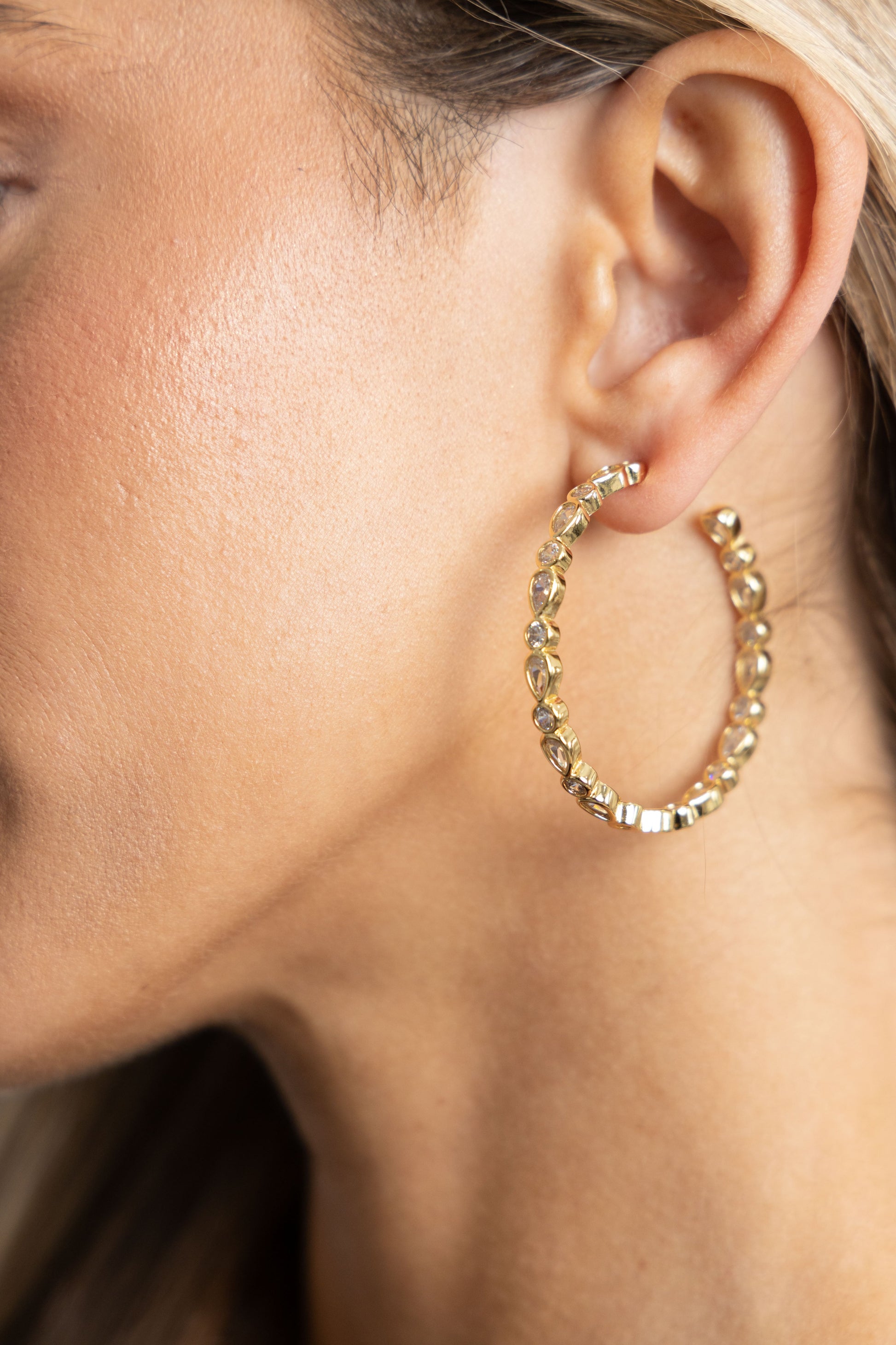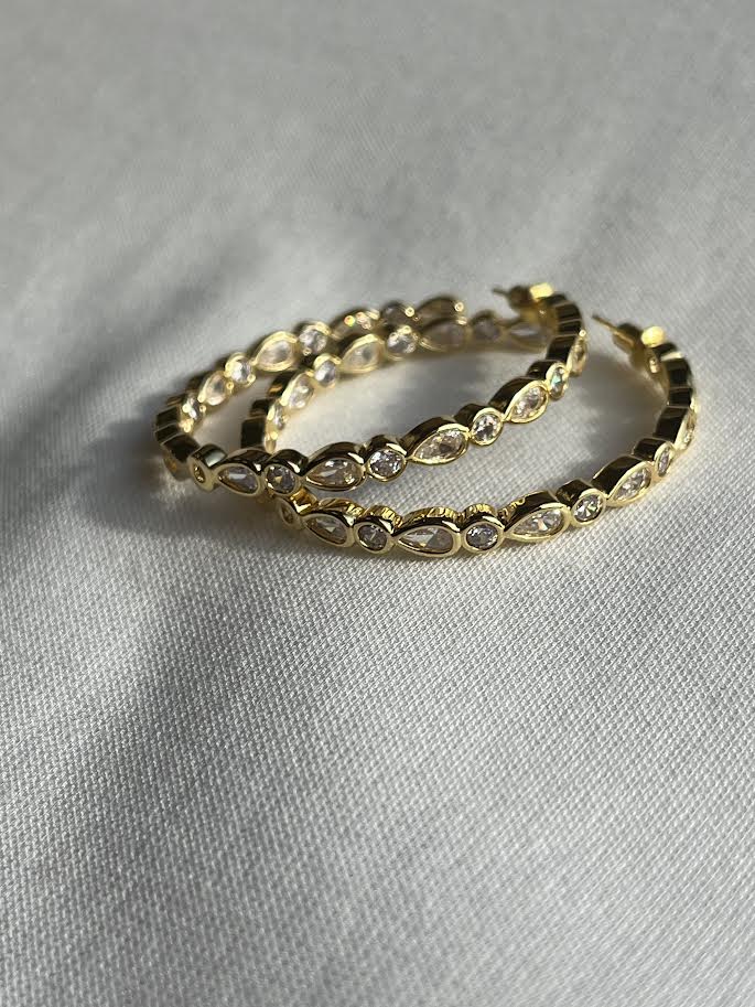 Add effortless luxe to your look with the Cassidy Hoop earrings. Hand-crafted with Cz Stones in teardrop and round shapes, these earrings blend sophistication and glamour to give you an enviable look. Wear them day or night for a stunning effect that's sure to turn heads!