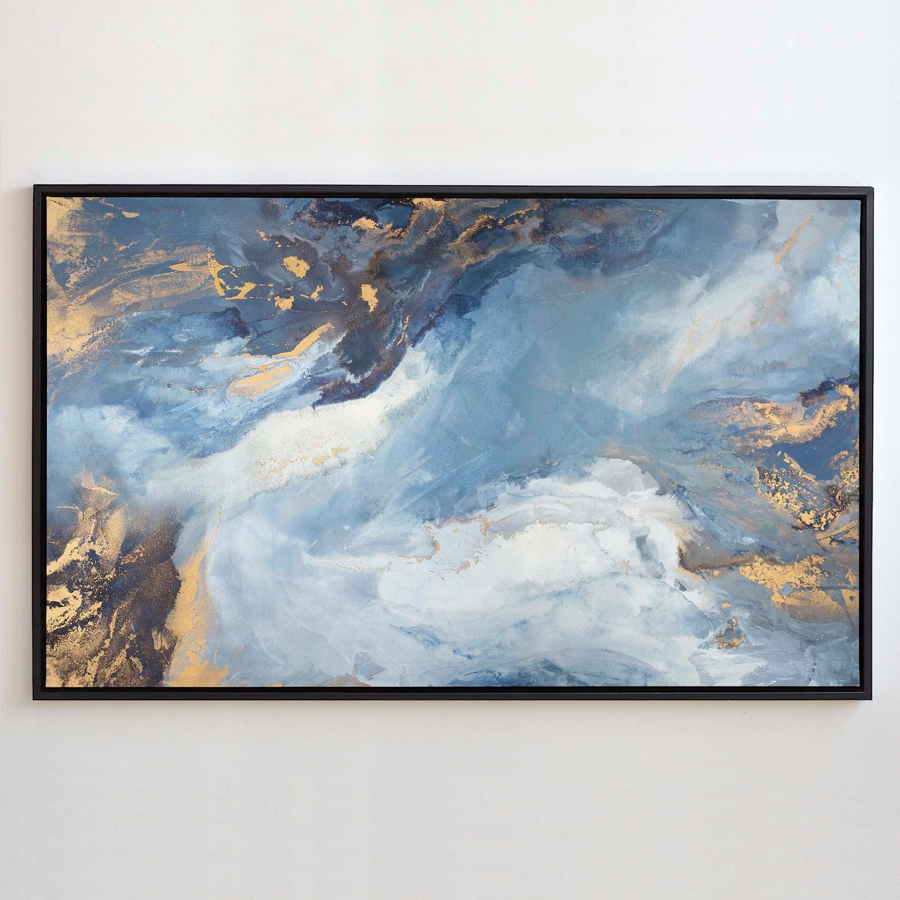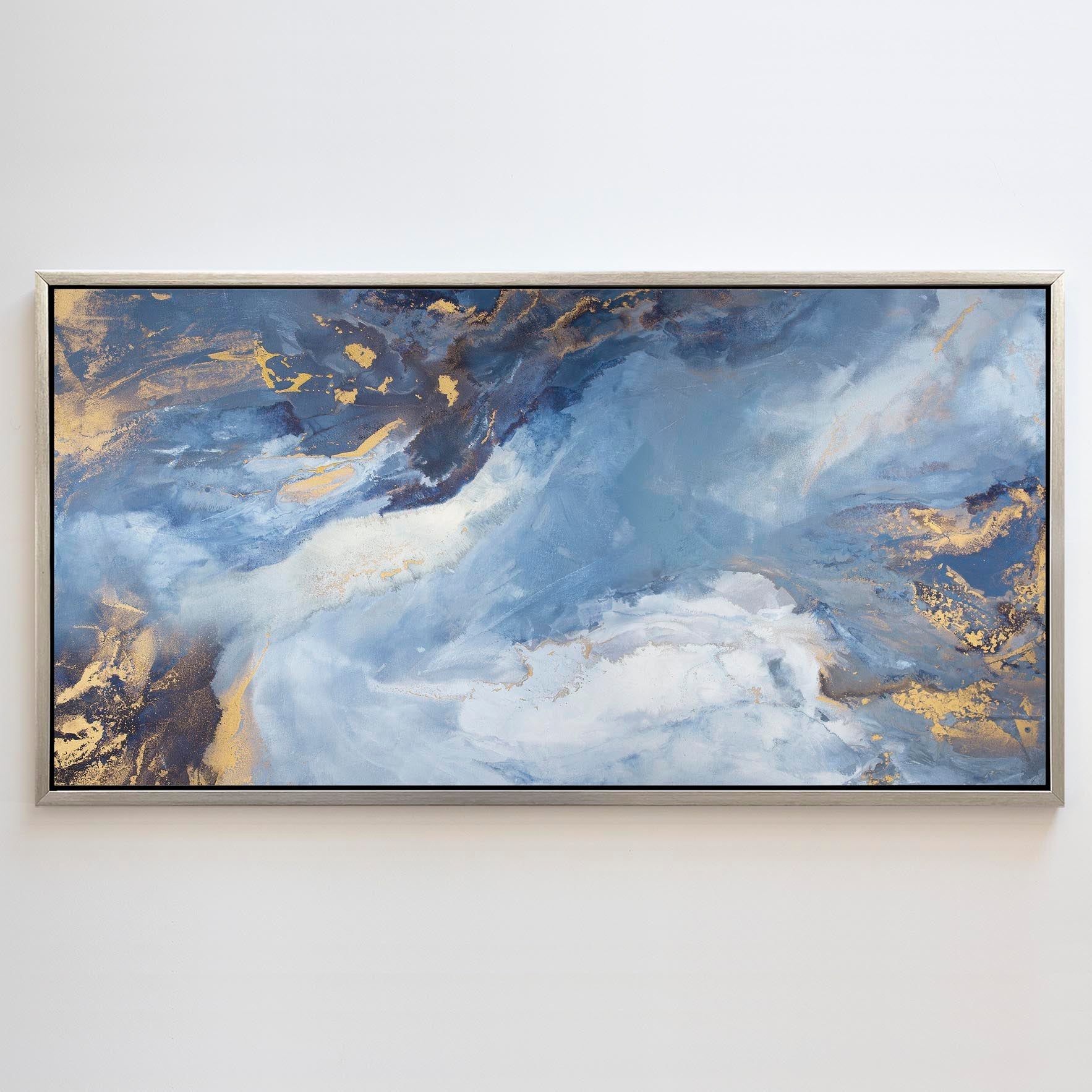 As if looking up toward the heavens, let yourself drift away to wherever your imagination takes you. This fluid composition is filled with blue tones mixed with gold and cream.