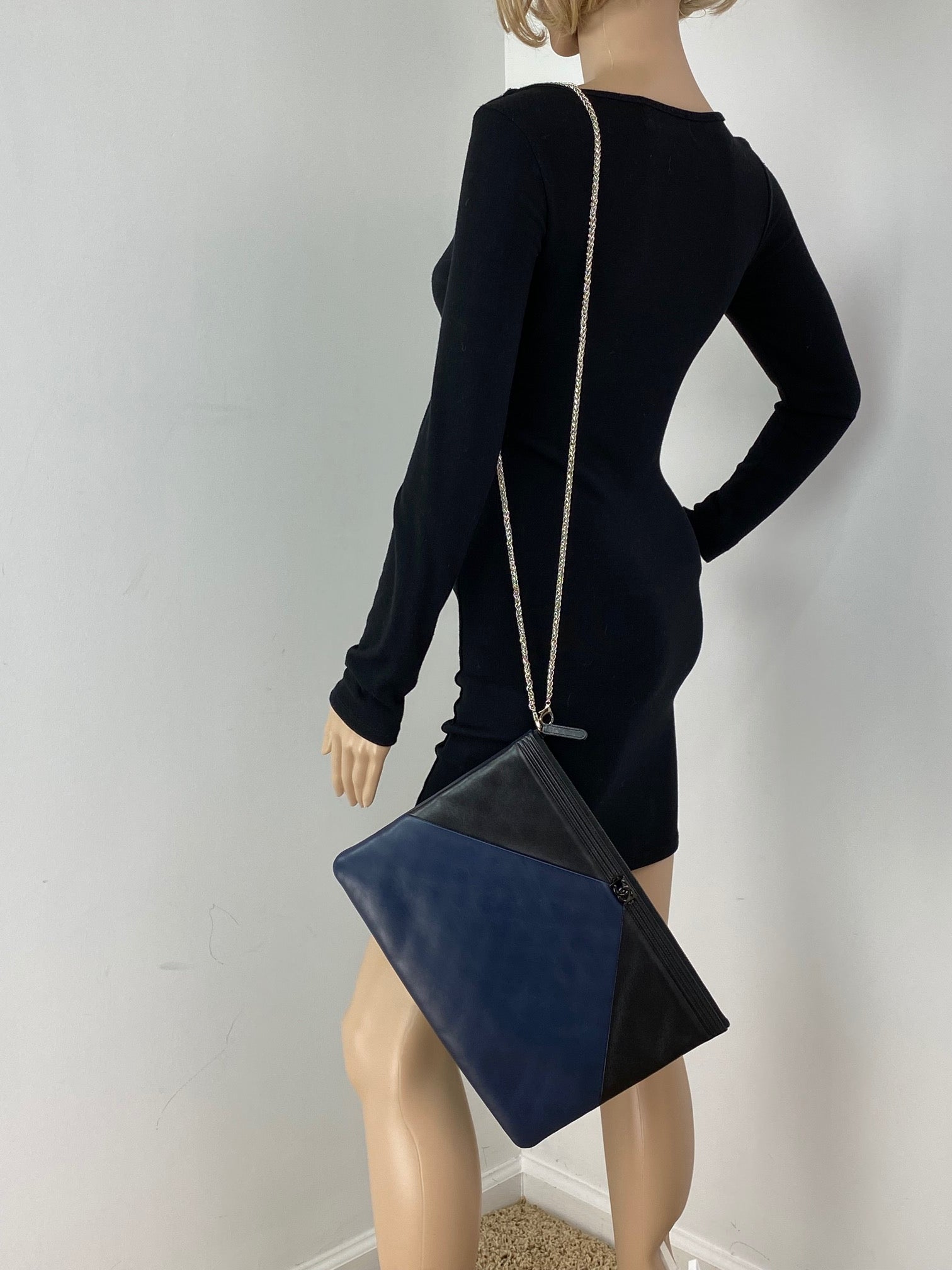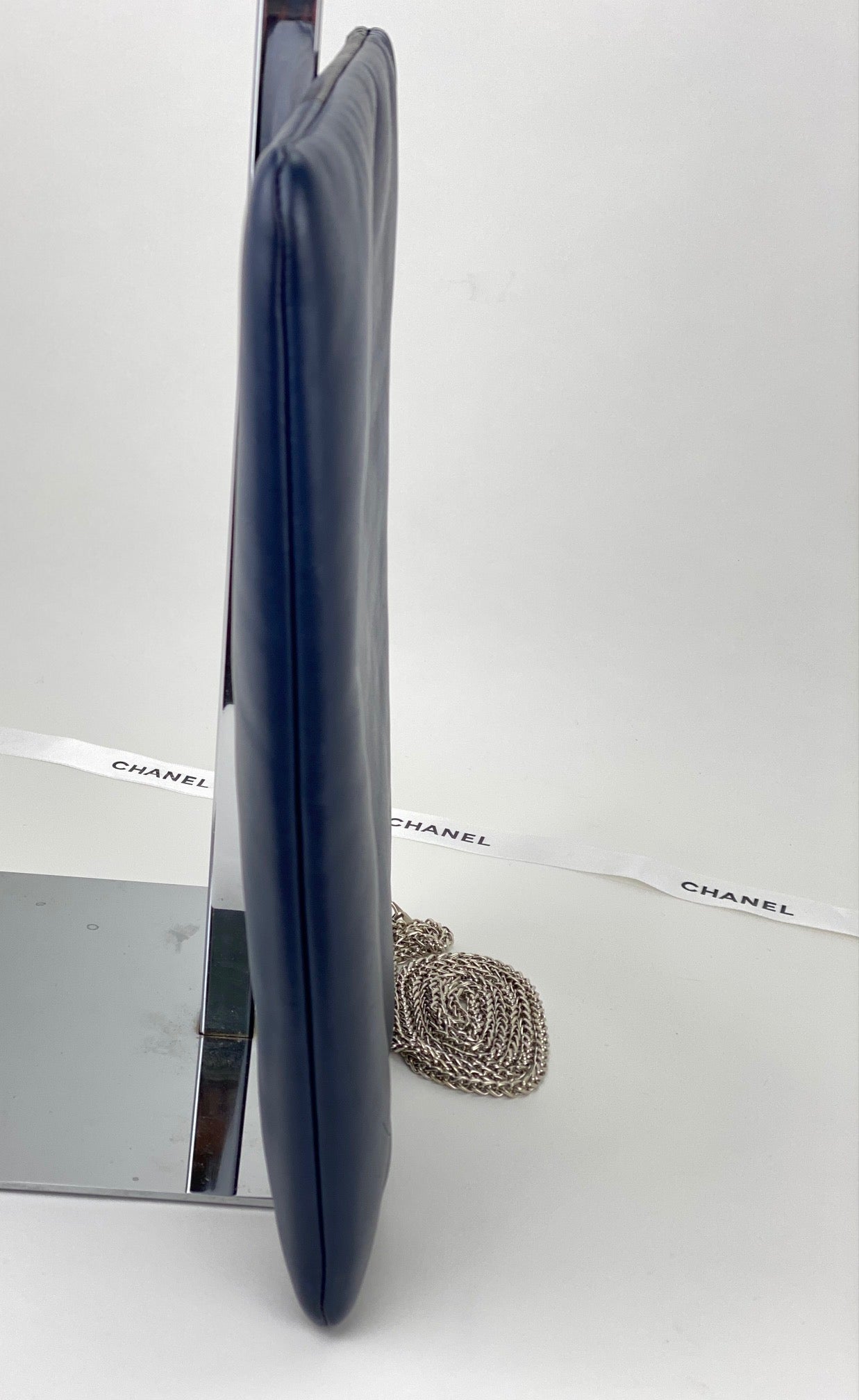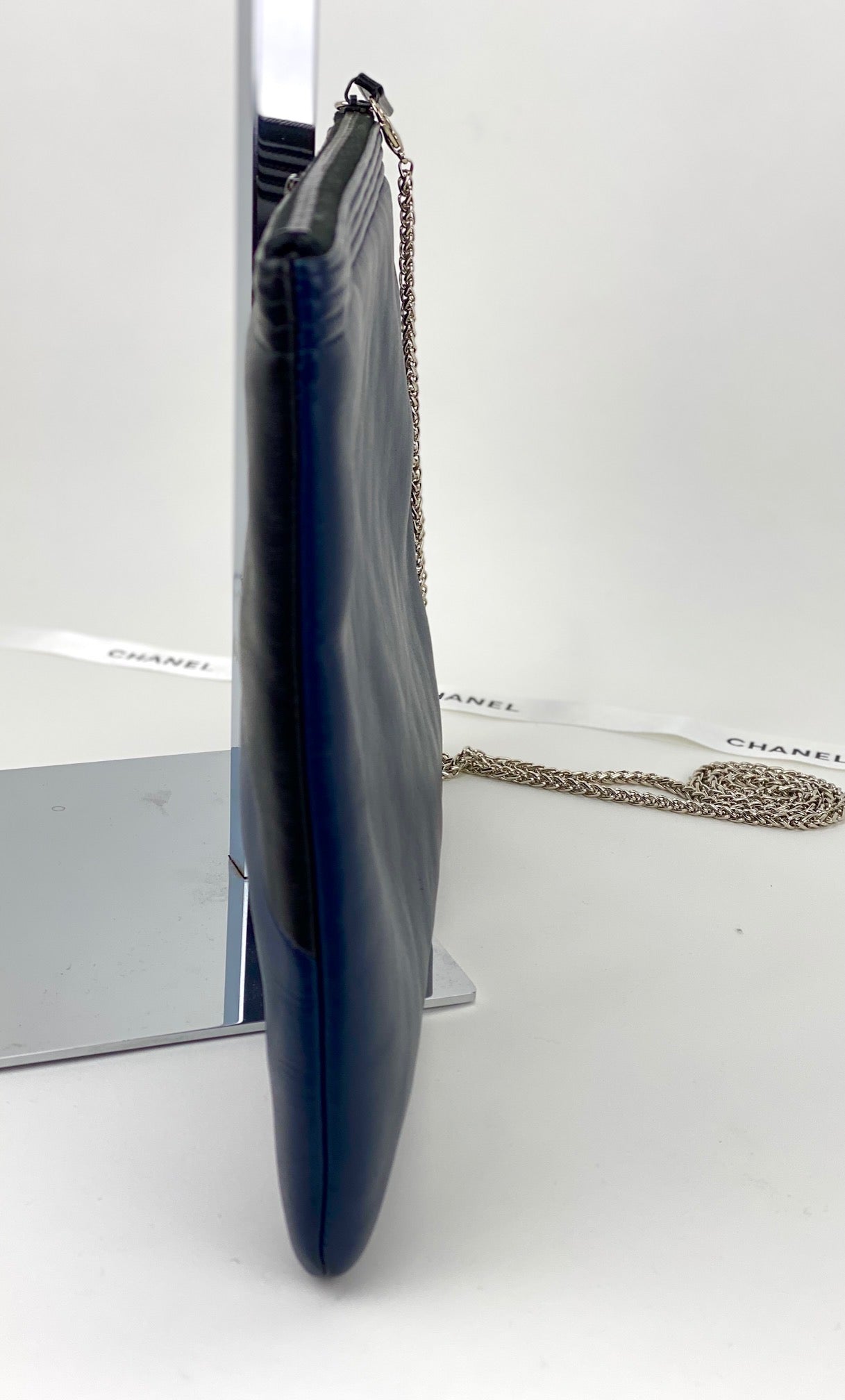 Chanel Quilted Lambskin Leather Black Blue Large Boy Zip Pouch Added Chain