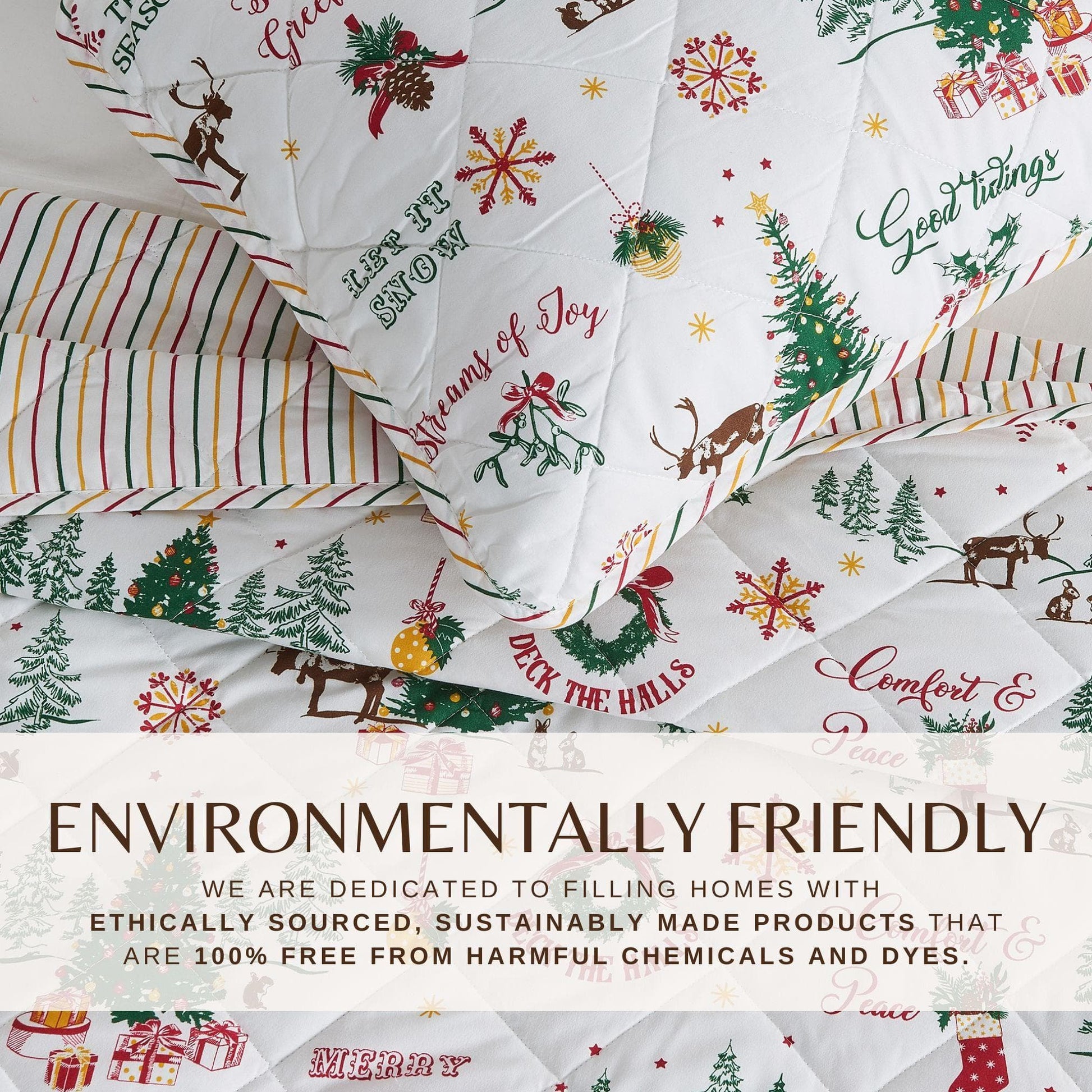 Prepare your bedroom for the festive season with this cheerful holiday quilt collection. With vibrant holiday prints to choose from, this quilt set adds a lively and joyous touch to your seasonal decor. The bright, colorful designs capture the fun and spirit of the holidays, making your space warm and inviting. Crafted for durability, the quilt is easily machine washable, ensuring it stays fresh and vibrant throughout the busy holiday season. Offering lightweight warmth, it’s perfect for layering, providing an extra layer of coziness. Celebrate the holidays in style and comfort with this comforting quilt set.