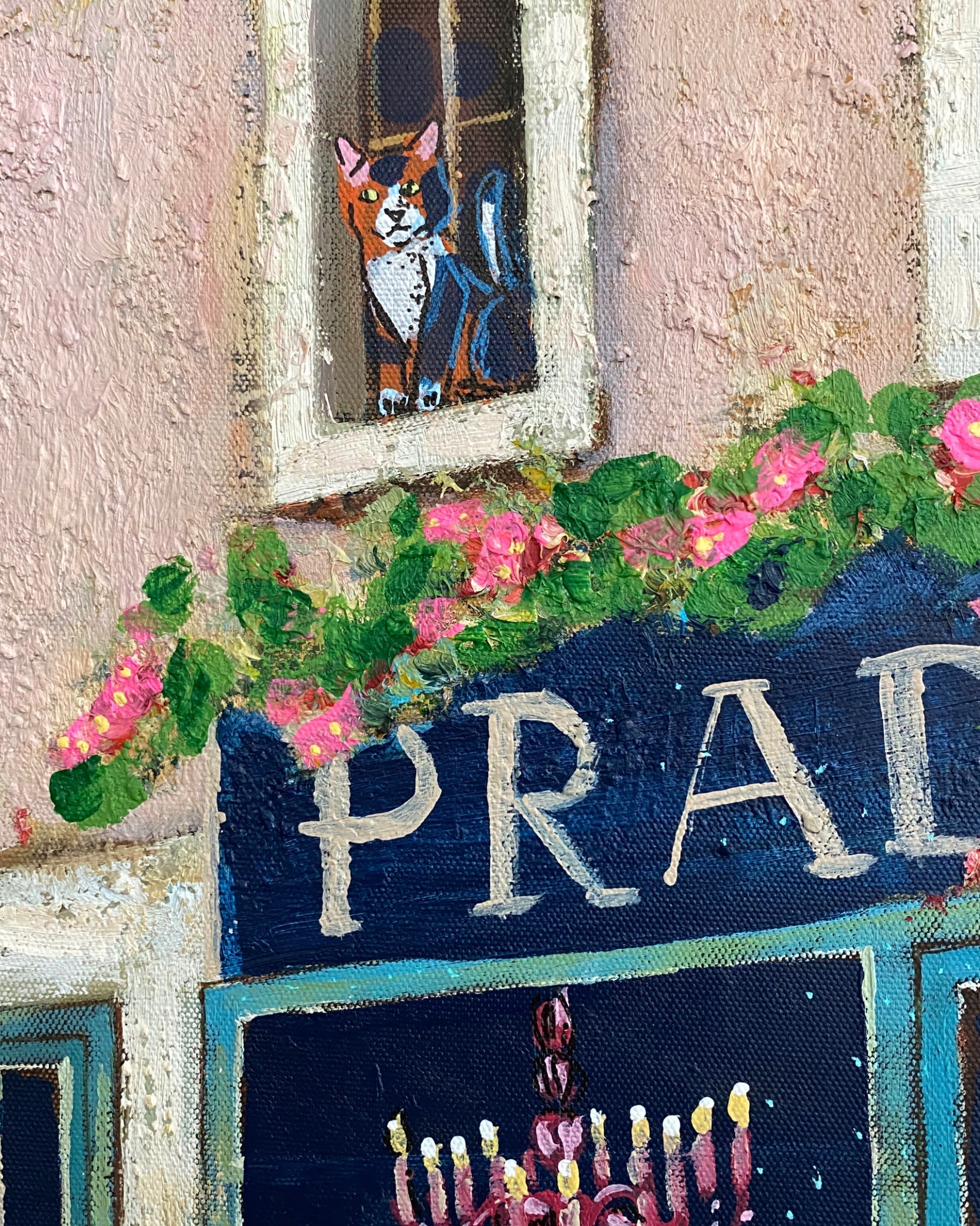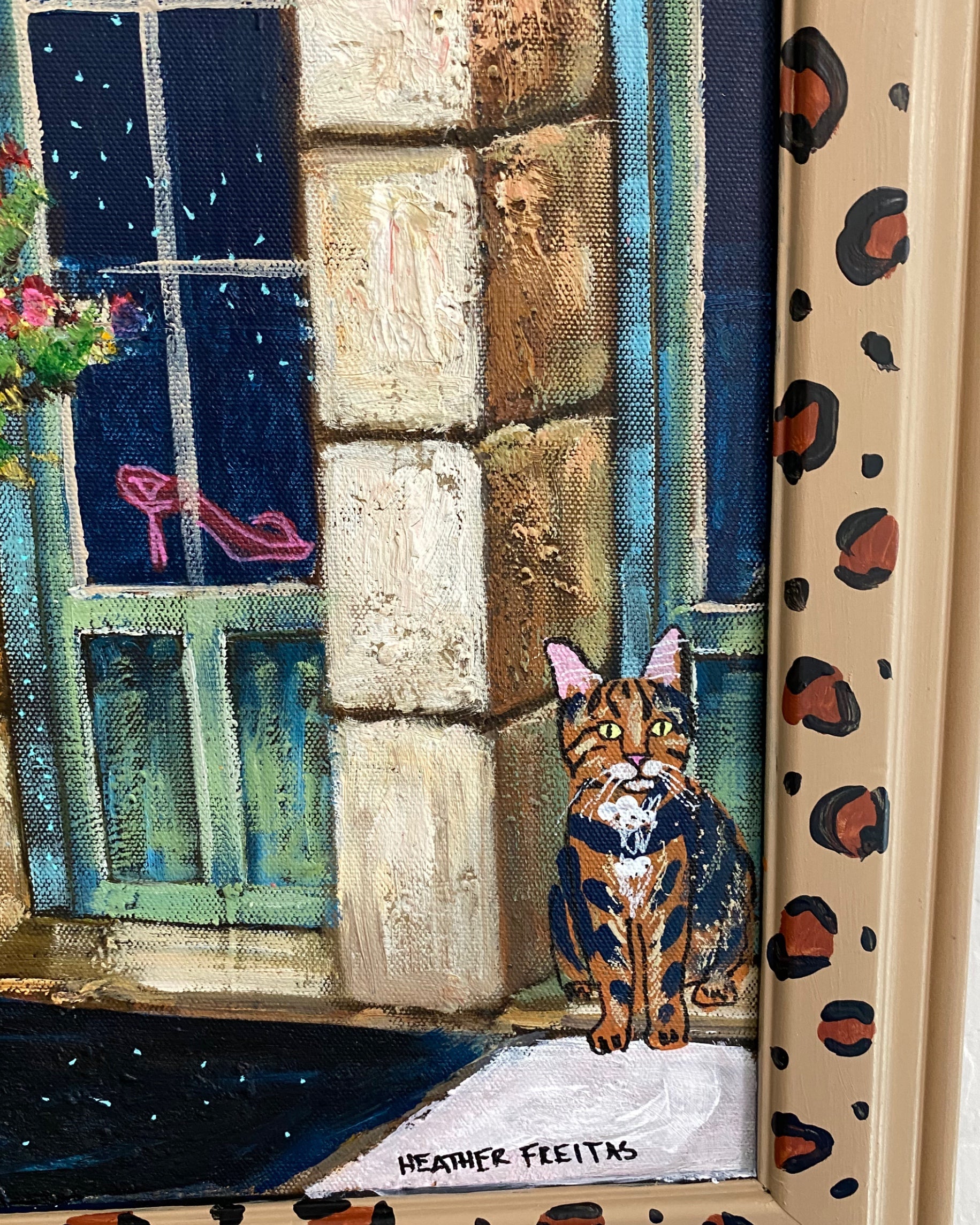 This original painting is mixed media over a found thrifted print and measures 23 x 27 inches. Comes with hand painted frame.