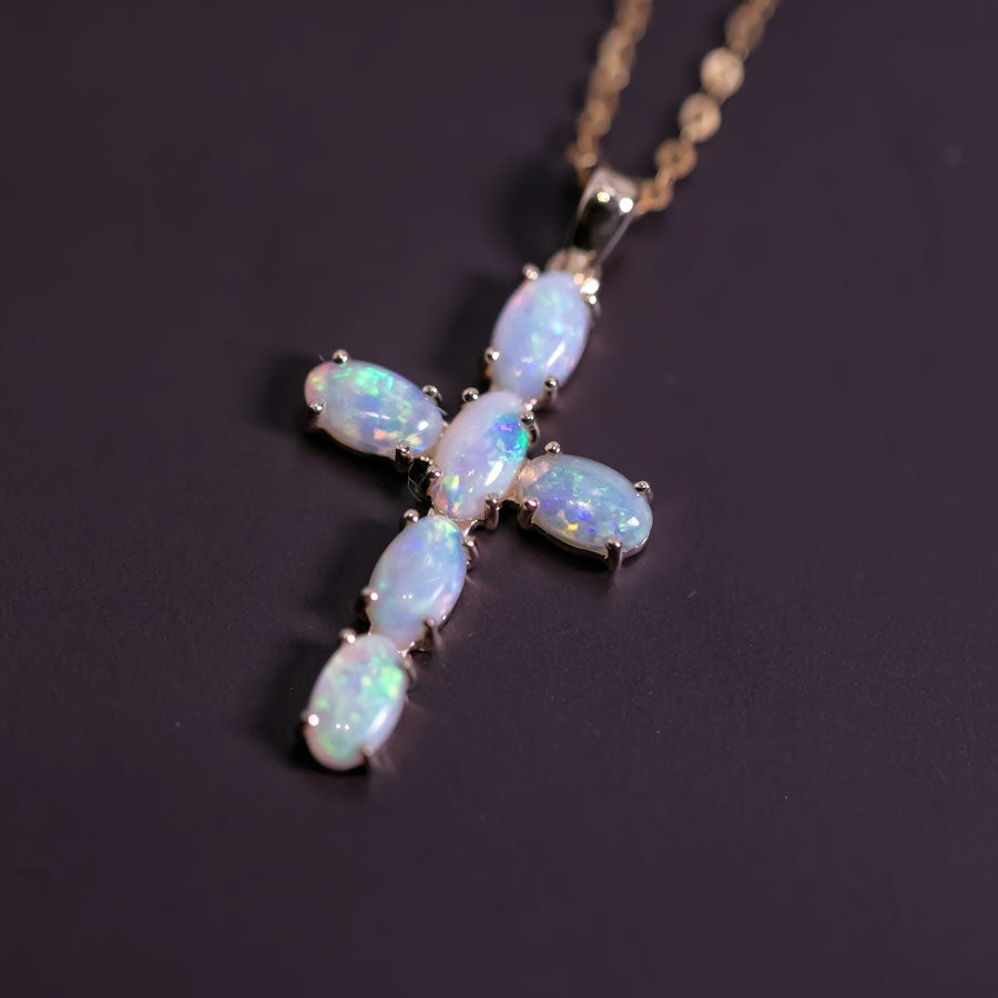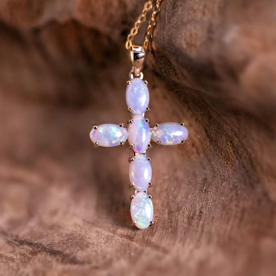 Cross Pendant Australian Solid Opal Necklace 14K Yellow Gold.