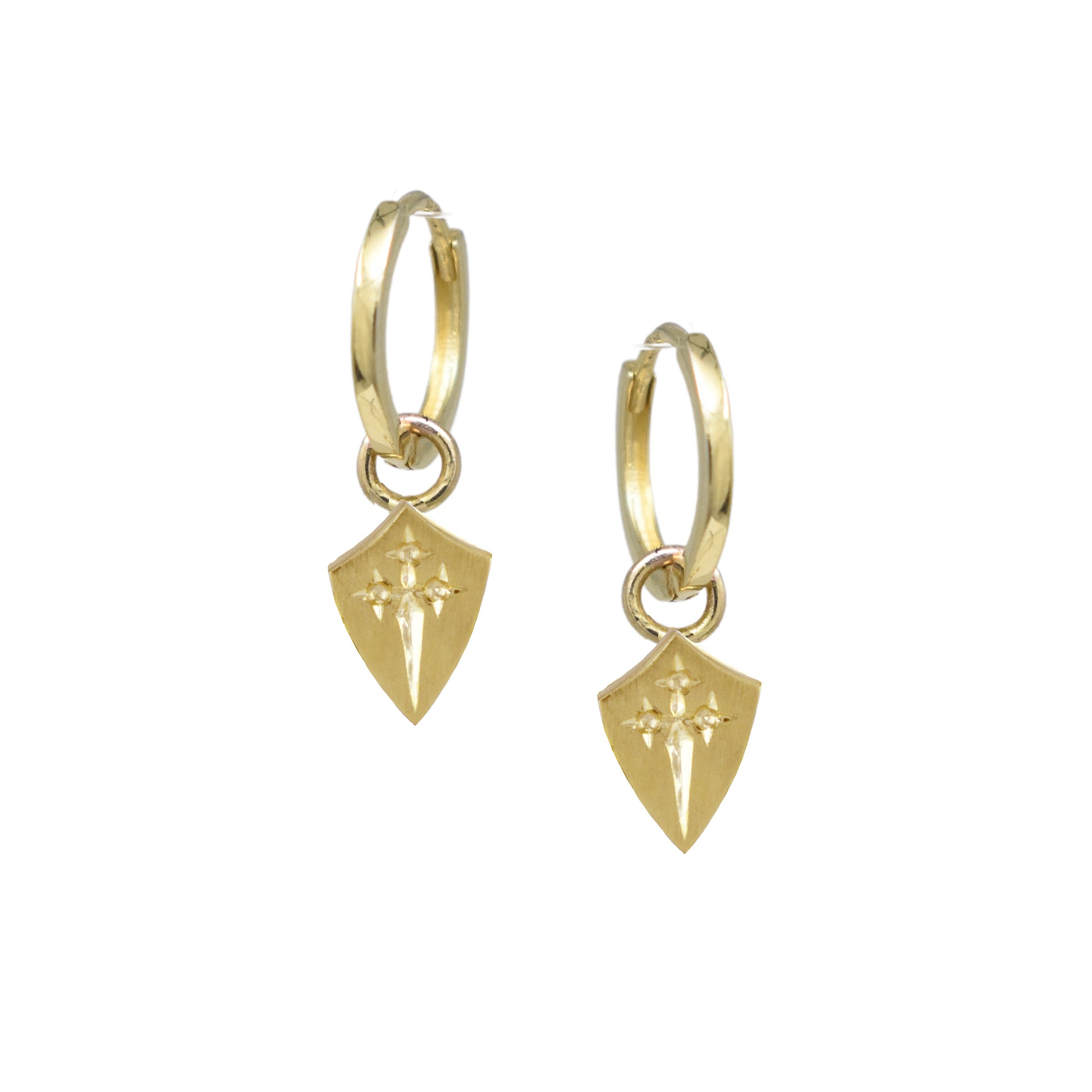 The sweetest mini escutcheon huggies featuring a hand-engraved intaglio daggers.