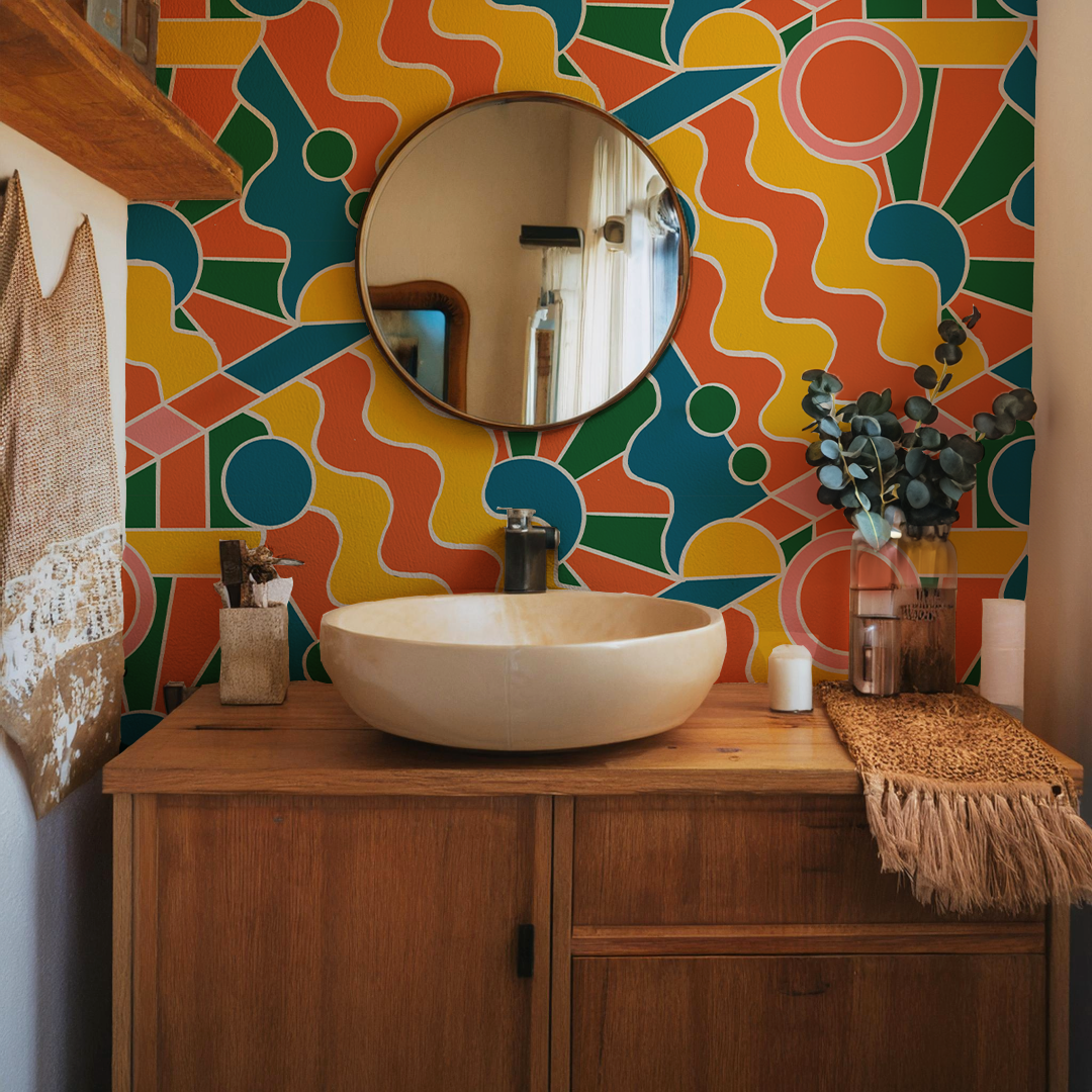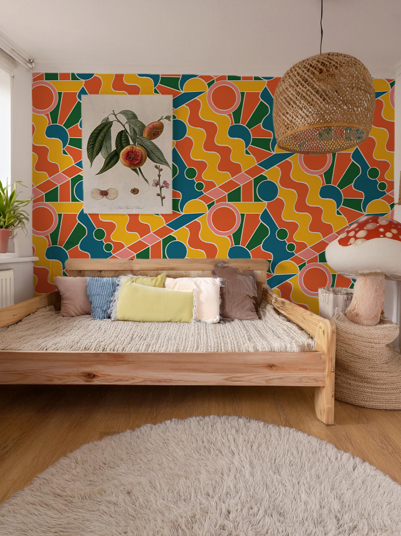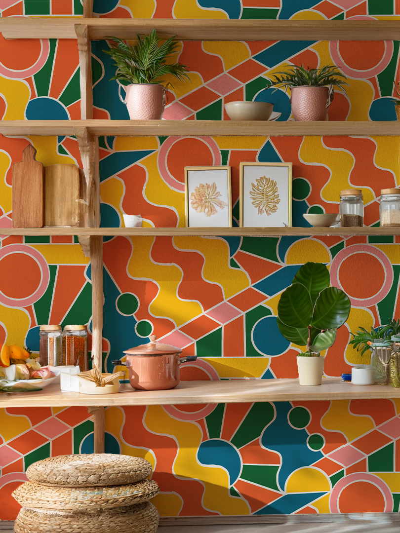 Get ready to add a pop of funky, fun, bold, and colorful retro stained glass to your walls with Day Trippin' Wallpaper! Designed by Samantha Santana, this wallpaper is available in both peel and stick vinyl and traditional pasted options, making it easy to install. And the best part? It's completely removable!