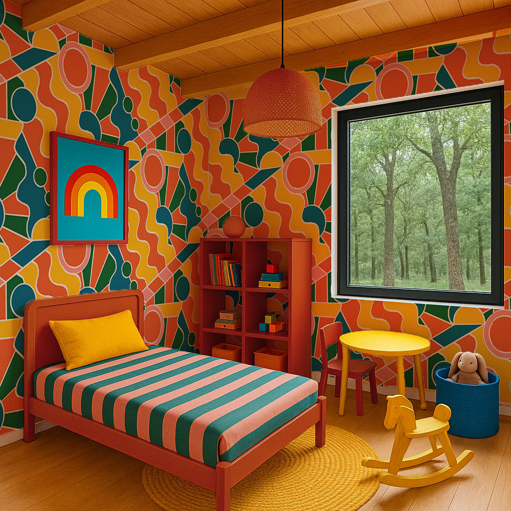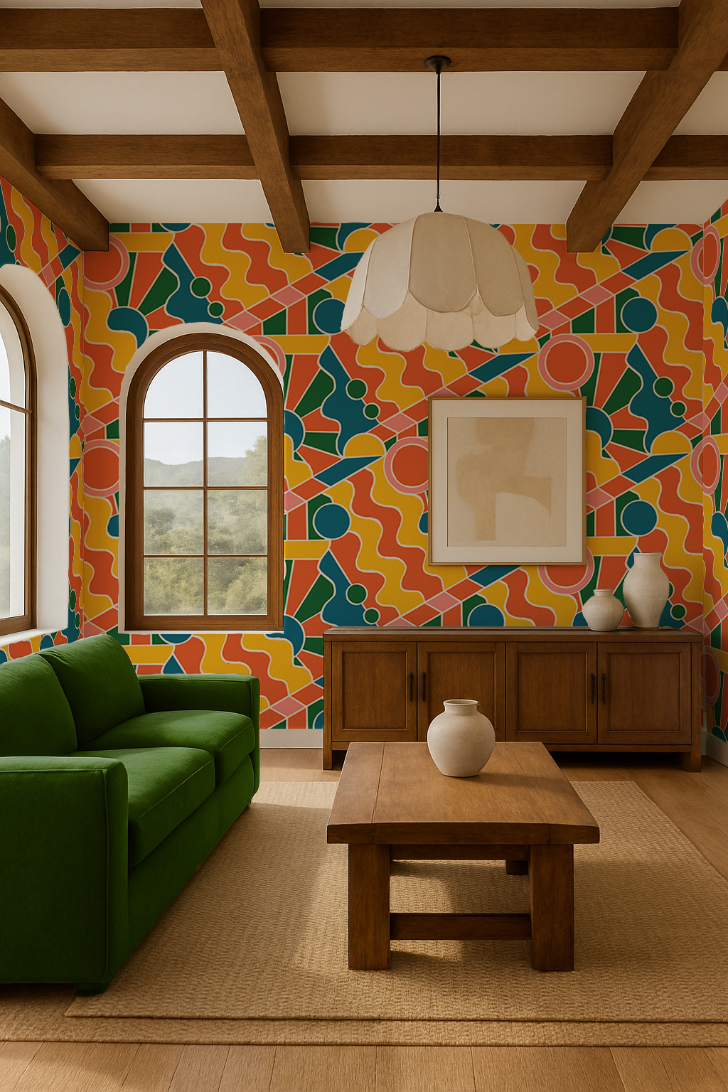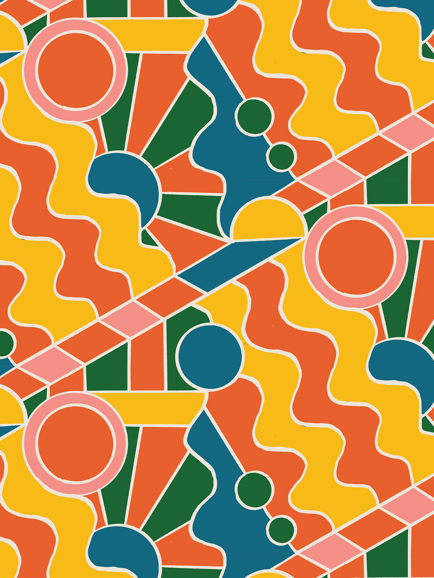 Get ready to add a pop of funky, fun, bold, and colorful retro stained glass to your walls with Day Trippin' Wallpaper! Designed by Samantha Santana, this wallpaper is available in both peel and stick vinyl and traditional pasted options, making it easy to install. And the best part? It's completely removable!
