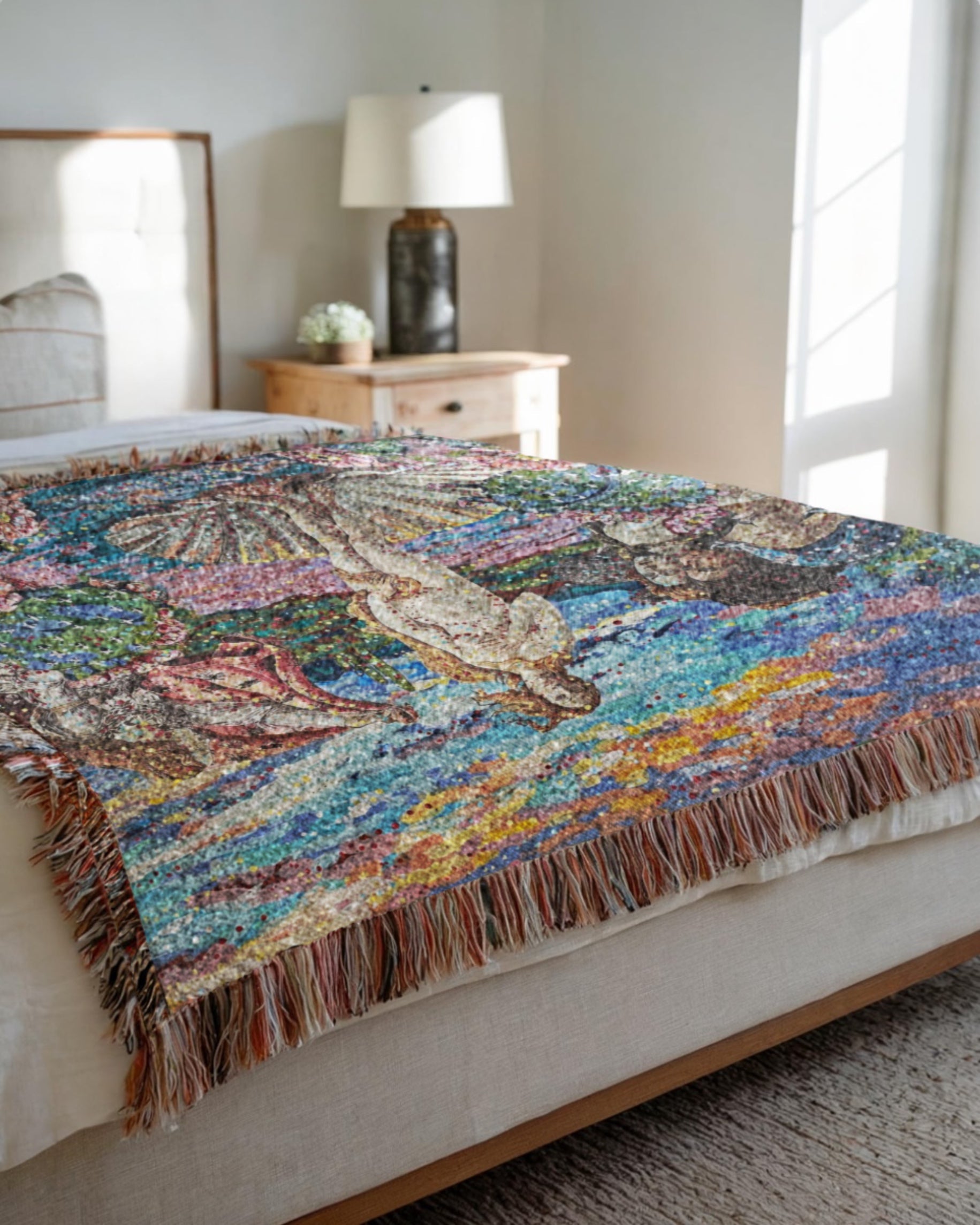 Woven with rich texture and timeless charm, this jacquard throw features original artwork by Heather Freitas, transformed into a keepsake meant to be lived with and loved. Whether folded at the foot of your bed, draped over a favorite chair, or hung as a tapestry, it adds a touch of nostalgia to your space—like something passed down, or discovered on a magical antique shop afternoon. A cozy companion for quiet days, storybook evenings, and slow, beautiful living.
