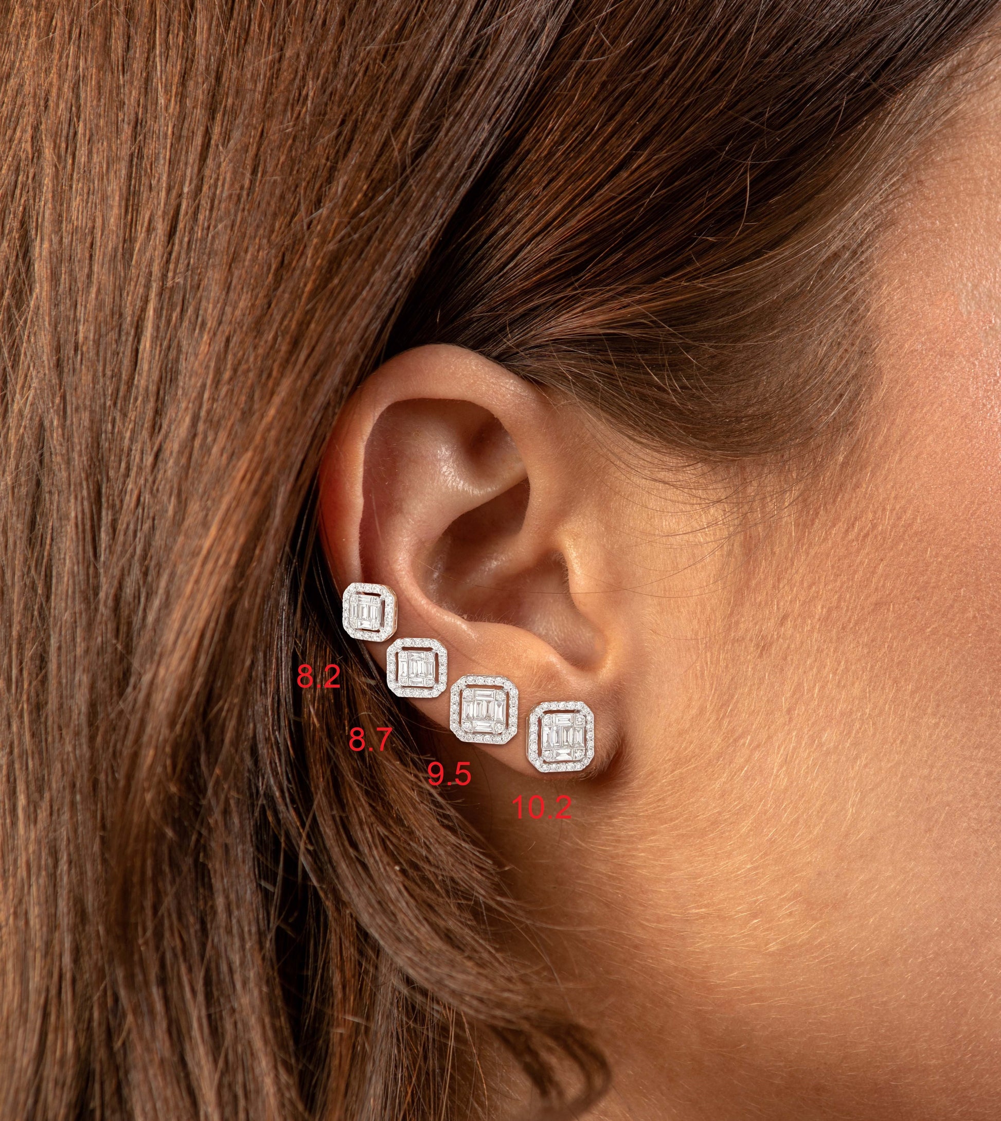 Diamond assher cut cluster stud earrings including baguette and rounds diamonds to create the perfect asscher cut look.