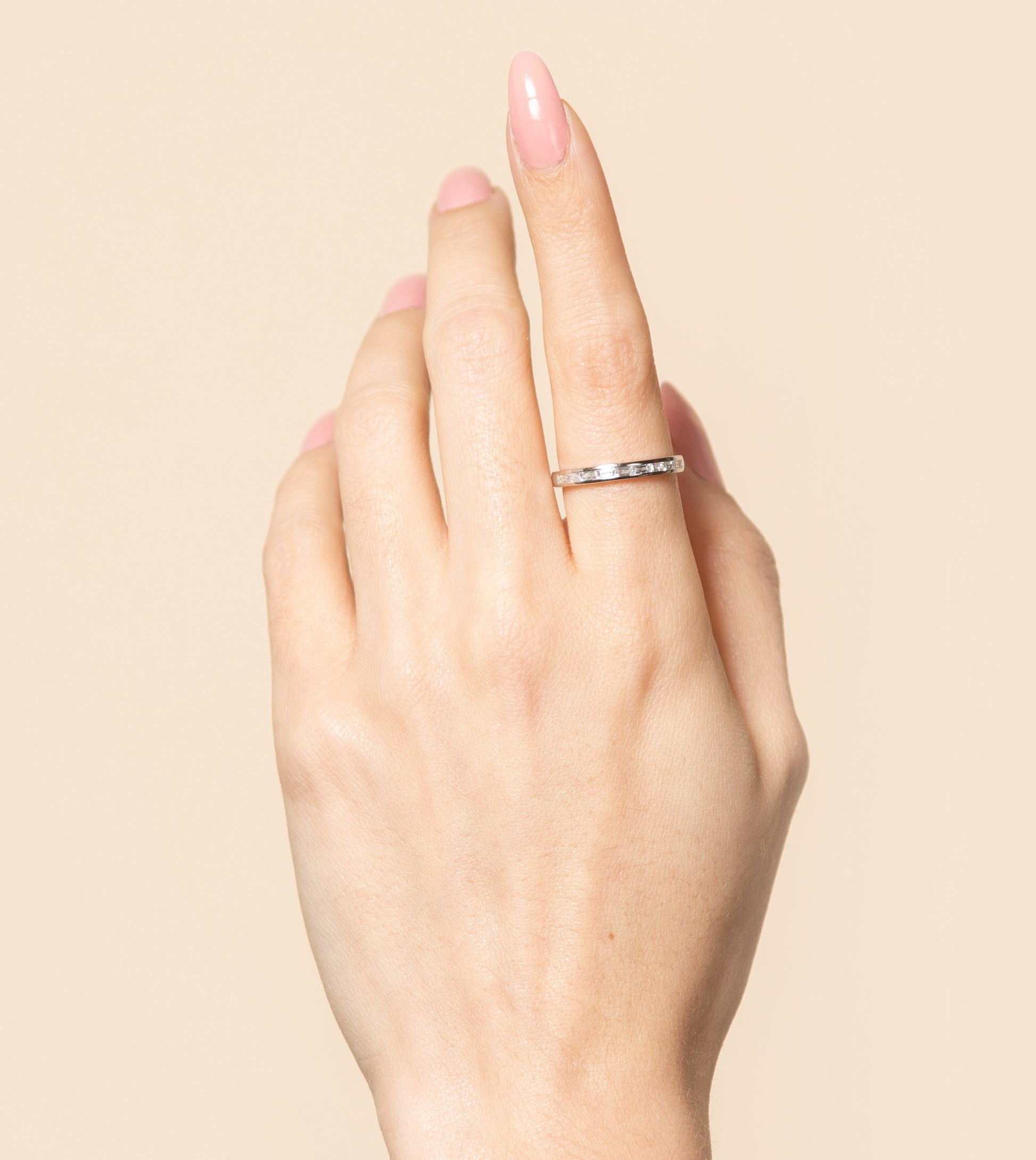 This 14K Gold Diamond Baguette Channel Set Band is the perfect addition to your special day. Its timeless design features tasteful baguette diamonds set in a half eternity style. Feel beautiful and confident wearing this exquisite wedding band.