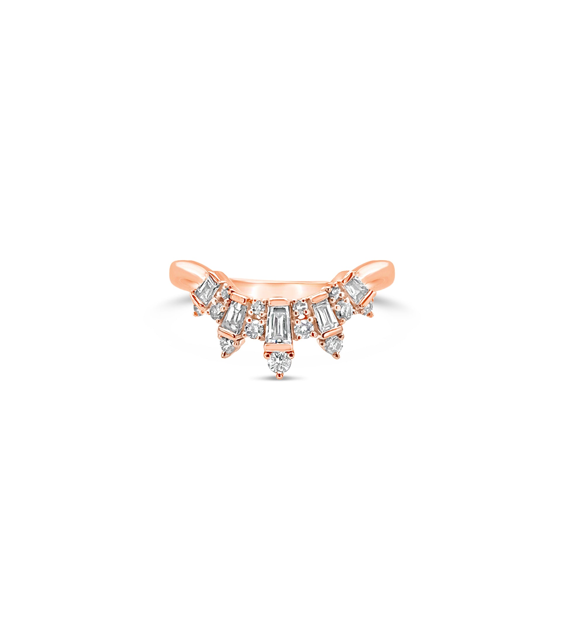 Make a statement with this stunning diamond baguette chevron ring. With a perfect combination of baguette and round rings and a chevron wedding band stack, this eye-catching piece will make an unforgettable impression. Shine brightly!