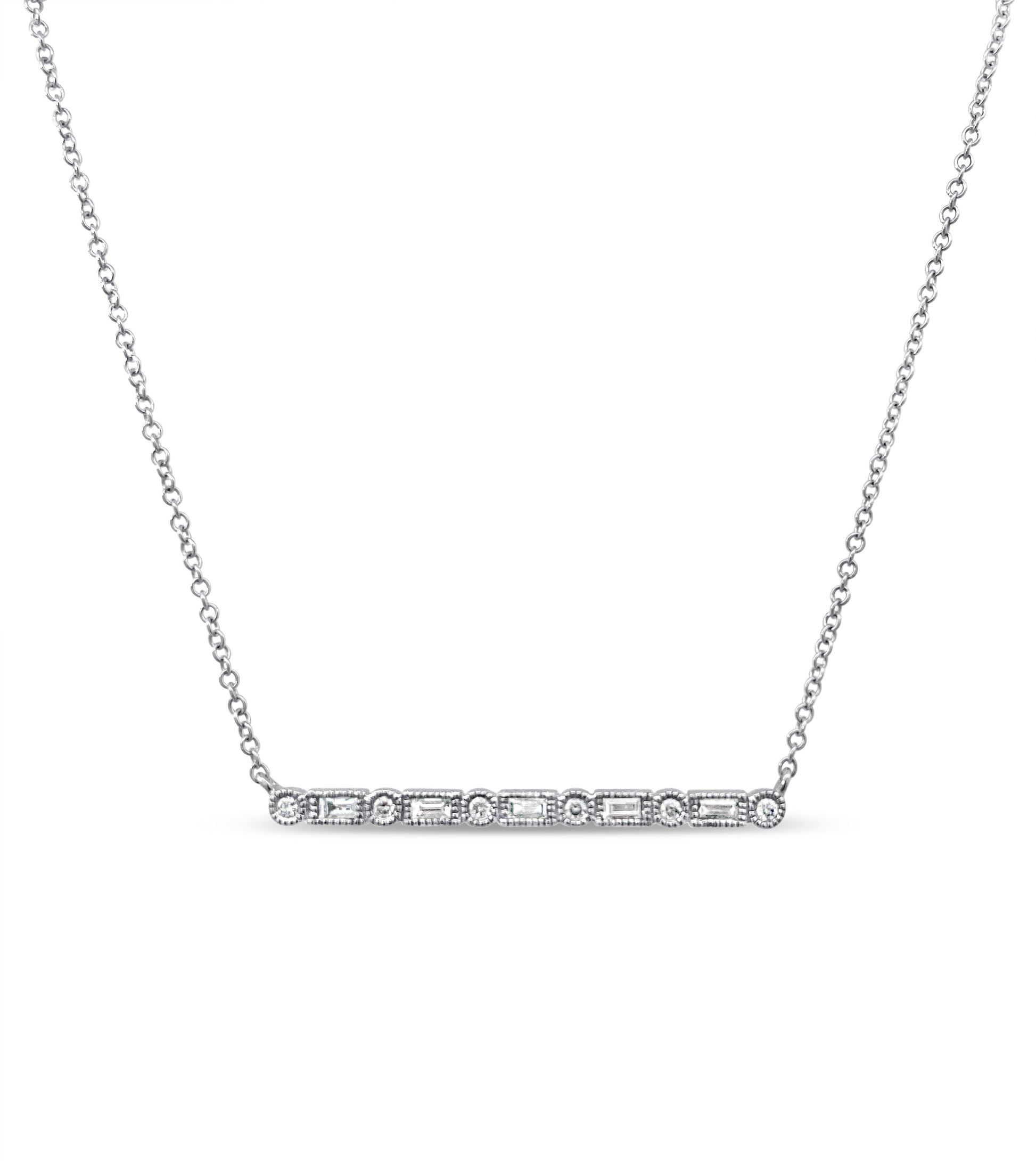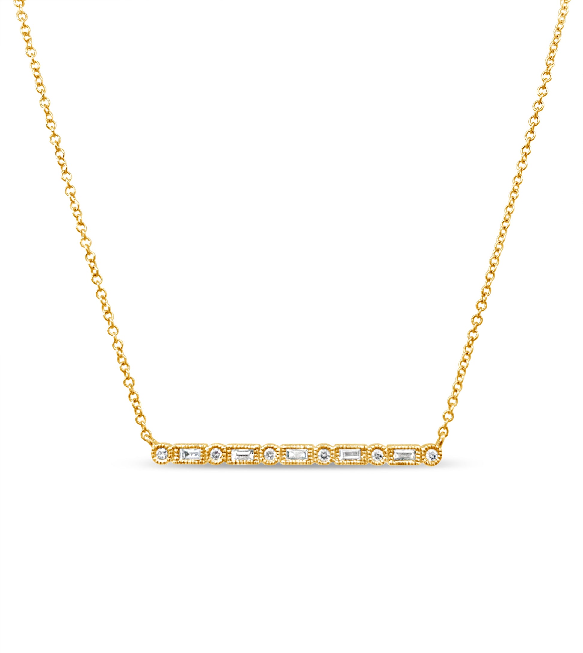 This Diamond Baguette & Round Bar Necklace is the perfect way to make a statement! Crafted with 14k gold and detailed with baguette and round diamonds bezel set in a pendant with an 18 inch adjustable chain, this piece is sure to show off your style with a touch of luxury. Make an unforgettable impression with this eye-catching piece!