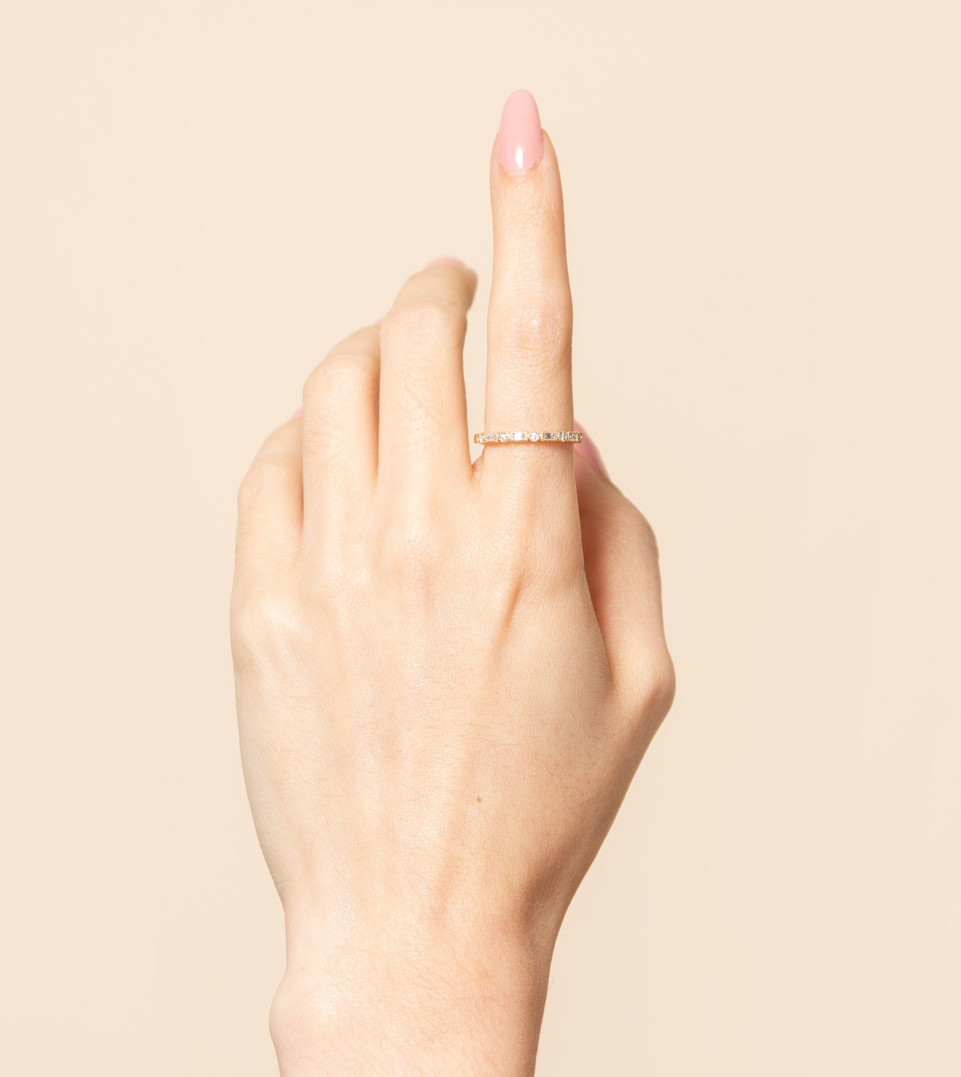 This exquisite Diamond Baguette & Round Bezel Band is crafted from 14k gold and features alternating baguette and round diamond bezel accents. Treat yourself or a special someone to this stunning and luxurious ring!