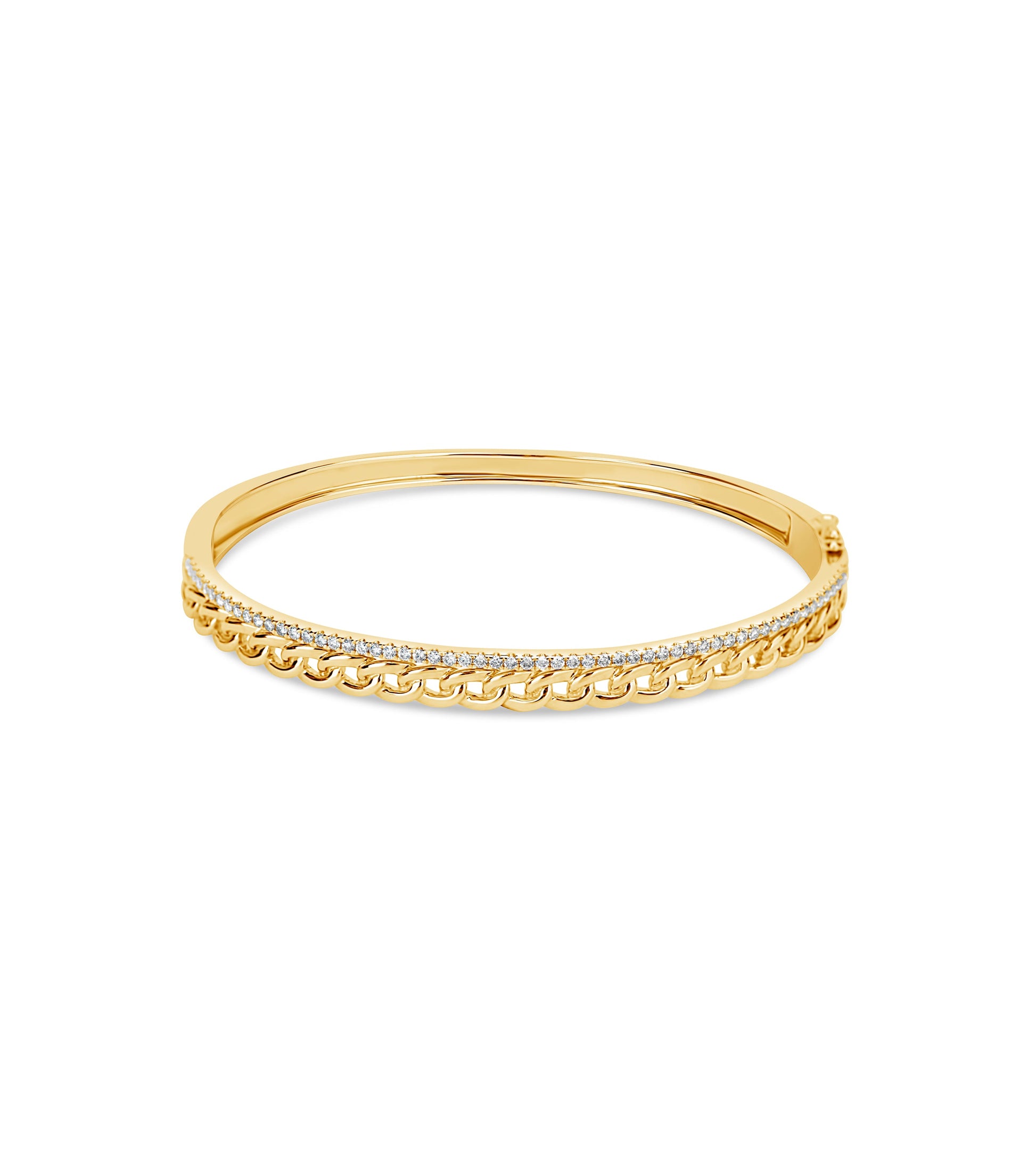 This Diamond Bar and Curb Link bangle is a simple yet luxurious addition to your jewelry collection. Crafted in 14k yellow gold, it wraps elegantly around your wrist to create a timeless look. Carefully sized to fit a size 7, this bangle is perfect for elevating your style with subtle sophistication.