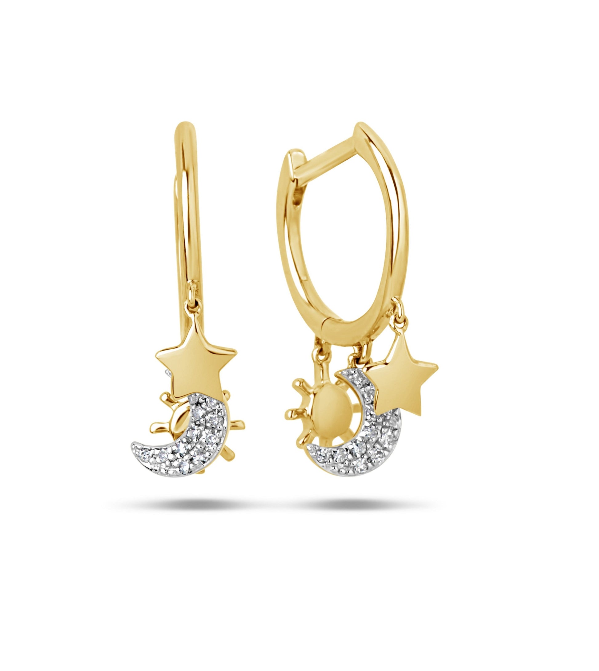 Sparkle like the stars in the sky with our Diamond Celestial Huggie Earrings! Crafted from 14k yellow gold, these earrings feature a dazzling diamond dangle and charming star, moon, and sun design. Elevate any outfit and feel the magic and energy of the universe with these celestial earrings.