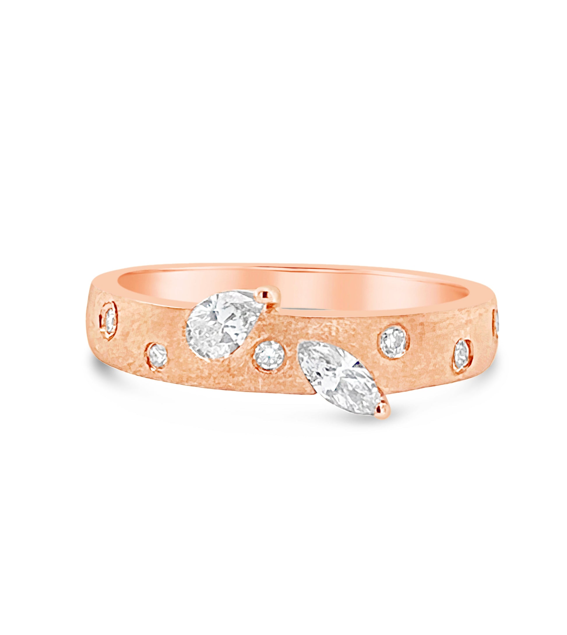 Adorn yourself with the ethereal beauty of our Diamond Celestial Protruding Band. Made with 14k gold and a brushed finish, this ring boasts a unique pear and round shape diamond design. Enhance any outfit and make a statement with this elegant and eye-catching piece.