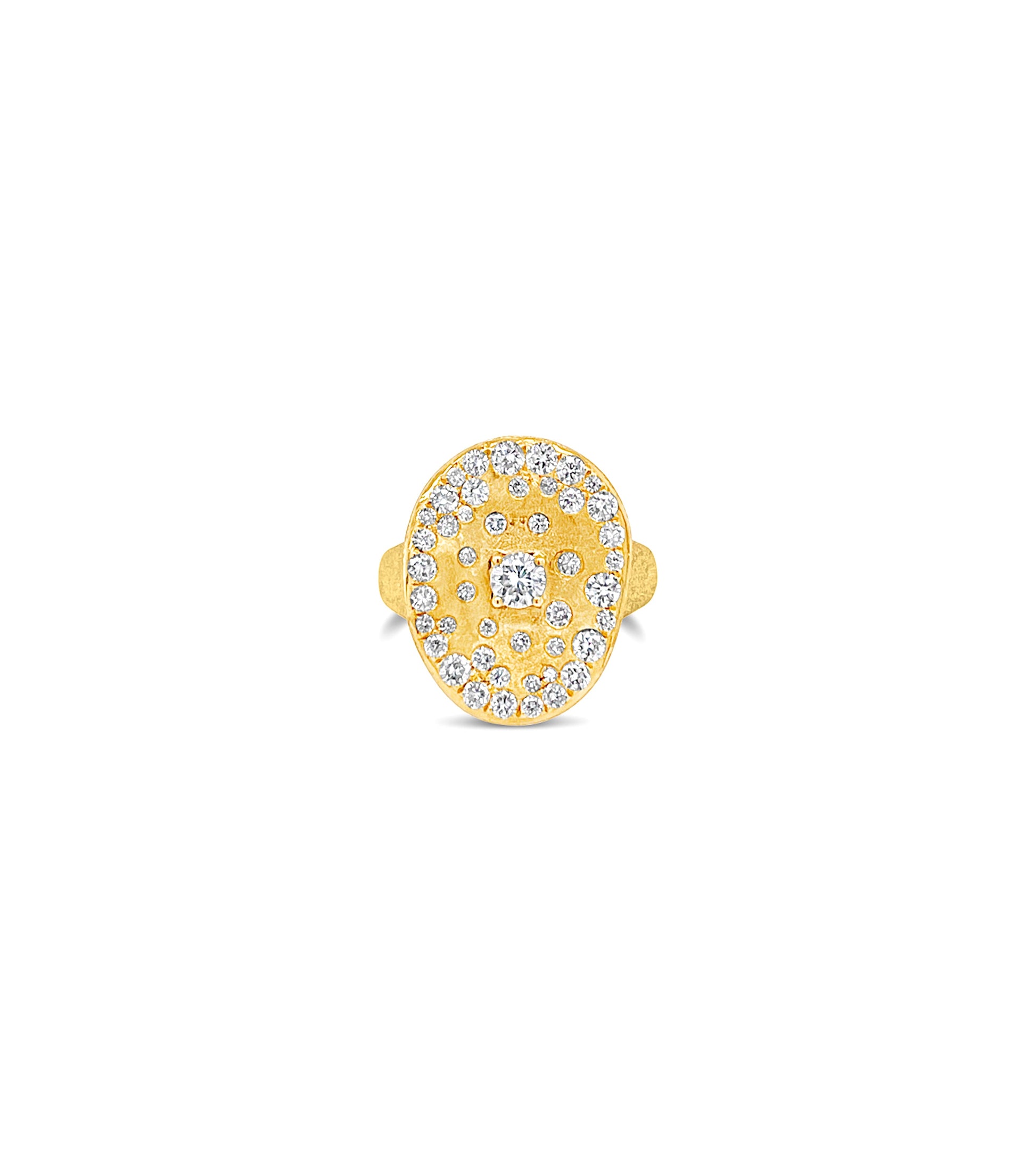The Diamond Celestial Emperor Ring is a stunning work of art. Crafted in 18k yellow gold with a brushed finish, this free form ring exudes elegance and individuality. Scattered diamonds add a touch of celestial sparkle, making it the perfect statement piece for any occasion. Elevate your style with this magnificent ring and embrace your inner royalty!