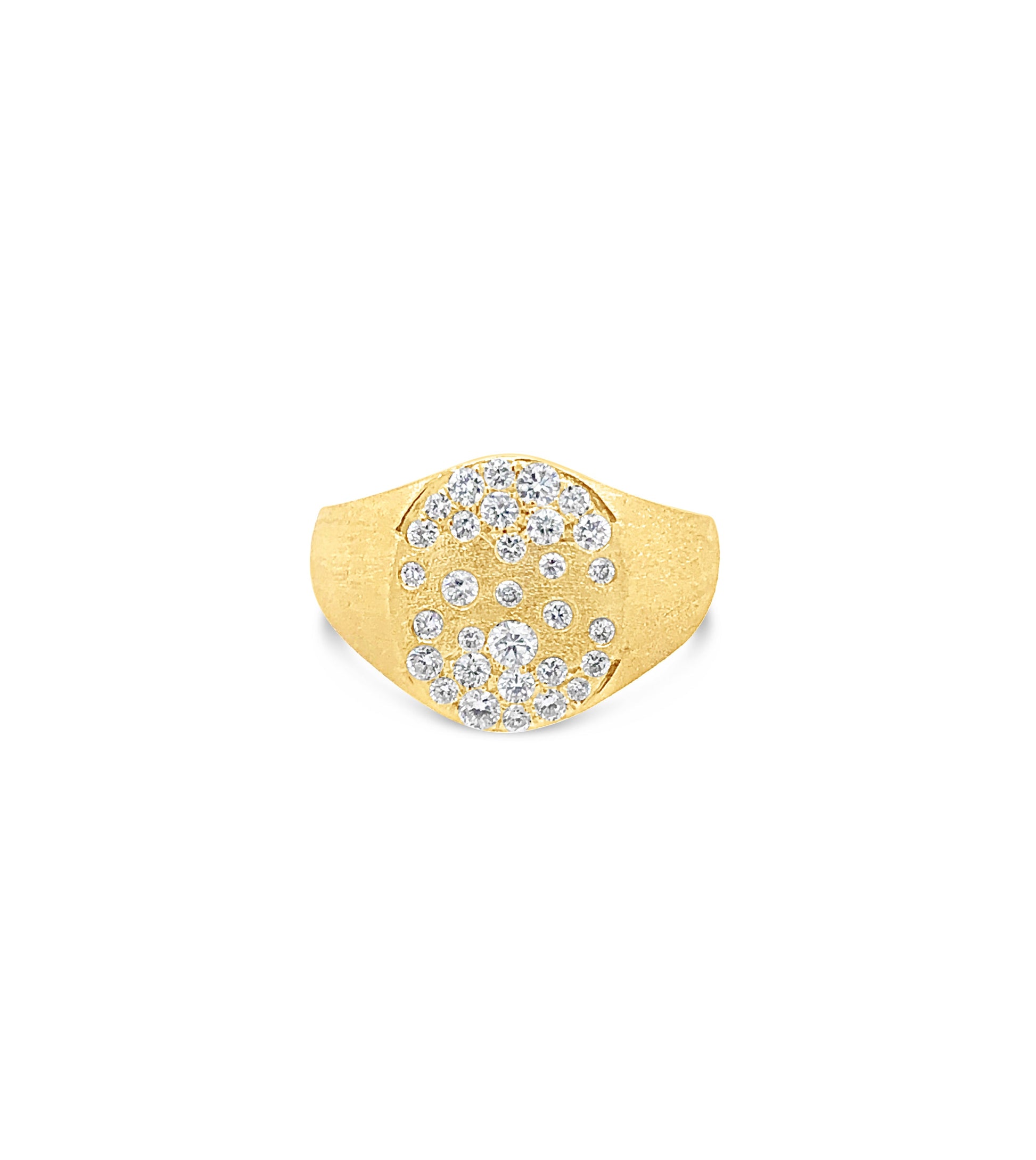 Add a touch of celestial elegance to your style with our Diamond Celestial Signet Ring. Crafted from 18k green gold with a brushed finish, this unique pinky ring sparkles with scattered diamonds. Elevate your look and make a statement with this luxurious and eye-catching piece.